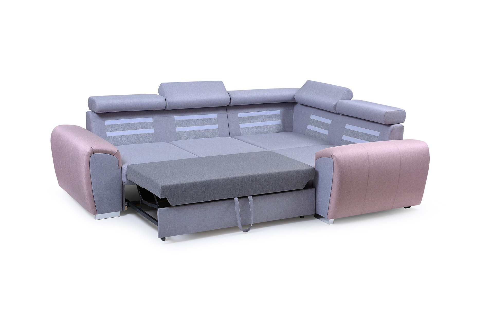 Dvoubarevná rohová sedací souprava WYZ je vysoce estetický design s jemně zaoblenými tvary, který se bude skvěle hodit do prostoru obývacího pokoje nebo moderně zařízeného obývacího pokoje. Rozkládací rohová sedací souprava s bočnicemi stojí na chromových nožkách, které nejenže dodávají nábytku stylový charakter, ale také zajišťují odpovídající stabilitu a odolnost. Rohová sedací souprava WYZ ve tvaru písmene L je k dispozici v pravém nebo levém provedení. Rohová sedací souprava s bočnicemi je vybavena nádobou na lůžkoviny, funkcí spaní a automatickým rozkládáním typu delfín. Rohová pohovka je čalouněná látkou a je k dispozici v široké škále barev, aby vyhovovala individuálním preferencím každého z vás. Představený model WYZ je vybaven nastavitelnými opěrkami hlavy a dekorativními polštáři, které zajistí pohodlí i při několikahodinovém sezení s knihou v ruce nebo při sledování televize. Dřevěný rám je vyplněn vlnitými pružinami a čalounickou pěnou, které se starají o zachování zvýšené pružnosti, takže na nábytku nevznikají nevzhledné deformace. Moderní rohová sedací souprava se vyrábí na objednávku, takže je možné zvolit barvu vložek a celkové barevné provedení.