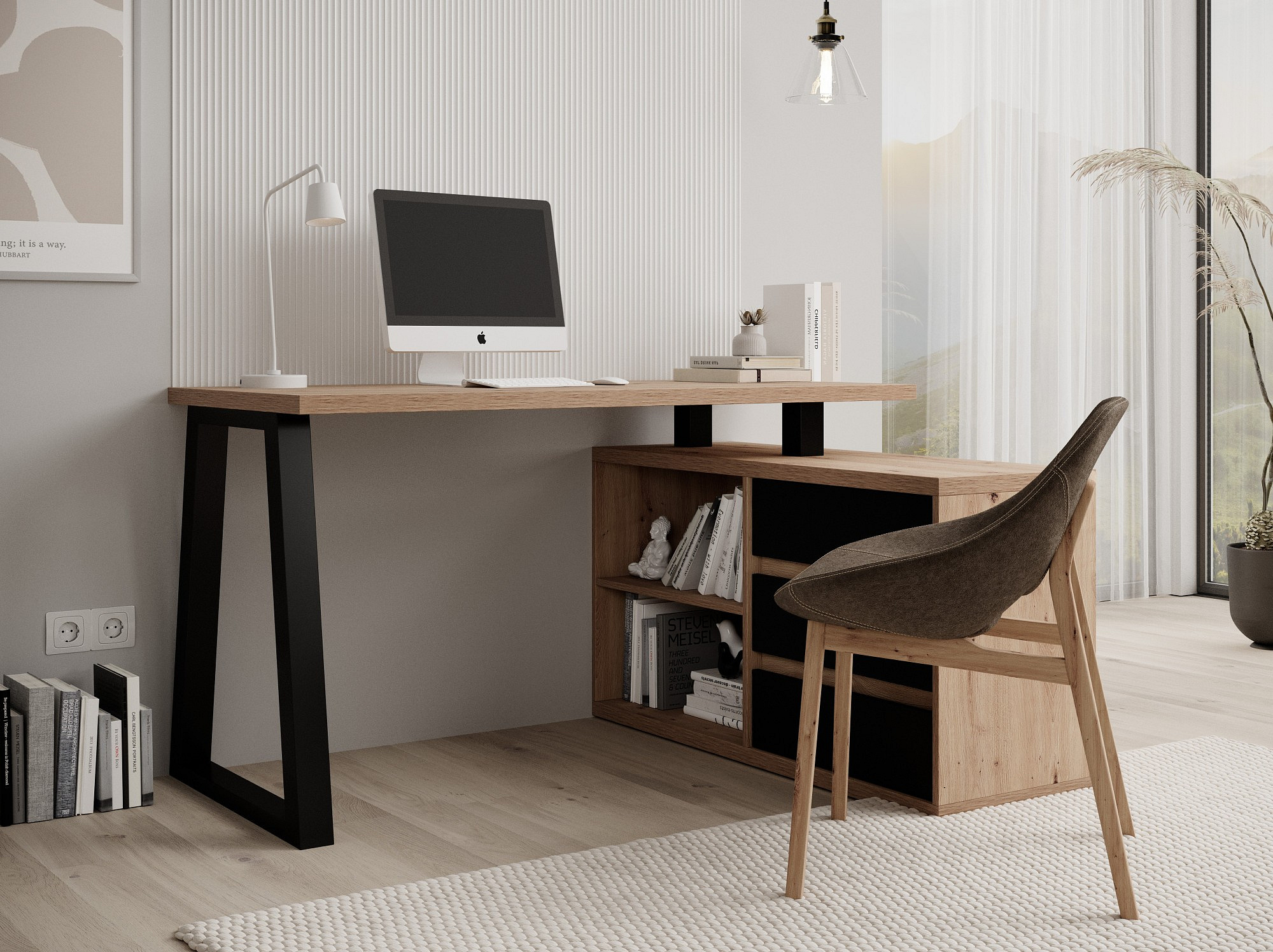Rohový stůl IWO II se ideálně hodí do studentského pokoje, kanceláře nebo pracovny. Díky své rohové konstrukci se vejde i do malých místností. Nábytek je vybaven třemi zásuvkami a prostornou policí, což poskytuje dostatek místa pro uložení kancelářských potřeb. Psací stůl IWO II je praktický a univerzální kus nábytku, který se jistě hodí do většiny interiérů.
