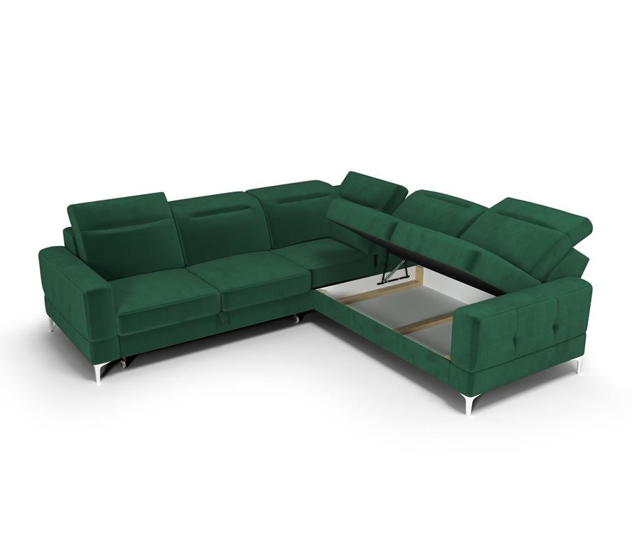 Rohová sedačka má nastavitelné, vícestupňové opěrky hlavy, chromované ozdobné nožky, sedáky s ozdobným prošíváním, které jsou vyrobeny na vlnitých pružinách a vysoce elastické pěně, což zajišťuje vysoký komfort používání a zabraňuje deformaci nejčastěji používaných ploch. Stranu rohové sedačky určuje úložný prostor na lůžkoviny. Kontejner vpravo - pravá strana, kontejner vlevo - levá strana (stojíc čelem k nábytku).