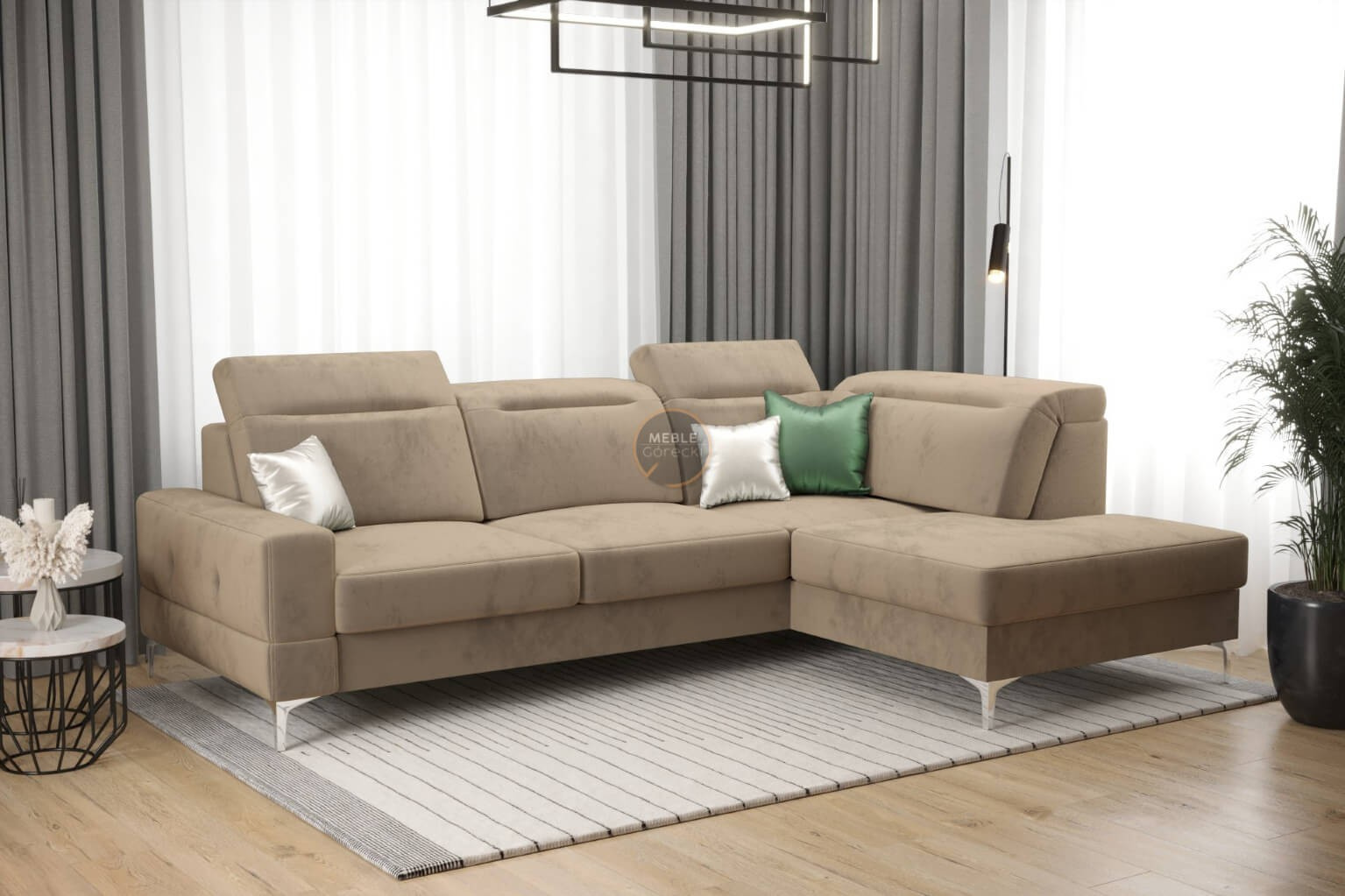 Rohová sedačka má nastavitelné, vícestupňové opěrky hlavy, chromované ozdobné nožky, sedáky s ozdobným prošíváním, které jsou vyrobeny na vlnitých pružinách a vysoce elastické pěně, což zajišťuje vysoký komfort používání a zabraňuje deformaci nejčastěji používaných ploch.