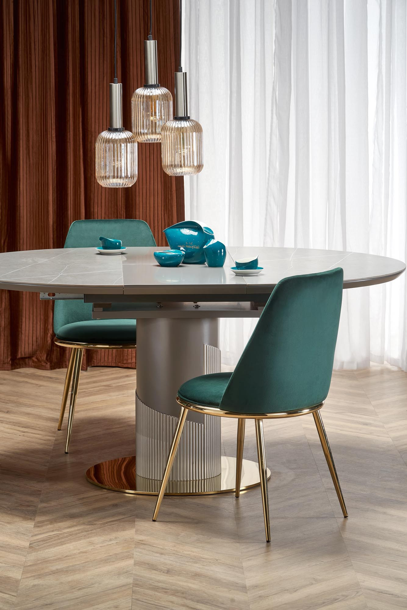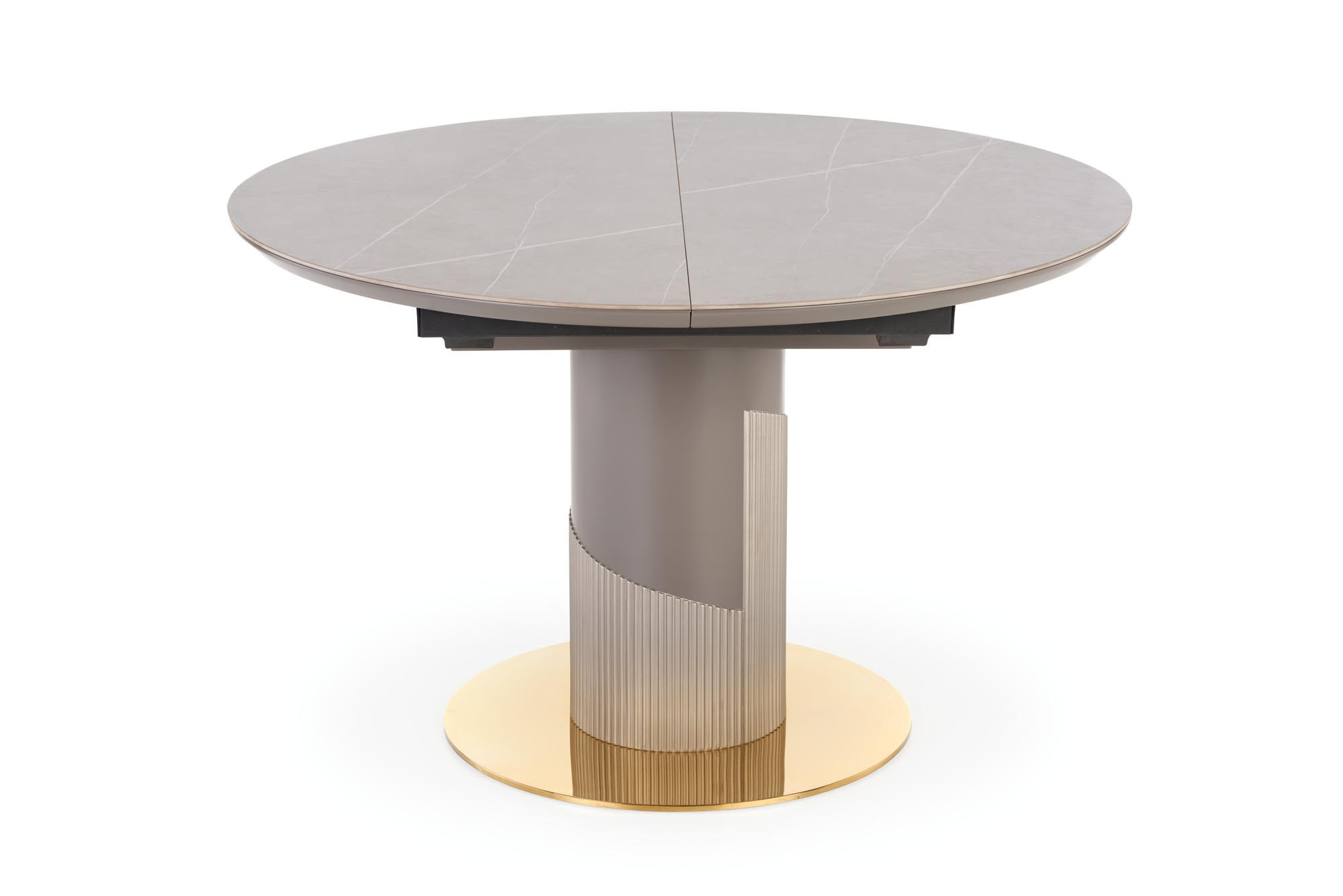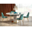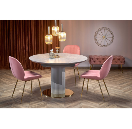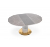 rozměry: 120-160/120/76 cm, materiál: keramika / lakovaná MDF / chromovaná ocel / polypropylen, barva: deska stolu - šedý mramor, noha - světle šedá / zlatá