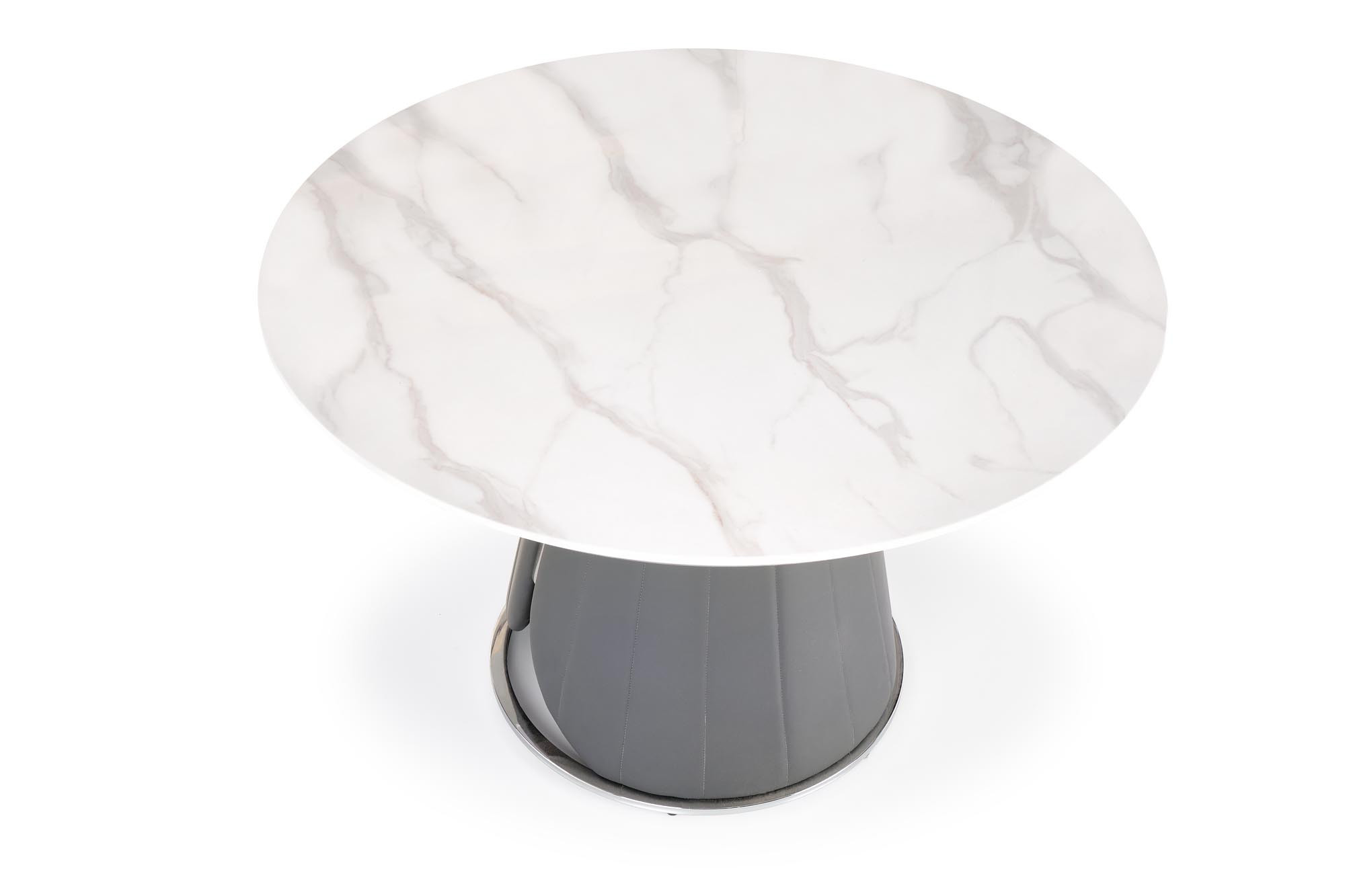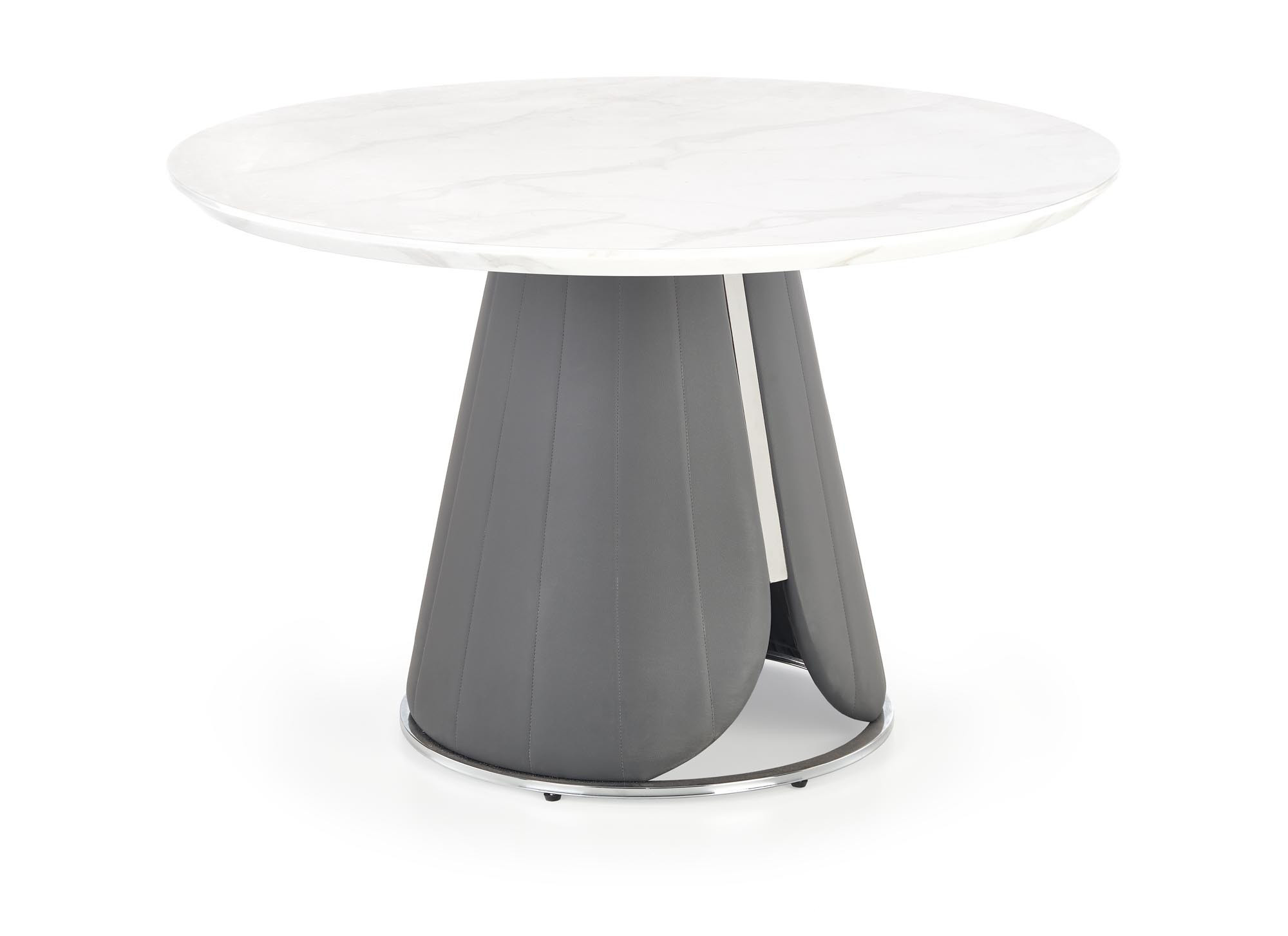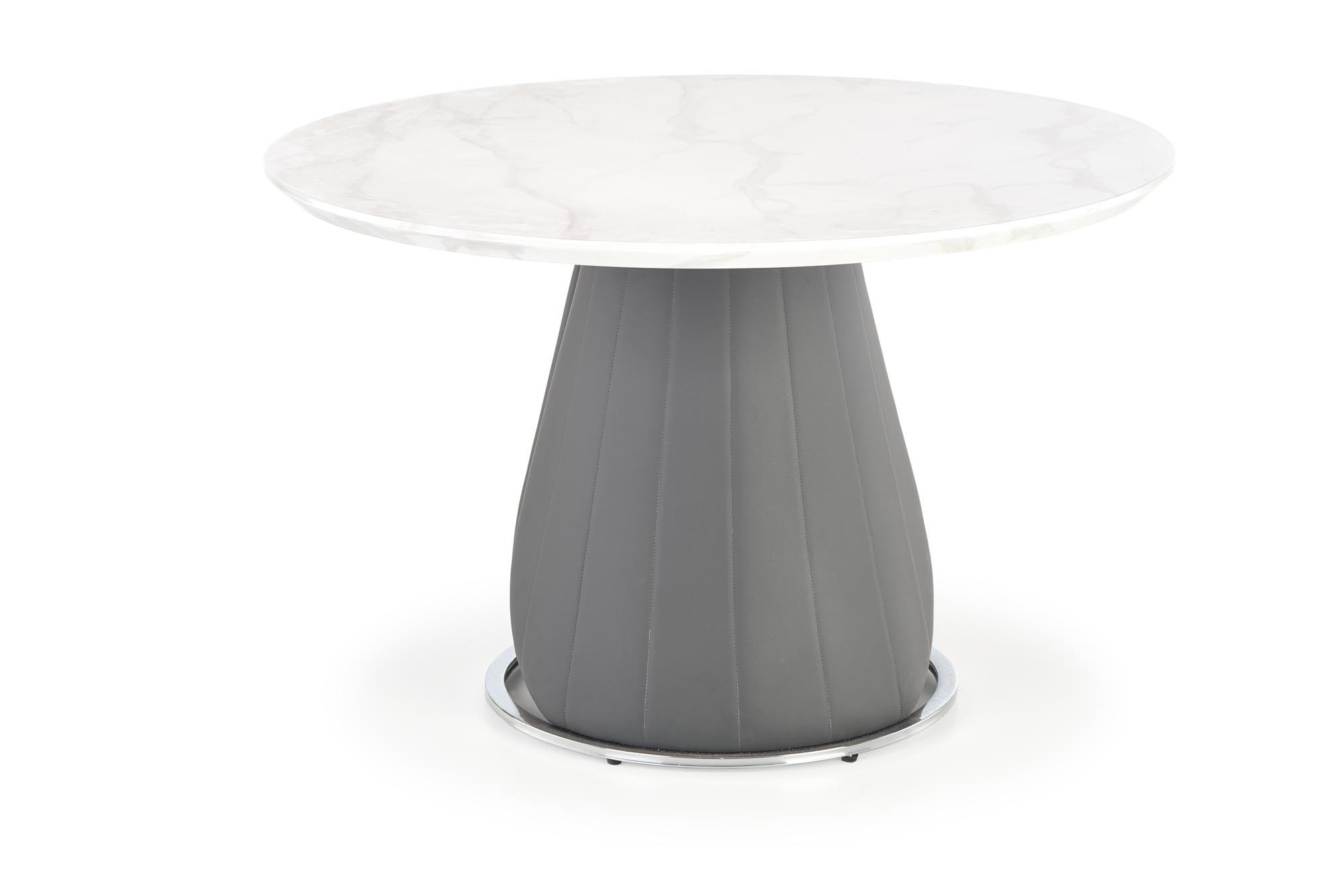 rozměry: fi120/77 cm, materiál: MDF dýha / chromovaná ocel / ekokůže, barva: horní deska - bílý mramor, noha - šedá