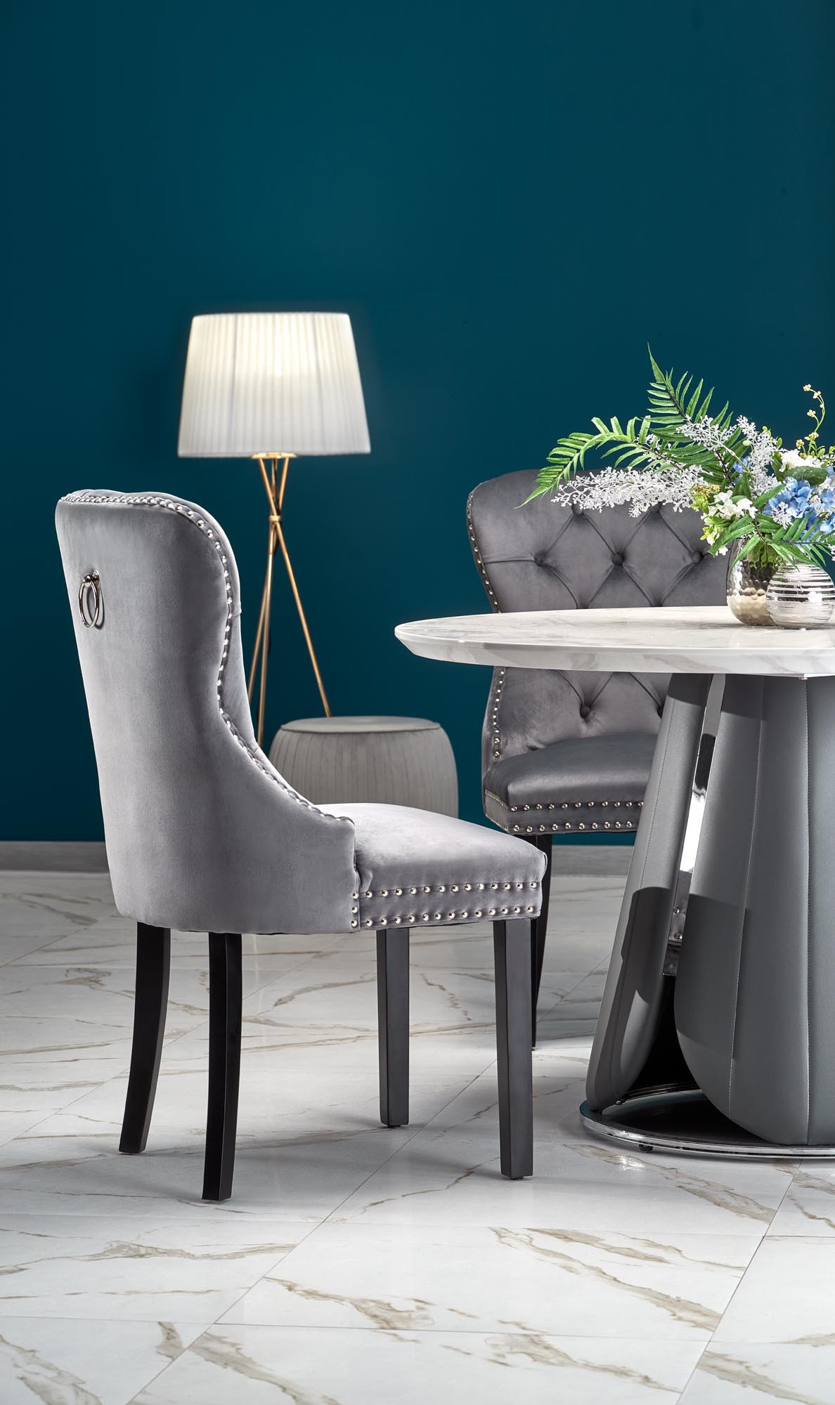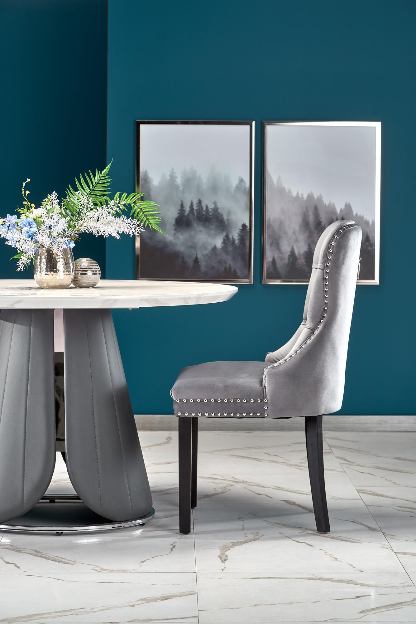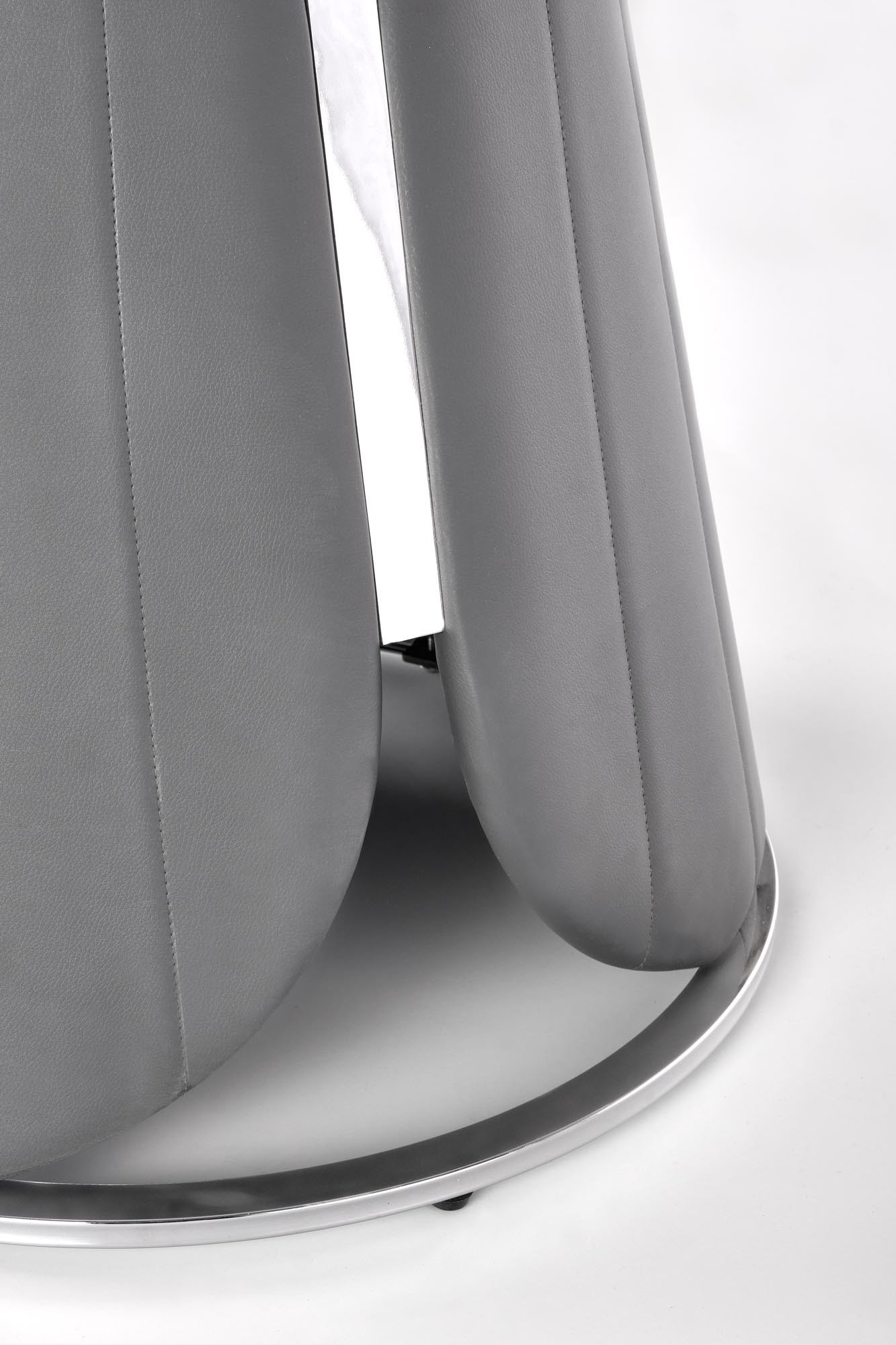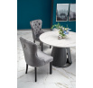 rozměry: fi120/77 cm, materiál: MDF dýha / chromovaná ocel / ekokůže, barva: horní deska - bílý mramor, noha - šedá