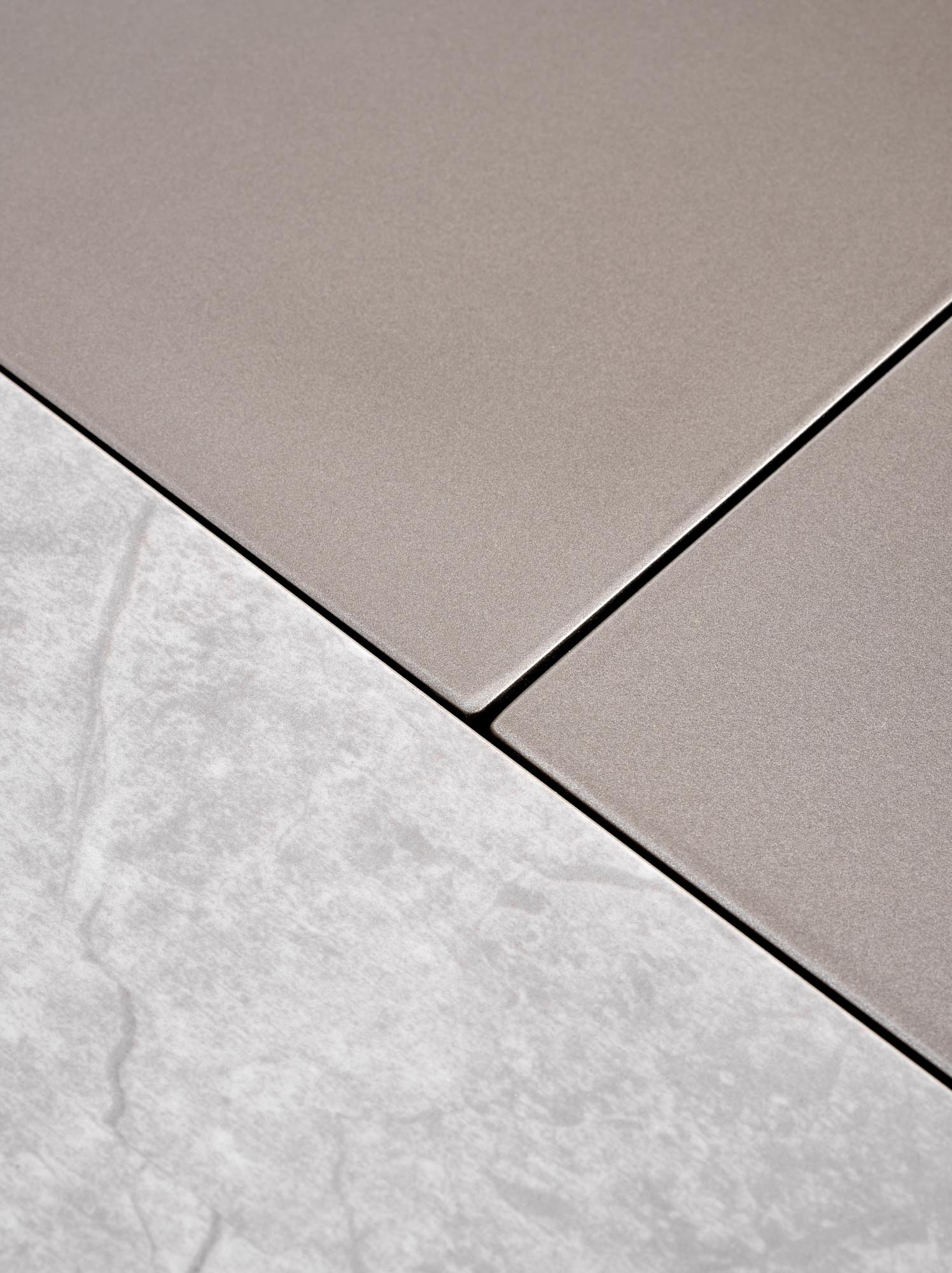 rozměry: 160-220/90/76 cm, rozkládací stůl, materiál: keramika / lakovaná MDF / chromovaná ocel, barva: deska - bílý mramor, noha - světle šedá / zlatá