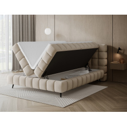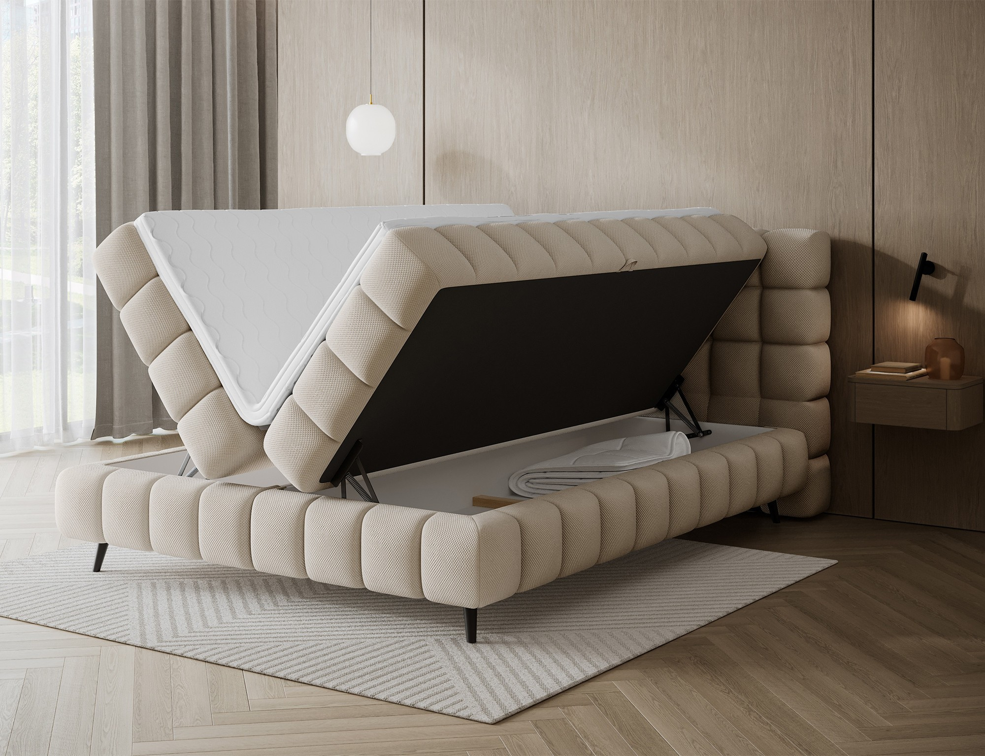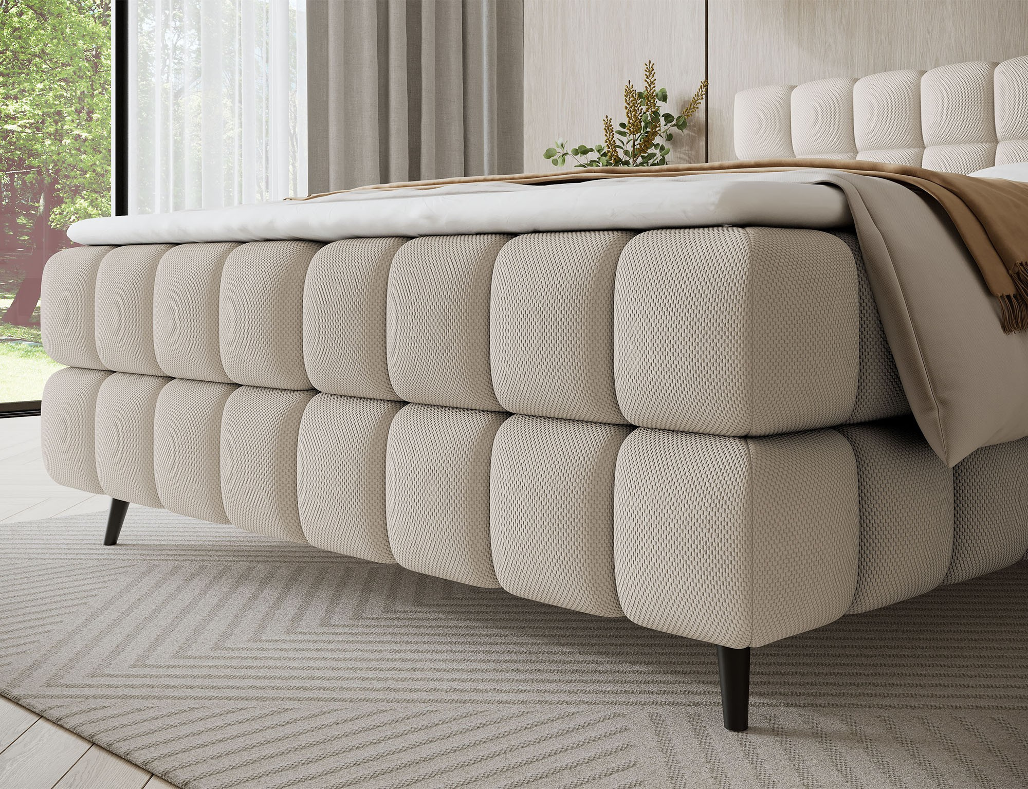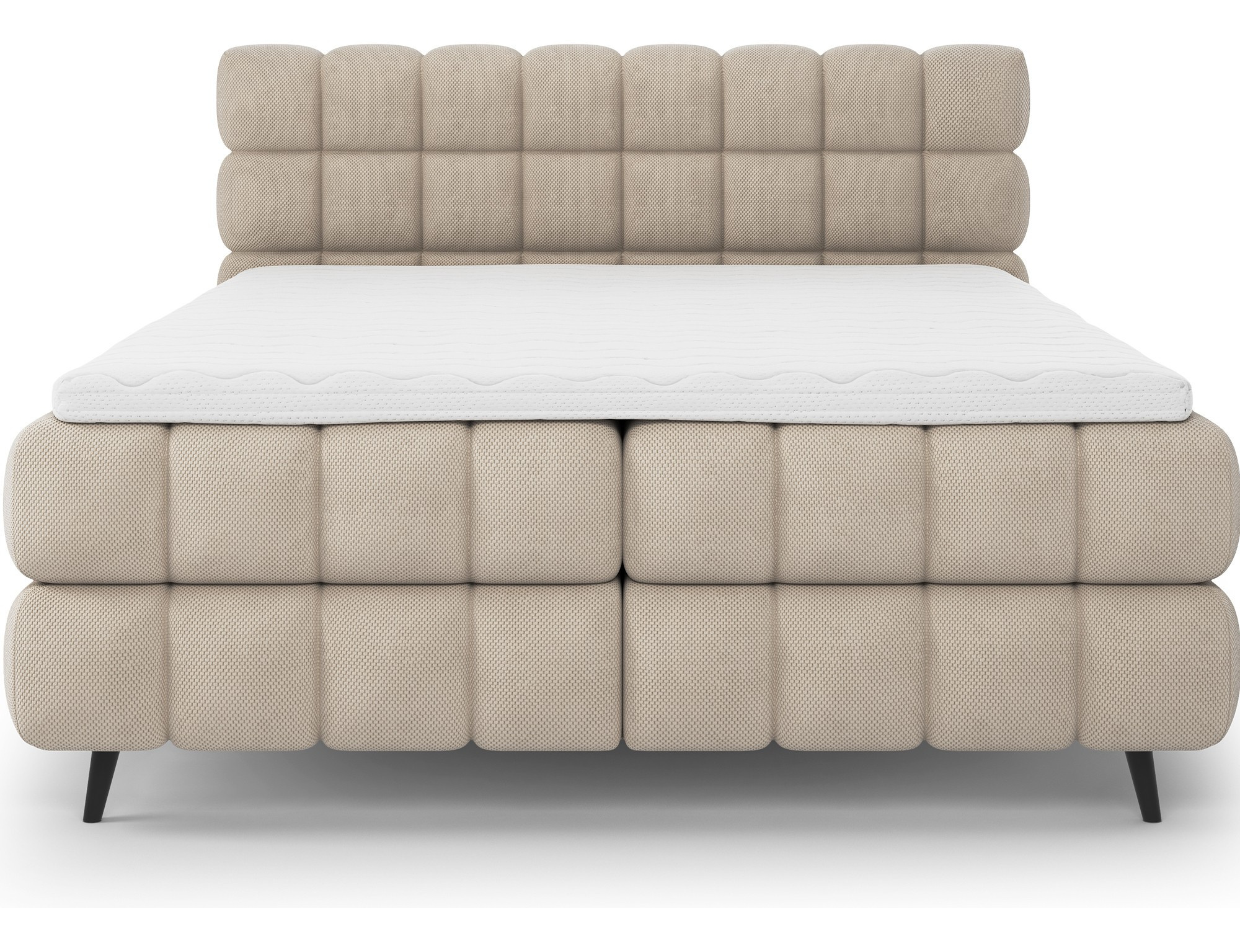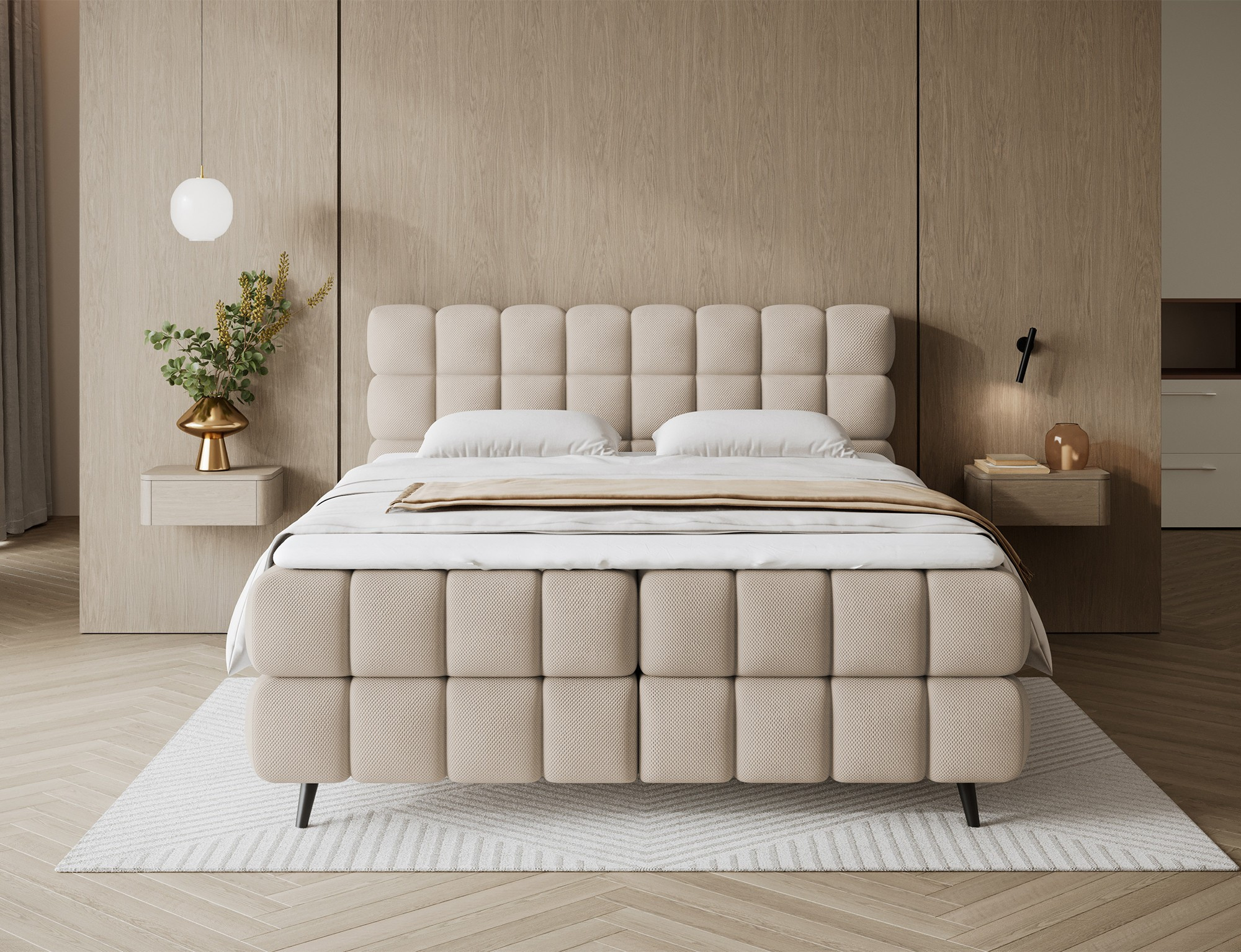 Kontinentální postel Sabeno je elegantní a funkční volbou pro každou moderní ložnici. Model je k dispozici ve třech velikostních variantách: 140x200 cm, 160x200 cm a 180x200 cm, což vám umožňuje přizpůsobit šířku postele vašim individuálním potřebám. Celková výška konstrukce je 111 cm a hloubka je 222 cm, což posteli dodává stabilní a impozantní vzhled. Pohodlí při spánku zajišťuje kombinace Bonellových pružin a pěny T2540, které poskytují správnou oporu a odolnost. Postel Sabeno je vybavena praktickým úložným prostorem na lůžkoviny, který pomáhá udržet vaši ložnici uspořádanou. Černé dřevěné nohy nábytku dokončují celkový design, přidávají jemnou eleganci a lehkost. Moderní styl Sabeno z něj činí ideální volbu jak pro minimalistické, tak pro výraznější interiérové uspořádání. Díky své funkčnosti, vysoce kvalitním materiálům a estetickému provedení je kontinentální postel Sabeno ideální volbou pro ty, kteří si cení pohodlí, odolnosti a stylového nábytku do ložnice.
