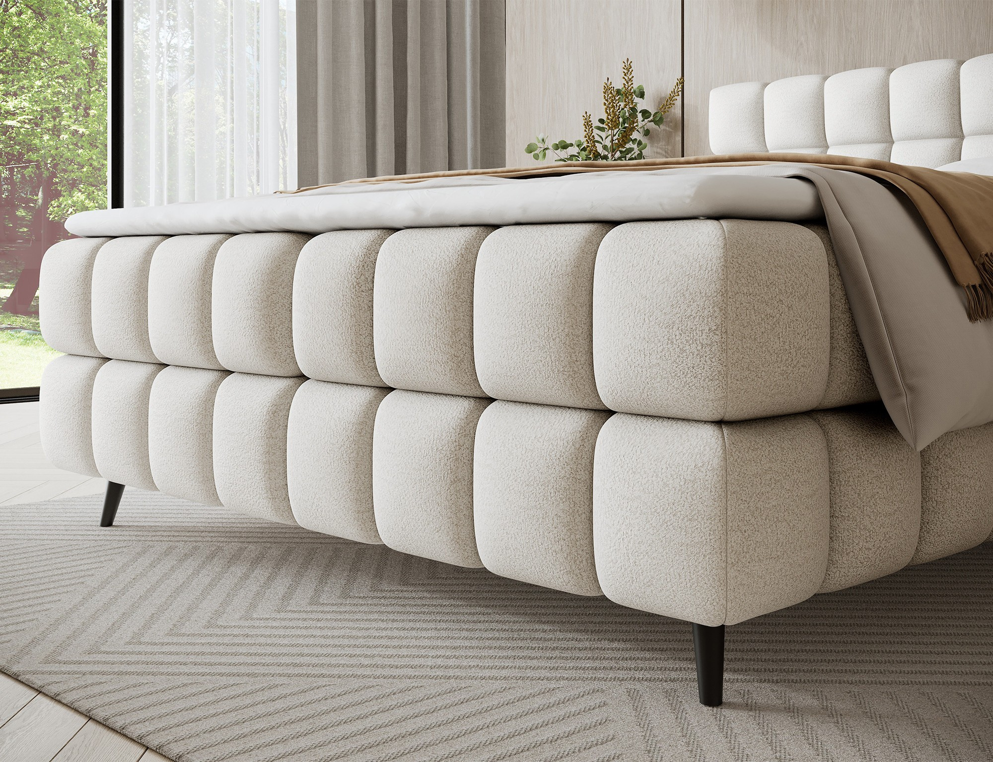 Kontinentální postel Sabeno je elegantní a funkční volbou pro každou moderní ložnici. Model je k dispozici ve třech velikostních variantách: 140x200 cm, 160x200 cm a 180x200 cm, což vám umožňuje přizpůsobit šířku postele vašim individuálním potřebám. Celková výška konstrukce je 111 cm a hloubka je 222 cm, což posteli dodává stabilní a impozantní vzhled. Pohodlí při spánku zajišťuje kombinace Bonellových pružin a pěny T2540, které poskytují správnou oporu a odolnost. Postel Sabeno je vybavena praktickým úložným prostorem na lůžkoviny, který pomáhá udržet vaši ložnici uspořádanou. Černé dřevěné nohy nábytku dokončují celkový design, přidávají jemnou eleganci a lehkost. Moderní styl Sabeno z něj činí ideální volbu jak pro minimalistické, tak pro výraznější interiérové uspořádání. Díky své funkčnosti, vysoce kvalitním materiálům a estetickému provedení je kontinentální postel Sabeno ideální volbou pro ty, kteří si cení pohodlí, odolnosti a stylového nábytku do ložnice.