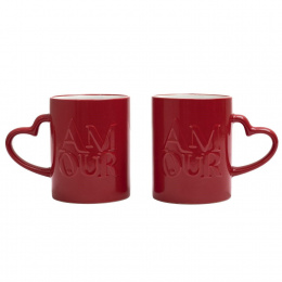 Romantická sada dvou hrnků s uchem ve tvaru srdce je nezbytností letošního Valentýna nebo výročí svatby! Sada dvou hrnků s nápisem Amour dodá pikantnost při večerním horkém čaji ve dvou. Hrníčky o objemu 300 ml jsou sadou, která k sobě ladí a tvoří ideální doplněk pro domácí rande ve dvou. Hrníčky vyrobené z keramiky. Lze je mýt v myčce. Lze používat v mikrovlnné troubě.