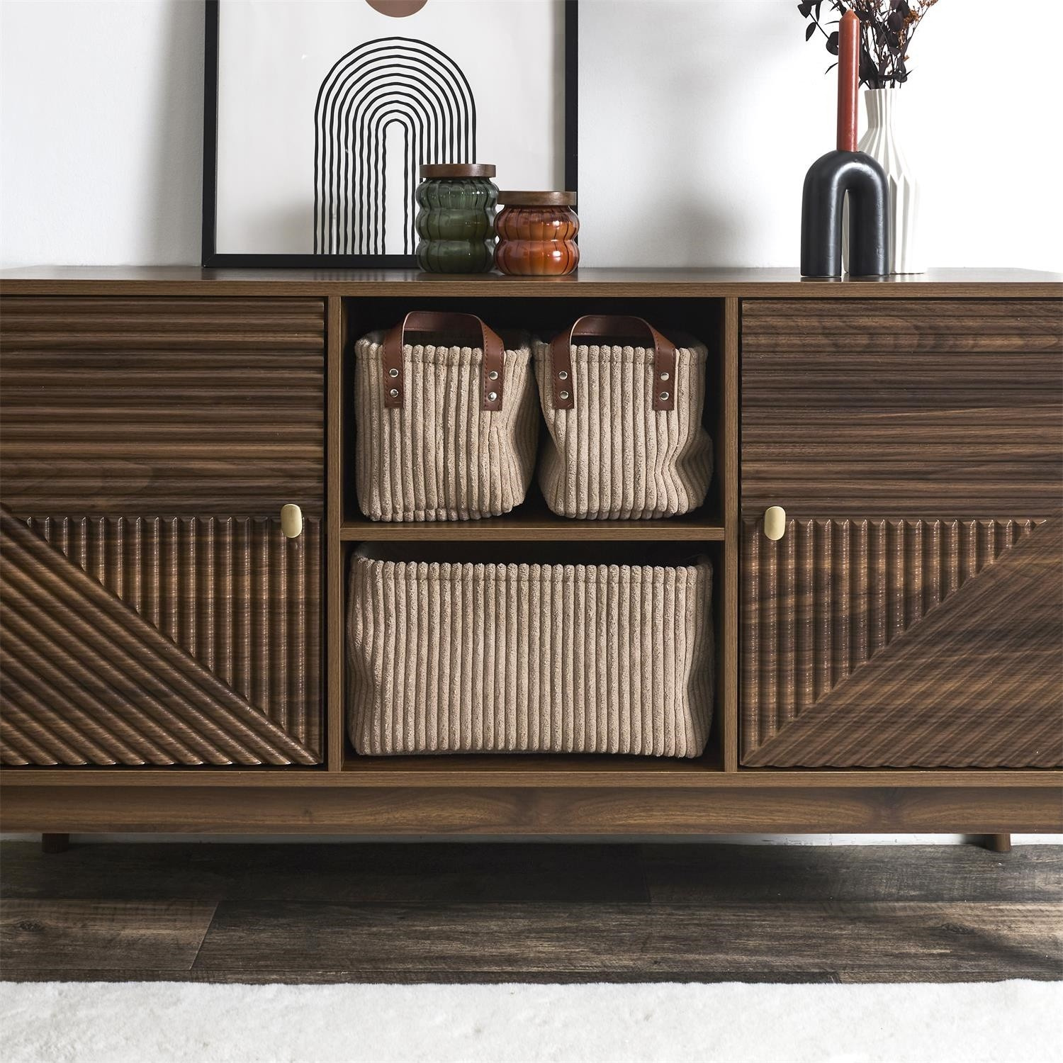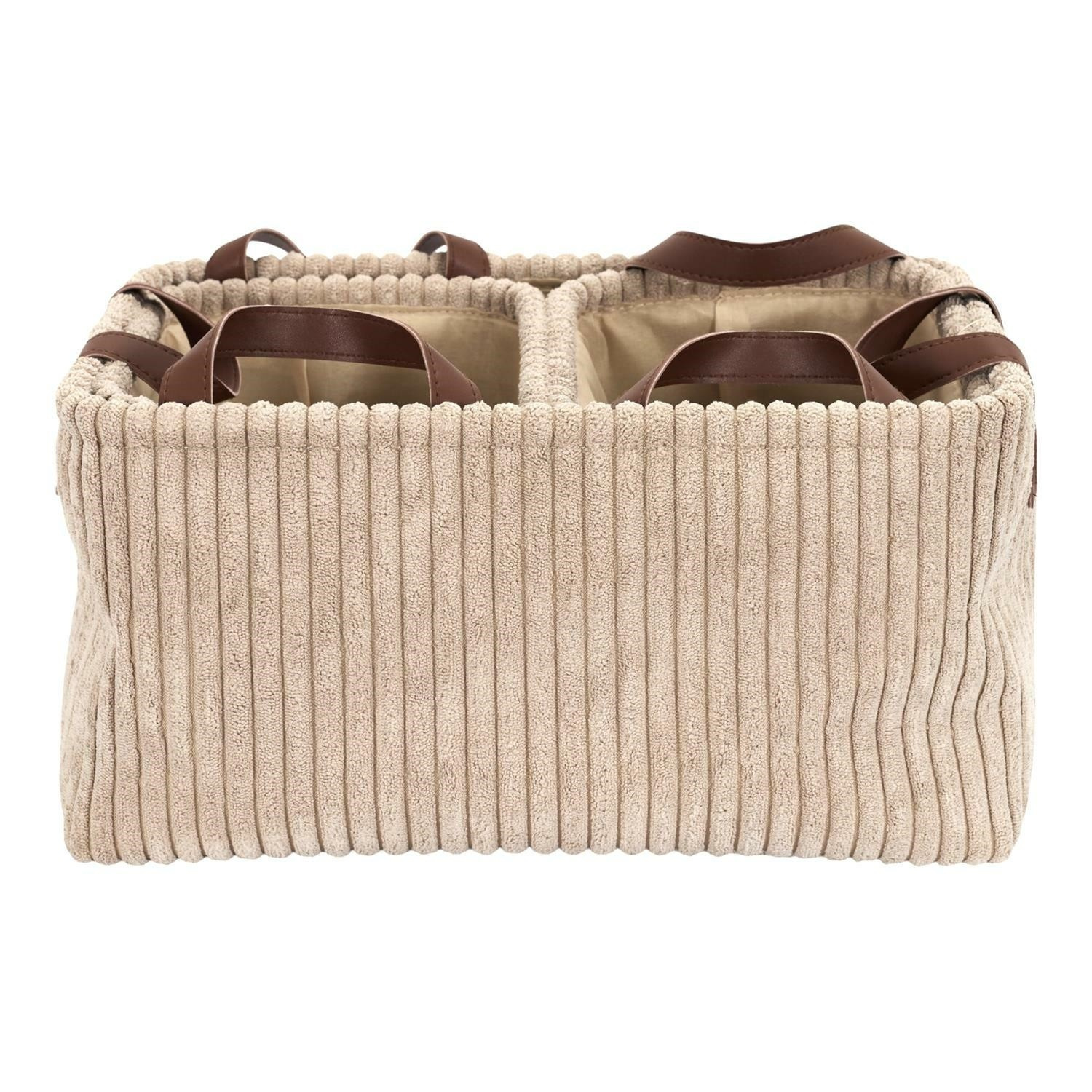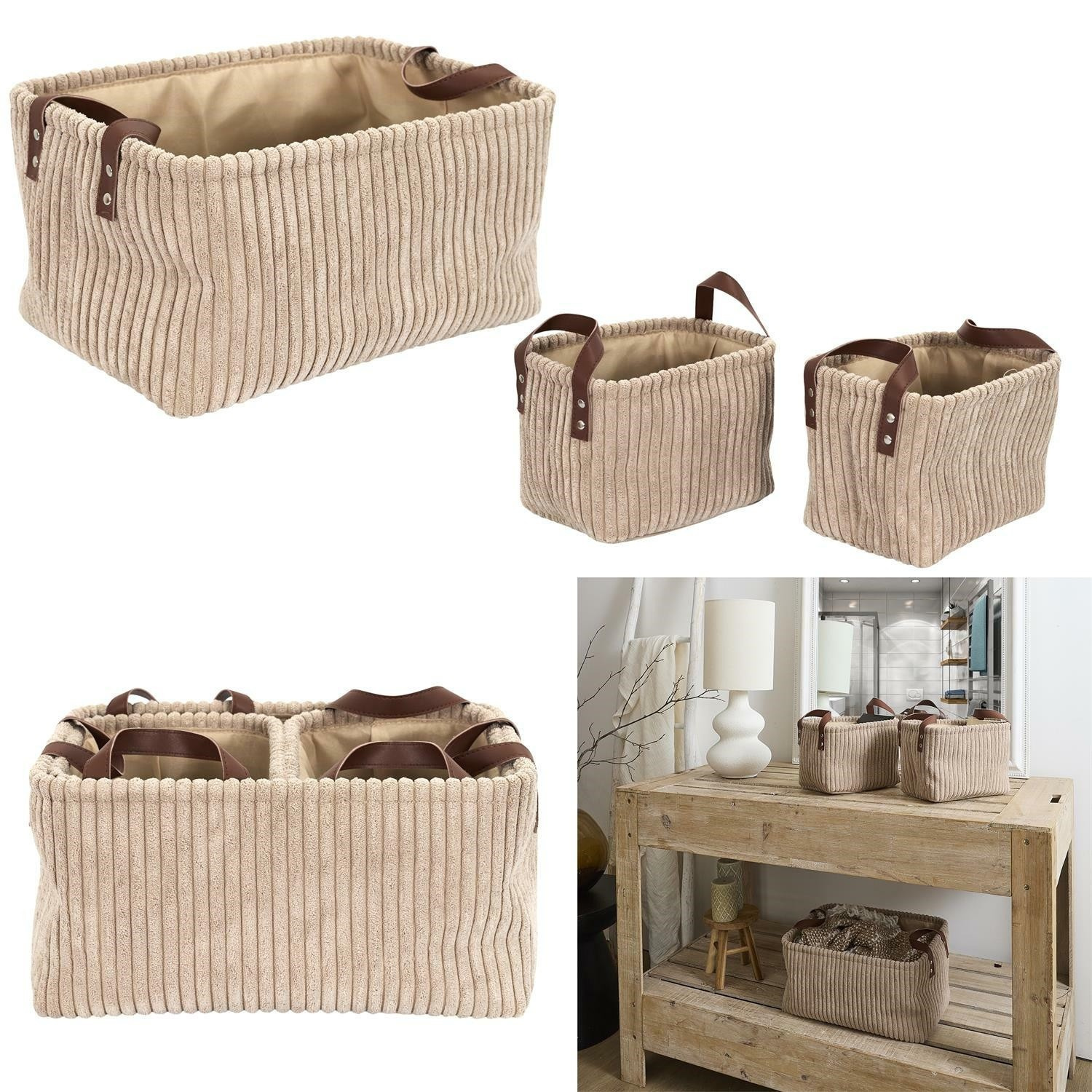 Sada 3 košů z manšestrové tkaniny je ideální dekorací i prvkem pro organizaci prostoru. Rozměry velkého koše: 20x36x26cm a dva menší o rozměru 16x24x19cm