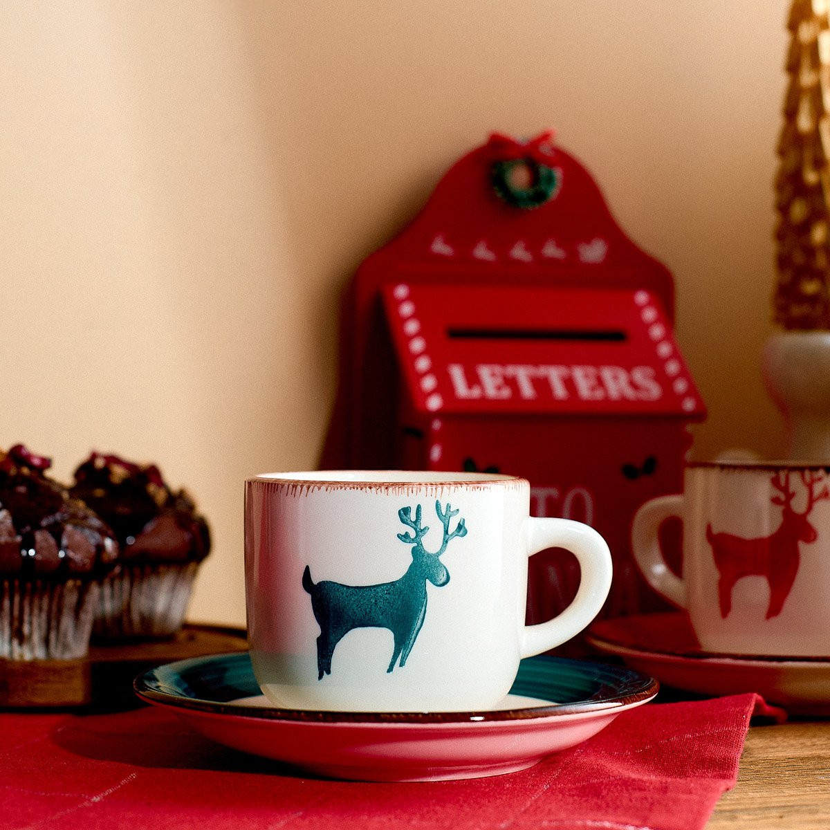 Okouzlující šálek ve svátečním stylu vyniká svým minimalistickým, ale výrazným modrým motivem soba. Vyrobeno z kameniny, mísa má výrazné rustikální kouzlo. Jemný hnědý okraj na okrajích šálku a podšálku dodává šálku teplo a přirozenost, což se dokonale hodí k zimní atmosféře.