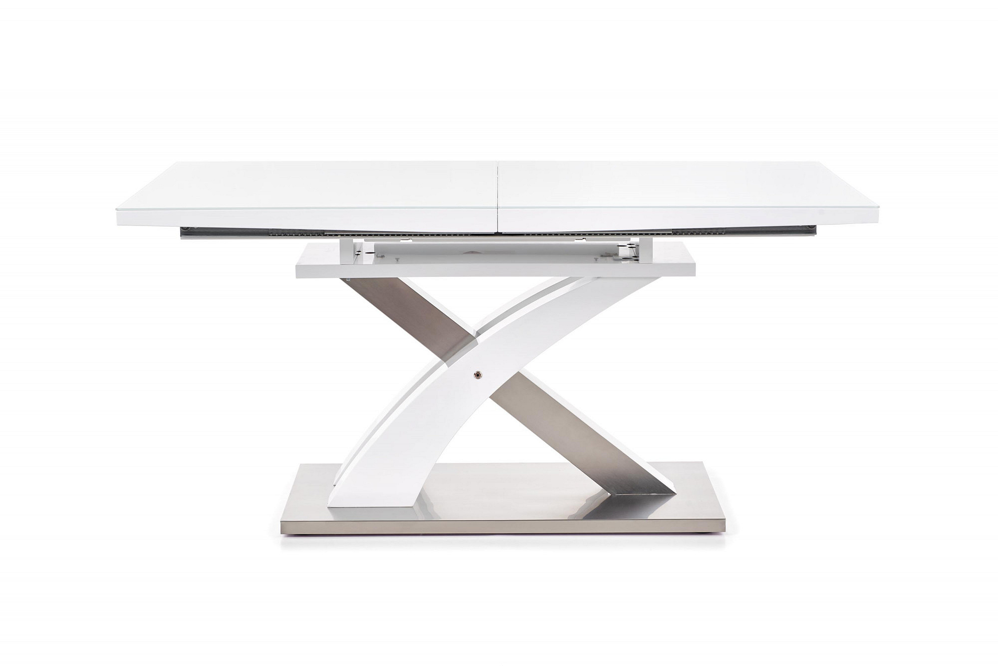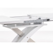 rozkládací stůl, rozměry: 160÷220/90/78 cm, materiál: sklo / lakovaná MDF / nerezová ocel, barva: sklo - extra bílá, MDF - bílá