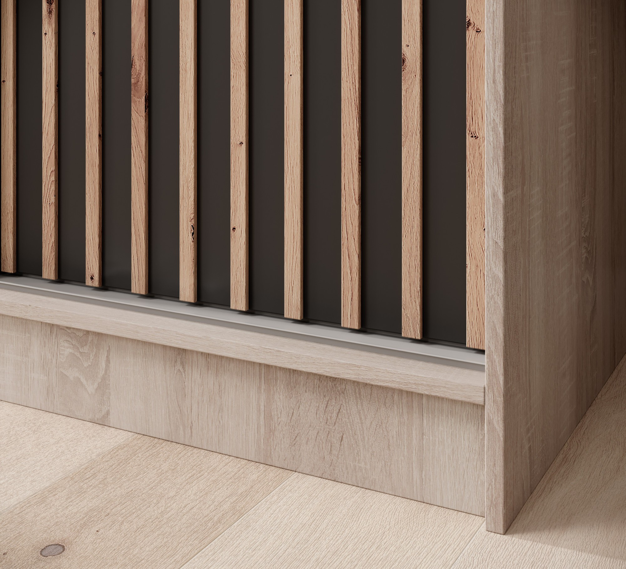 Šatní skříň s posuvnými dveřmi Ida 200 se zrcadlem a lamelami je moderní a stylové řešení pro osoby, které si cení jak funkčnosti, tak estetiky. Se šířkou 200 cm je tato skříň ideální pro prostorné ložnice, předsíně nebo šatny, nabízí velkou kapacitu pro uložení oblečení a doplňků. Jej posuvné dveře zajišťují pohodlné používání i v menších místnostech a centrálně umístěné zrcadlo plní dvojí funkci – opticky zvětšuje prostor a usnadňuje každodenní přípravy. Další výhodou jsou stylové lamely, které zdobí čelo skříně, dodávají jí elegantní charakter a modernost. Tyto dřevěné akcenty vnášejí do interiéru teplo a útulnost, dokonale se hodí k různým stylům aranžmá – od minimalistických po více klasické. Vnitřek skříně byl navržen s ohledem na maximální funkčnost, obsahuje praktické police a tyče na ramínka, které umožňují ukládání oděvů organizovaným způsobem. Solidní provedení a vysoce kvalitní materiály zajišťují trvanlivost a spolehlivost, což činí skříň Ida 200 investicí na léta.