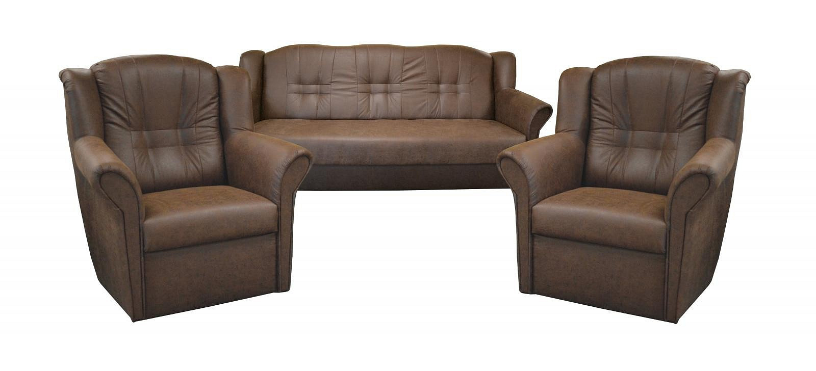 Agata je stále velmi oblíbeným klasickým modelem sedací soupravy v provedení 3F+1+1. Je velmi pohodlná a zároveň praktická. Sedací souprava je rozkládací a samozřejmostí je i úložný prostor. Jednoduchým rozkladem pomocí systému "klik klak" vznikne lůžko k příležitostnému přespání Vaší návštěvy. Sedací souprava je potažena kvalitní látkou a nabízíme ji v několika barvách, ze kterých si určitě vyberete tu nejvhodnější pro Váš obývací pokoj. Výpň sedáků tvoří pružiny v kombinaci s kvalitní PUR pěnou. Tato kombinace zajistí velmi pohodlné sezení. Cena sedací soupravy je uvedena za rozkládací trojsed a dvě křesla. Sedací souprava je potažena látkou, která imituje kůži. Látka je odolná a velmi lehce se udržuje. Zobrazení barev na fotograii se může od skutečnosti lišit.
