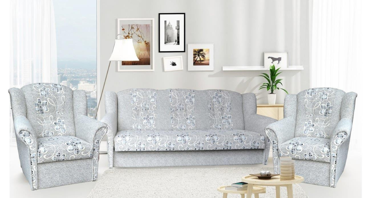 Klasická rozkládací sedací souprava vhodná také do menších bytů. Sedací souprava má praktický úložný prostor a jednoduchým rozkladem vznikne lůžko vhodné k příležitostnému spaní. Sedací souprava je pružinová v kombinaci s kvalitní PUR pěnou. Sedací souprava se skládá z rozkládacího trojsedu a dvou křesel. Tato sedačka je očalouněná kvalitní potahovou látkou, snadno čistitelnou suchou pěnou.