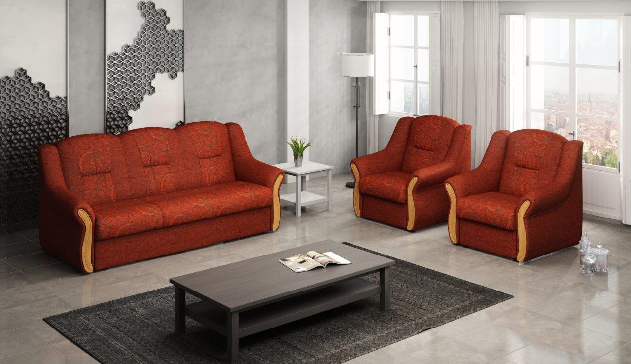 Sedací souprava Alice je stále velmi oblíbeným klasickým modelem sedací soupravy v provedení 3F+1+1. Je velmi pohodlná a zároveň praktická. Sedací souprava je rozkládací a samozřejmostí je i úložný prostor. Jednoduchým rozkladem pomocí systému "klik klak" vznikne lůžko k příležitostnému přespání Vaší návštěvy. Pohodlí při sezení poskytuje kvalitní výplň sedáků, ktrou tvoří kombinace pružin bonell s vlnitými pružinami a PUR pěnou. Sedací souprava je potažena kvalitní látkou, v kombinaci vzoru a jednobarevné látky. Sedací soupravu nabízíme v několika odstínech a také v provedení 3F+2+1. Cena sedací soupravy je uvedena za rozkládací trojsed a dvě křesla. Vyobrazené doplňky a dekorace nejsou v ceně. Zobrazení barev potahové látky a dřeva na fotograii se může nepatrně od skutečnosti lišit.