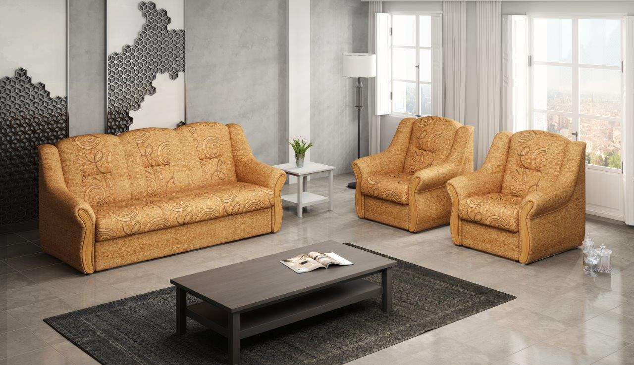 Sedací souprava Alice je stále velmi oblíbeným klasickým modelem sedací soupravy v provedení 3F+1+1. Je velmi pohodlná a zároveň praktická. Sedací souprava je rozkládací a samozřejmostí je i úložný prostor. Jednoduchým rozkladem pomocí systému "klik klak" vznikne lůžko k příležitostnému přespání Vaší návštěvy. Pohodlí při sezení poskytuje kvalitní výplň sedáků, ktrou tvoří kombinace pružin bonell s vlnitými pružinami a PUR pěnou. Sedací souprava je potažena kvalitní látkou, v kombinaci vzoru a jednobarevné látky. Sedací soupravu nabízíme v několika odstínech a také v provedení 3F+2+1. Cena sedací soupravy je uvedena za rozkládací trojsed a dvě křesla. Vyobrazené doplňky a dekorace nejsou v ceně. Zobrazení barev potahové látky a dřeva na fotograii se může nepatrně od skutečnosti lišit.