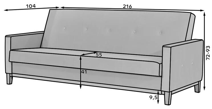 S šířkou 216 cm, výškou 93 cm a hloubkou 87 cm nabízí pohovka SELENE dostatek prostoru pro pohodlné sezení i relaxaci. Výška sedu 41 cm je ideální pro pohodlné vstávání a sezení, což oceníte při každodenním používání. I když pohovka není rozkládací, její plocha na spaní 110 x 195 cm poskytuje dostatek místa pro příležitostné přespání.
