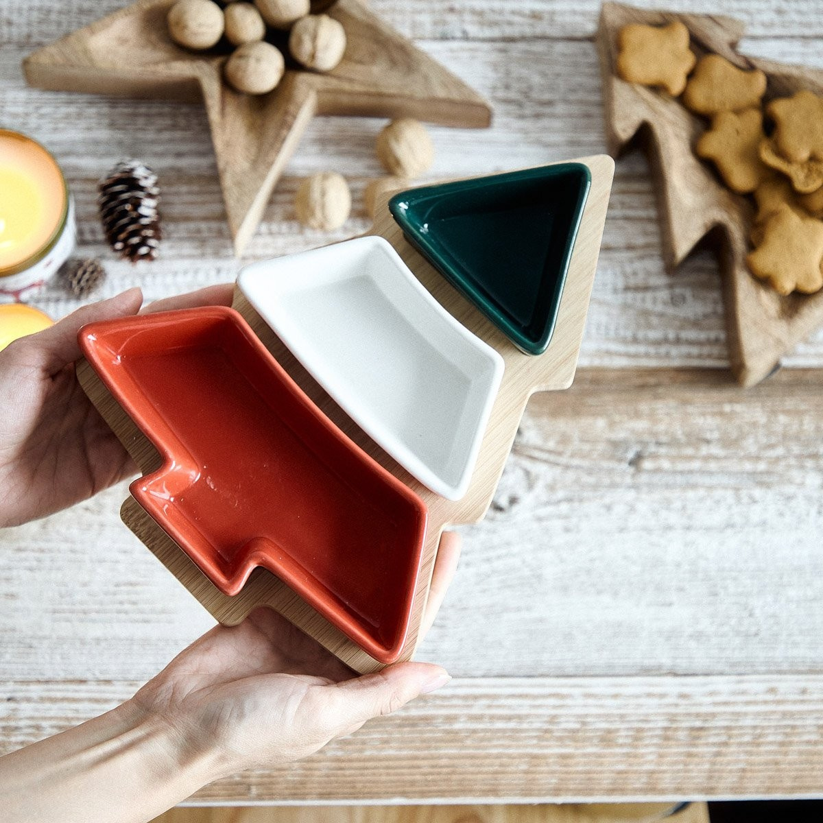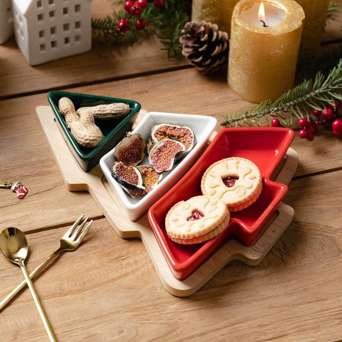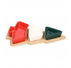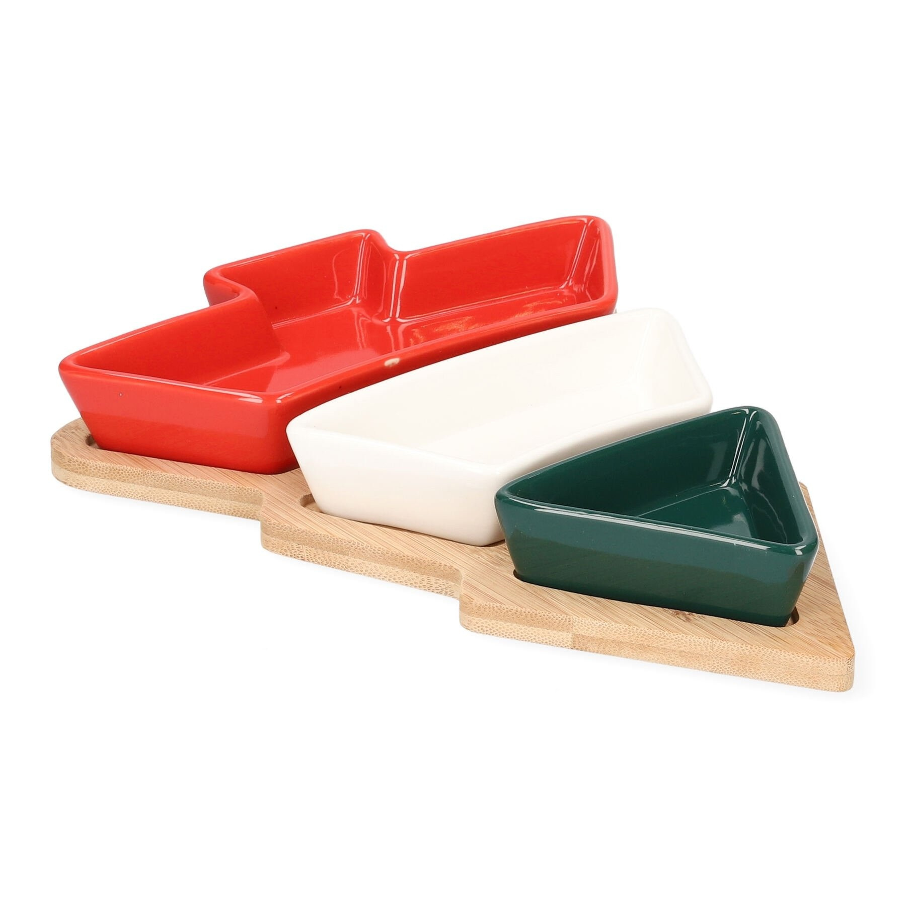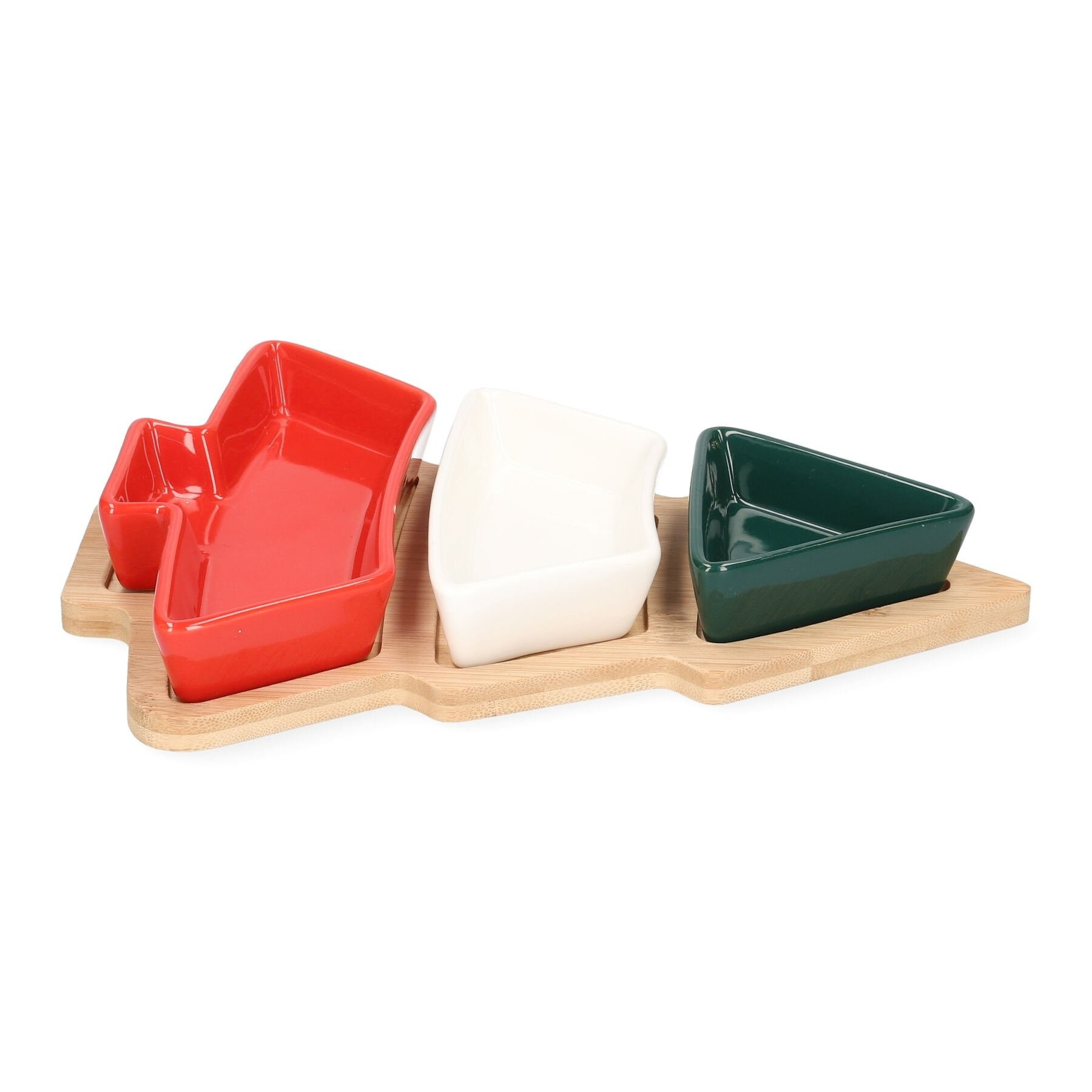 Sada se skládá ze tří mís v červené, bílé a zelené barvě. Uspořádány vedle sebe na bambusovém podnosu, tvoří tvar vánočního stromku o rozměrech 28x21 cm. Stojan je činí pohodlnými k použití a možnost jejich rozložení usnadňuje čištění.