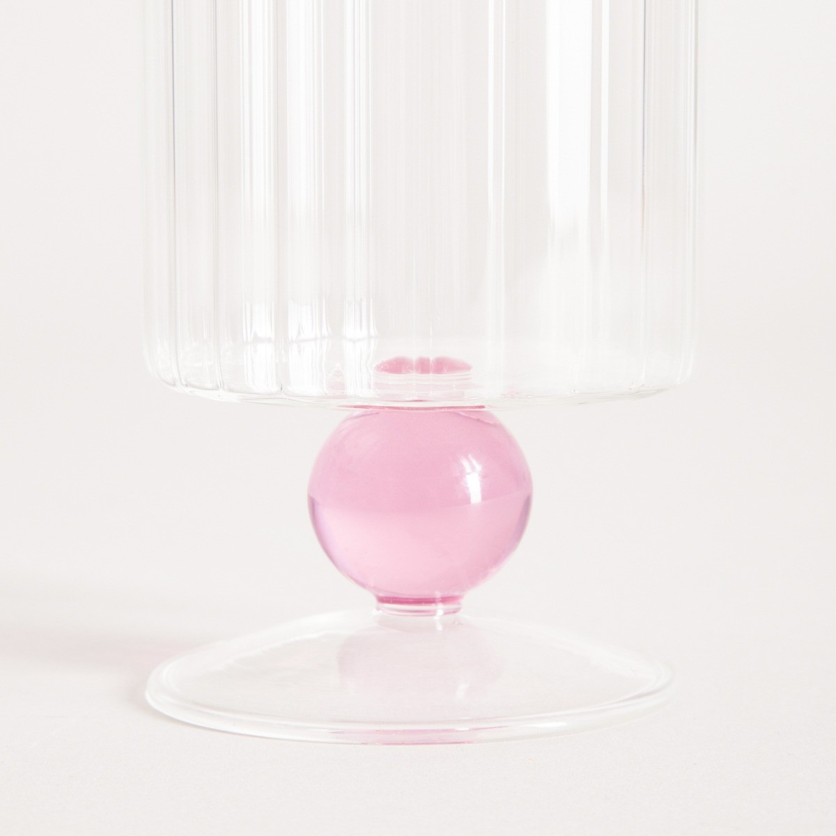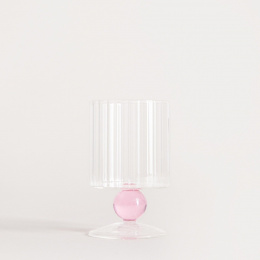 Sklenice FINOM je jedinečnou kombinací jednoduchosti a jemného barevného akcentu. Štíhlý, rýhovaný tvar skla byl zkombinován s ozdobnou růžovou kuličkou u základny, což celku dodává jedinečný charakter.