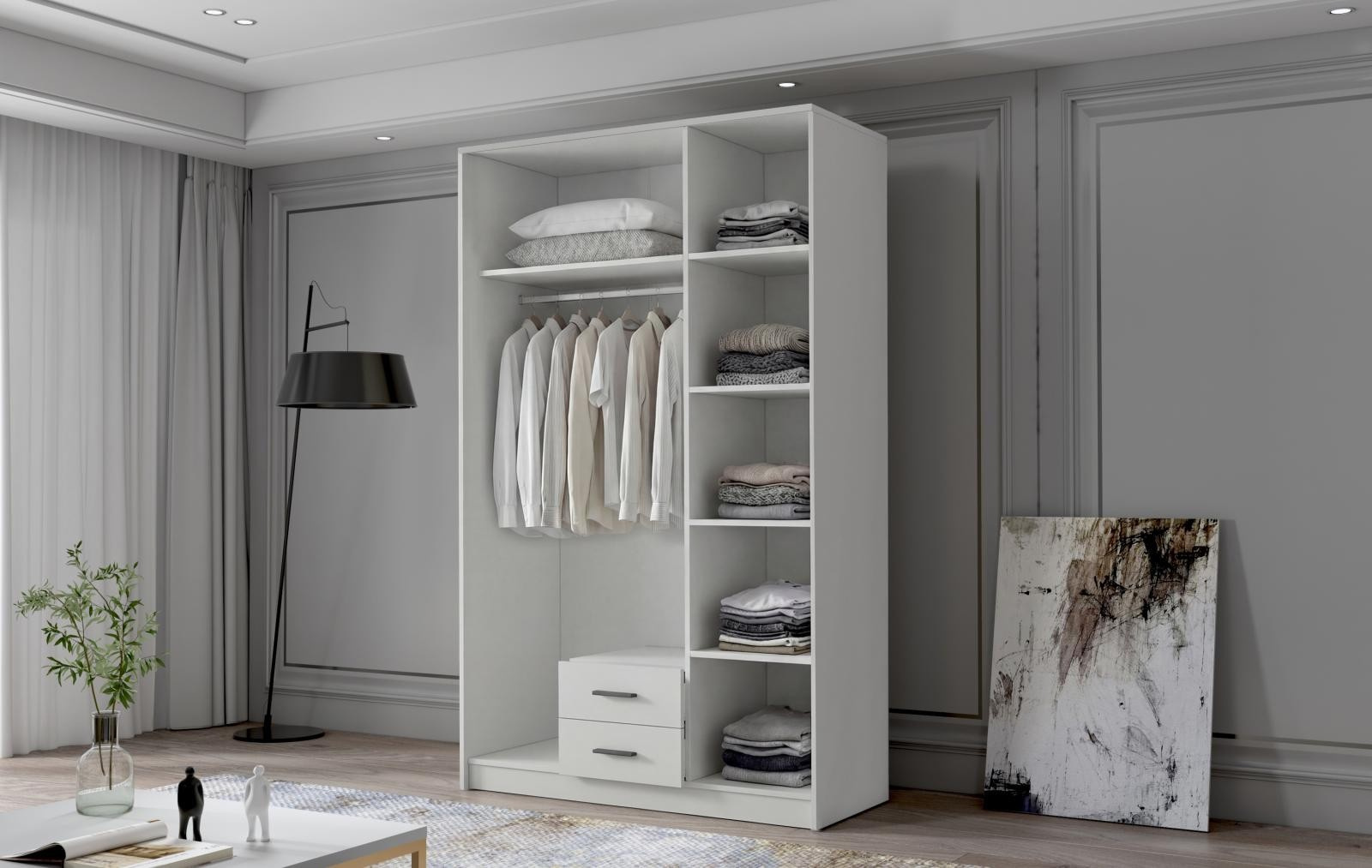 Šatní skříň Arya I v moderním designu má šířku 120 cm a je rozdělena na dvě praktické části. Vnitřní uspořádání kombinuje závěsnou tyč, pět polic a 2 šuplíky, což umožňuje přehledné a praktické rozdělení šatníku.