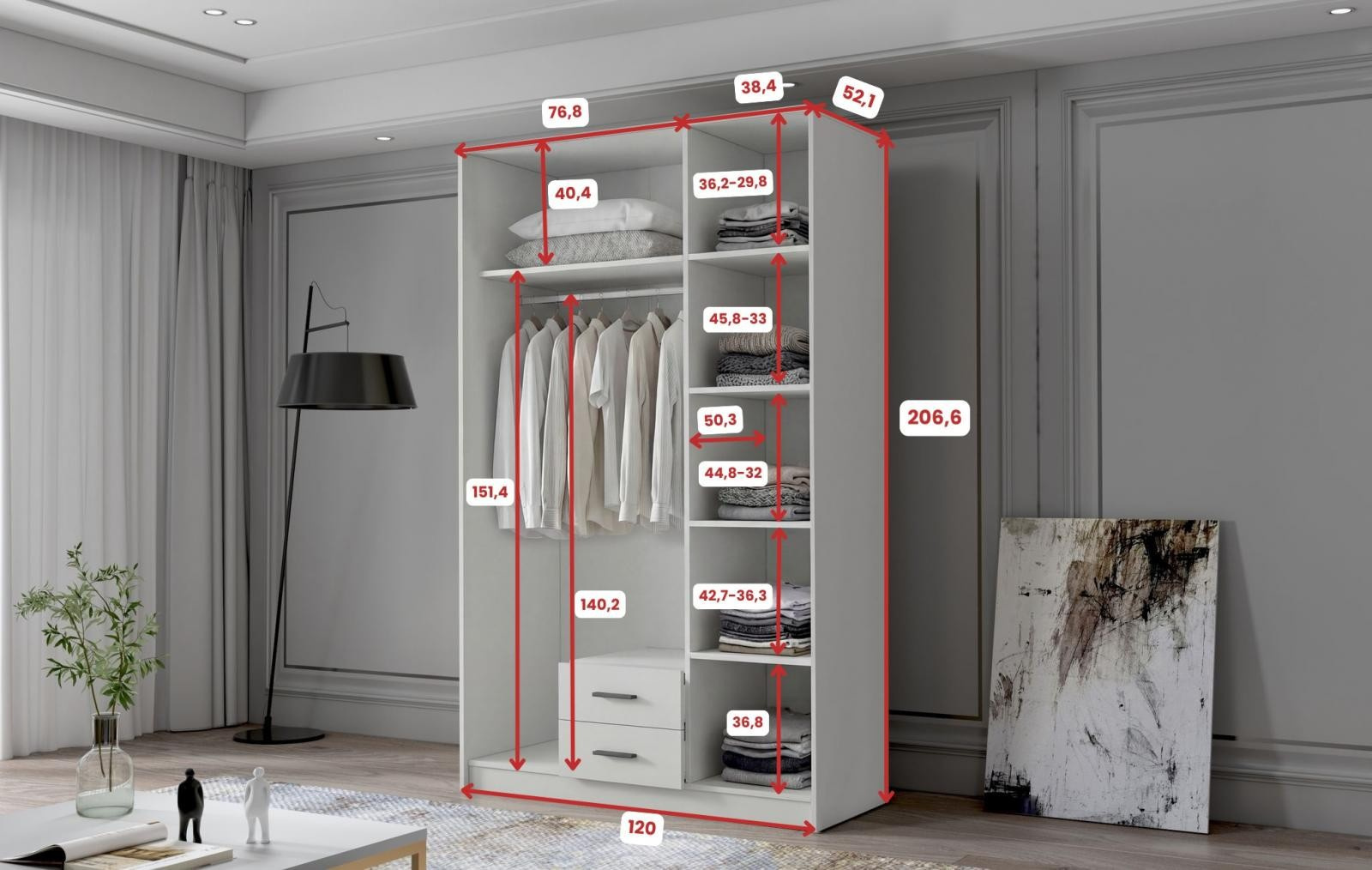 Šatní skříň Arya II v moderním designu má šířku 120 cm a je rozdělena na dvě praktické části. Vnitřní uspořádání kombinuje závěsnou tyč, pět polic a 2 šuplíky, což umožňuje přehledné a praktické rozdělení šatníku.