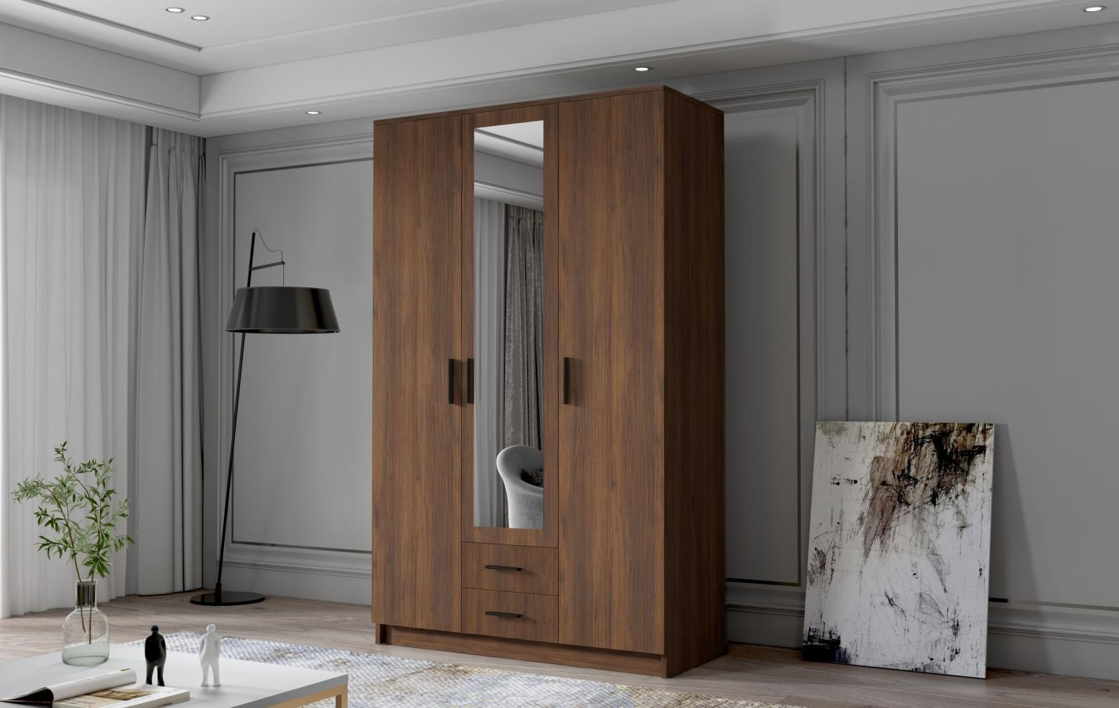 Šatní skříň Arya II v moderním designu má šířku 120 cm a je rozdělena na dvě praktické části. Vnitřní uspořádání kombinuje závěsnou tyč, pět polic a 2 šuplíky, což umožňuje přehledné a praktické rozdělení šatníku.