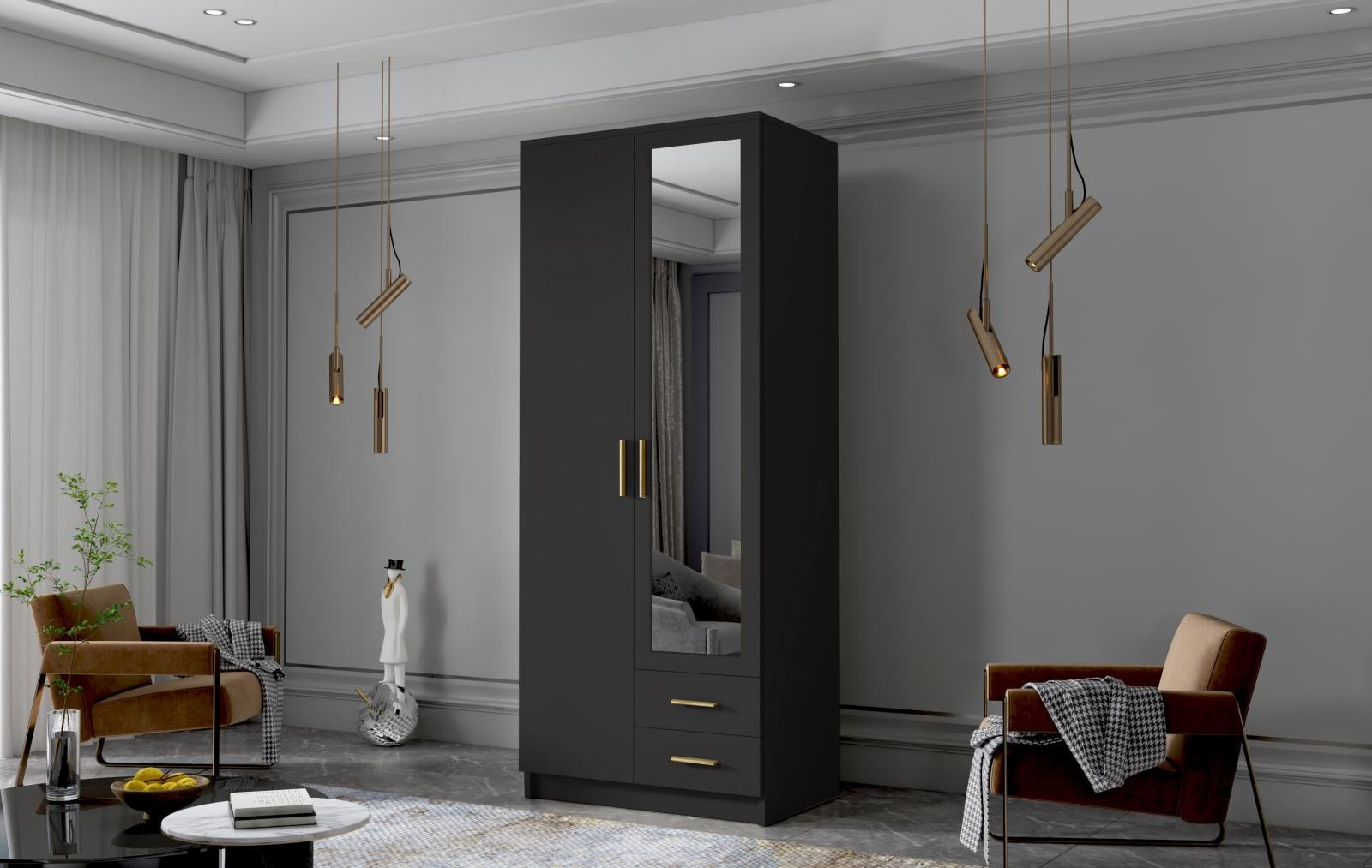 Šatní skříň Arya II v moderním designu má šířku 80 cm a je rozdělena na dvě praktické části. Vnitřní uspořádání kombinuje závěsnou tyč, čtyři police a 2 šuplíky, což umožňuje přehledné a praktické rozdělení šatníku.