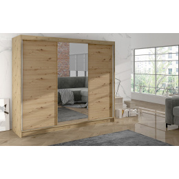 Šatní skříň Debora I v moderním designu má šířku 200 cm a je rozdělena na tři praktické části. Posuvné dveře šetří místo a usnadňují přístup do interiéru. Vnitřní uspořádání kombinuje závěsnou tyč a devět polic, což umožňuje přehledné a praktické rozdělení šatníku.