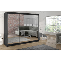Šatní skříň Debora III v moderním designu má šířku 200 cm a je rozdělena na tři praktické části. Posuvné dveře šetří místo a usnadňují přístup do interiéru. Vnitřní uspořádání kombinuje závěsnou tyč a devět polic, což umožňuje přehledné a praktické rozdělení šatníku.