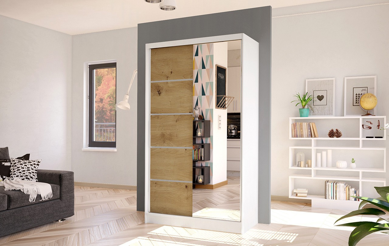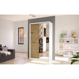 Šatní skříň Diem III v moderním designu má šířku 100 cm a je rozdělena na dvě praktické části. Posuvné dveře šetří místo a usnadňují přístup do interiéru. Vnitřní uspořádání kombinuje závěsnou tyč a čtyři police, což umožňuje přehledné a praktické rozdělení šatníku.