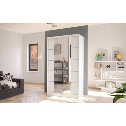Šatní skříň Diem V v moderním designu má šířku 100 cm a je rozdělena na dvě praktické části. Posuvné dveře šetří místo a usnadňují přístup do interiéru. Vnitřní uspořádání kombinuje závěsnou tyč a čtyři police, což umožňuje přehledné a praktické rozdělení šatníku.
