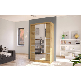 Šatní skříň Diem V v moderním designu má šířku 100 cm a je rozdělena na dvě praktické části. Posuvné dveře šetří místo a usnadňují přístup do interiéru. Vnitřní uspořádání kombinuje závěsnou tyč a čtyři police, což umožňuje přehledné a praktické rozdělení šatníku.
