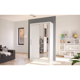 Šatní skříň Kosta VI v moderním designu má šířku 100 cm a je rozdělena na dvě praktické části. Posuvné dveře šetří místo a usnadňují přístup do interiéru. Vnitřní uspořádání kombinuje závěsnou tyč a čtyři police, což umožňuje přehledné a praktické rozdělení šatníku.
