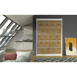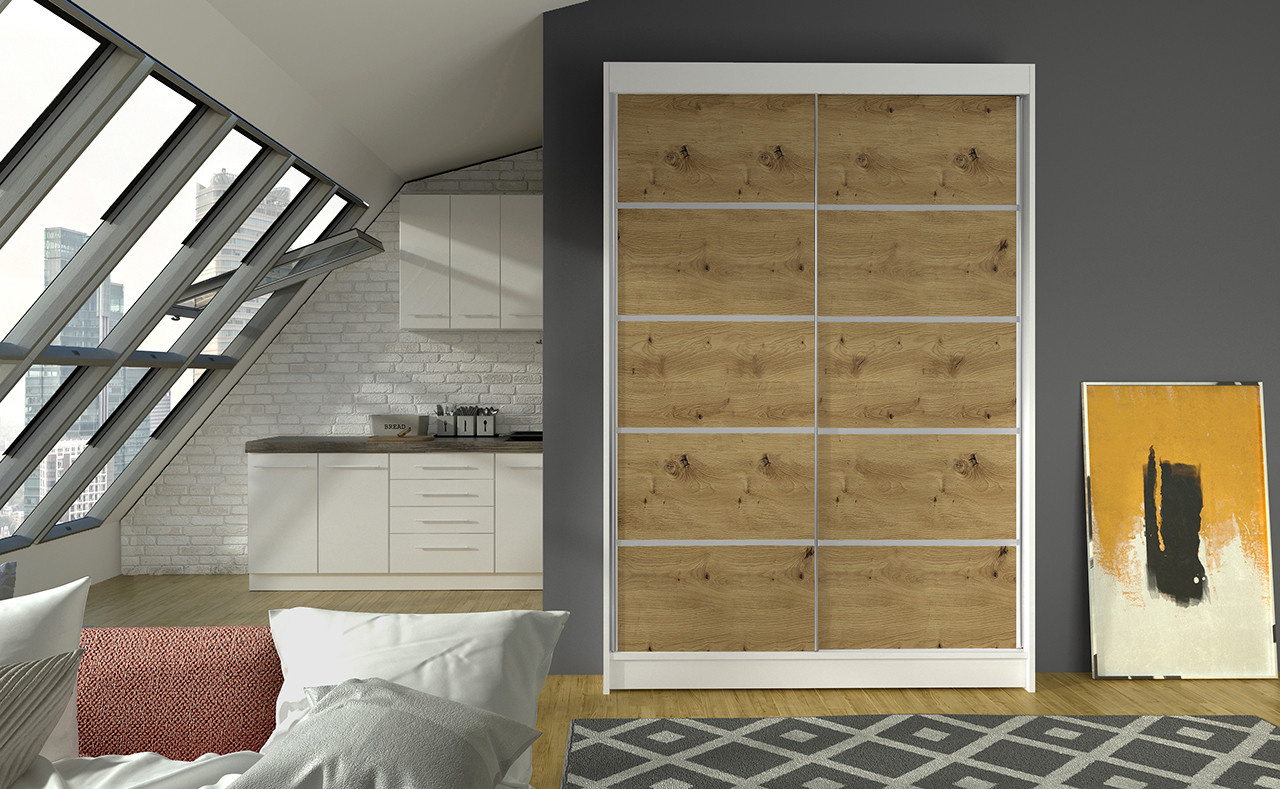 Skříň je vyrobena z kvalitního lamina. Díky svému vnitřnímu uspořádání nabízí dostatek úložného prostoru a posuvné dveře prostor šetří. Skříň je vhodná do ložnice, dětského nebo studentského pokoje, do předsíně i kanceláře. Vnitřní uspořádání skříně je vyobrazeno na fotografii. Skříň je dodávána v demontu a součástí je montážní plánek včetně všech potřebných spojovacích materiálů. Vyobrazené dekorace nejsou v ceně.