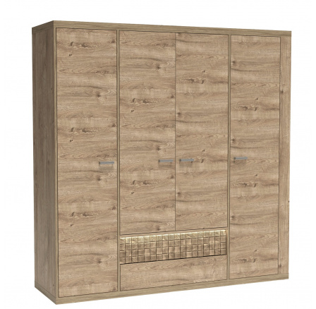 Jednoduchá velká čtyřdveřová skříň, která poslouží k uložení mnoha věcí. Díky kovovým úchytkám a pevné konstrukci je skříň odolná a stabilní. Skvělým a jedinečným prvkem jsou také panty s tichým zavíráním, které podtrhují měkkost nábytku. Šatní skříň má pět prostorných polic, které pojmou mnoho oblečení, doplňků nebo dokumentů. Ve spodní části se nacházejí velké a zároveň užitečné dvě zásuvky, které pojmou mnoho věcí. K dispozici je možnost dokoupení dalších polic, takže budete mít více prostoru pro předměty, které vyžadují rovnou plochu. V každé části skříně je tyč, která umožňuje využít prázdný prostor, který nábytek poskytuje. K dispozici v jedné barvě.