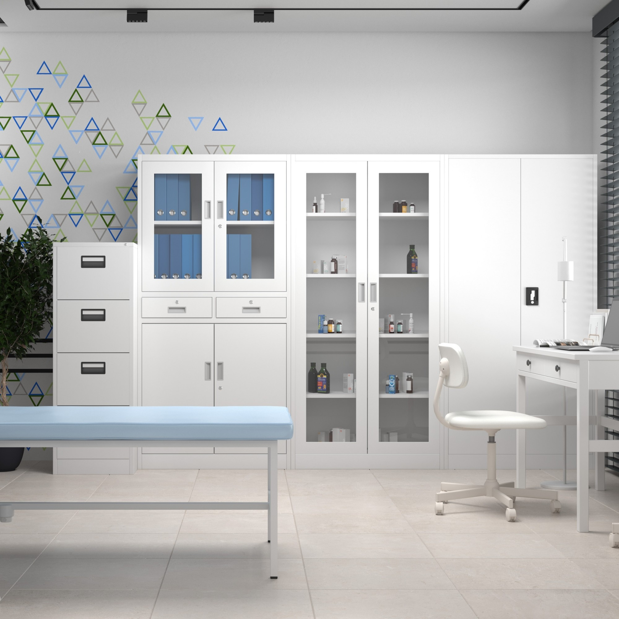 Prosklená skříň, lékařská vitrína AMELIA, 900 x 1850 x 400 mm, bílá Velká, prostorná, pevná - taková je kovová lékařská skříň AMELIA. Od ostatního nábytku vyrobeného z oceli se odlišuje estetickými proskleními, která ti usnadní každodenní používání. Konstrukce z oceli chráněná práškovou barvou zaručuje výjimečnou odolnost. Lékařská vitrína AMELIA i při neustálém otevírání, zavírání, vyndávání a přesouvání předmětů uvnitř po mnoho let uchvacuje svým vynikajícím stavem.Skříň prosklená AMELIA - 4krát ano! Tak pro velkou kapacitu - prosklená skříň je opravdu prostorná. 4 police vytvoří 5 přihrádek, ve kterých uložíš až 50 šanonů. Každou polici si nastavíš podle svých individuálních potřeb, protože jsme zajistili možnost regulace každých 25 mm. Tak pro pevnost - silná konstrukce z oceli lakované práškovou barvou, o tloušťce 0,6 mm, je vysoce odolná proti mechanickému poškození. Naše řešení má certifikaci PZH. Tak pro bezpečnost - dvoukřídlé dveře lékařské vitríny jsou zabezpečeny 3bodovým zamykacím zámkem (2 klíče v sadě). Ve skleněné skříni uložíte dokumenty v souladu s GDPR 2018. Tak pro estetiku - lékařská skříň je vyrobena v univerzálním, minimalistickém stylu. Skleněné dveře jí dodávají lehkost a usnadňují orientaci v obsahu bez nutnosti jejich otevírání. AMELIA není jen lékařská vitrína Prosklená skříň se spojuje s lékařskými ordinacemi, klinikami, avšak uchovávání léků a lékařského vybavení není jejím jediným využitím. Dveře vyrobené ze skla umožňují okamžitě vidět obsah. V důsledku toho minimalizují čas, který musíte věnovat hledání potřebných předmětů. Navíc prosklení vypadá skvěle a představuje zajímavé zpestření pro kancelářský nábytek s plnými dveřmi.Skříň AMELIA se osvědčí jako skříň na dokumenty, spisy a knihy v kanceláři, škole, advokátní kanceláři nebo archivu, pečující prostředky v kadeřnickém salonu nebo kosmetickém salonu. Použiješ ji také jako vitrínu, ve které vystavíš diplomy, ocenění, sběratelské předměty. Prosklená skříň je uzamykatelná na klíč, takže cenné věci v ní uložené se jistě nedostanou do nepovolaných rukou.Skříň prosklená praktická a odolná Spojení kovu se sklem nám umožnilo získat elegantní a praktickou lékařskou skříň. Korpus je vyroben z ocelového plechu o tloušťce 0,6 mm. Abychom zvýšili odolnost proti korozi a mechanickému poškození, pokryli jsme ho práškovou barvou v bílé barvě. Celá konstrukce je mimořádně pevná, stabilní a odolná. Prosklená skříň AMELIA není standardní kovovou vitrínou. Zadní a boční stěny jsou vyrobeny z odolné oceli. Omezení skleněné plochy způsobuje, že lékařská skříň je lehčí a méně náchylná k poškození. Takové řešení se obzvláště dobře osvědčuje v situaci, kdy je prosklená skříň AMELIA umístěna v jedné linii s ostatním nábytkem. Silná ocelová konstrukce nám umožnila umístit na bok a zadní stranu otvory, které umožňují připevnění lékařské skříně ke stěně místnosti, což zvyšuje bezpečnost používání.Cechy lékařské vitríny AMELIA: Výška: 185 cm Šířka: 90 cm Hloubka: 40 cm Hmotnost: 46.5 kg Barva: bílá, RAL 9003 4 nastavitelné police Tvrzené sklo Záruka kvality Prosklenou skříň AMELIA ti posíláme v částech. Montáž ti usnadní přehledný návod a video materiál dostupný na stránce.