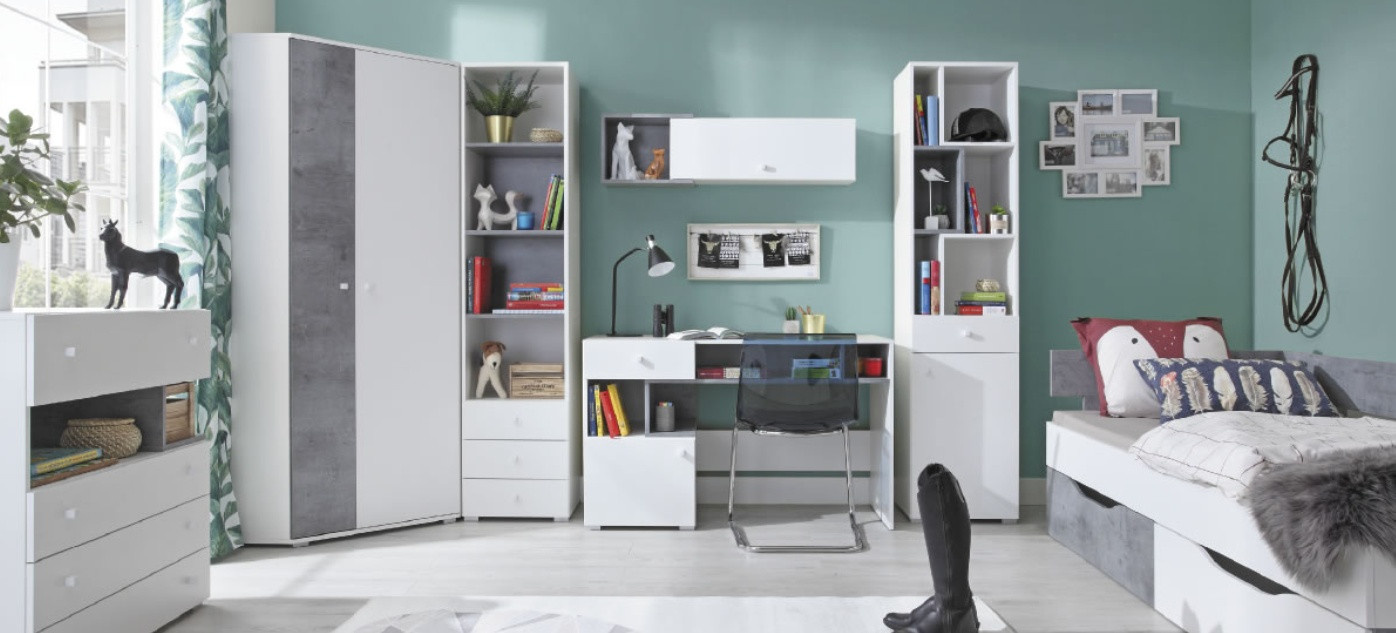 Šatní skříň ze systému SIGMA se vyrábí ve dvou barevných provedeních Beton+Bílý Lux+Dub a Bílý Lux+Beton.