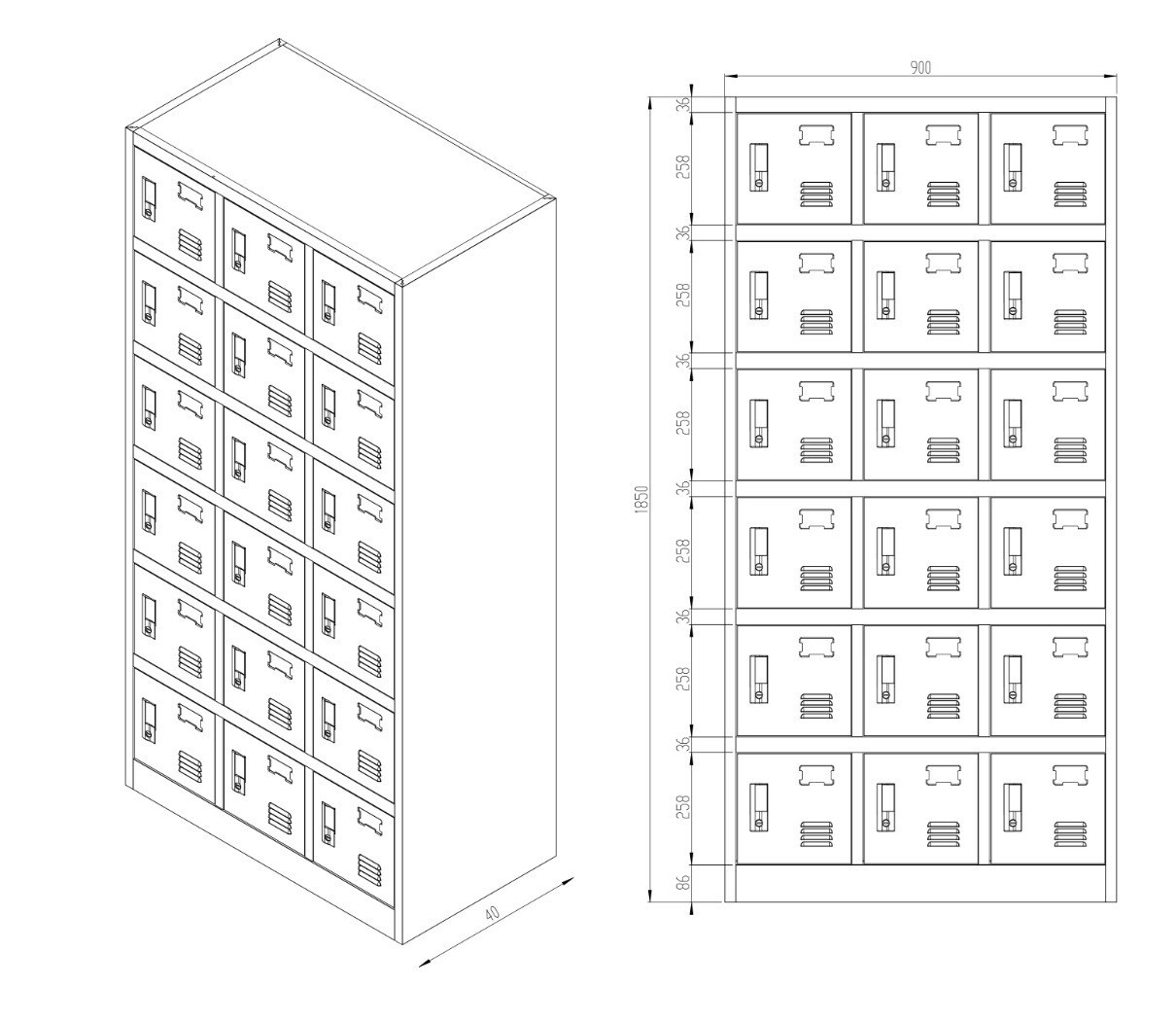 18 samostatných přihrádek umožňuje ukládání oblečení, obuvi, batohů a osobních předmětů. Tato struktura zajišťuje efektivní využití dostupného místa a pohodlné používání více lidmi. Organizace se stává mnohem efektivnější.