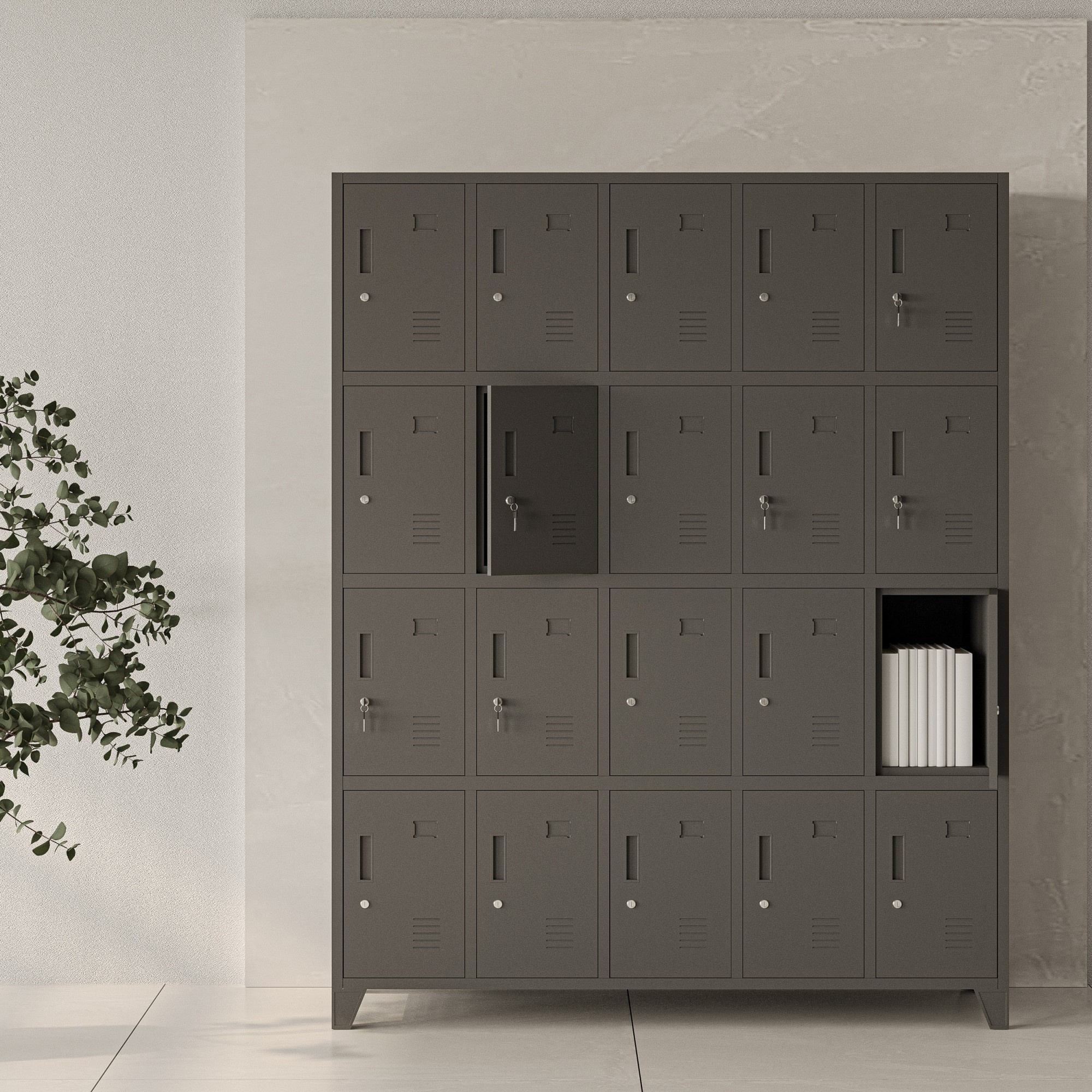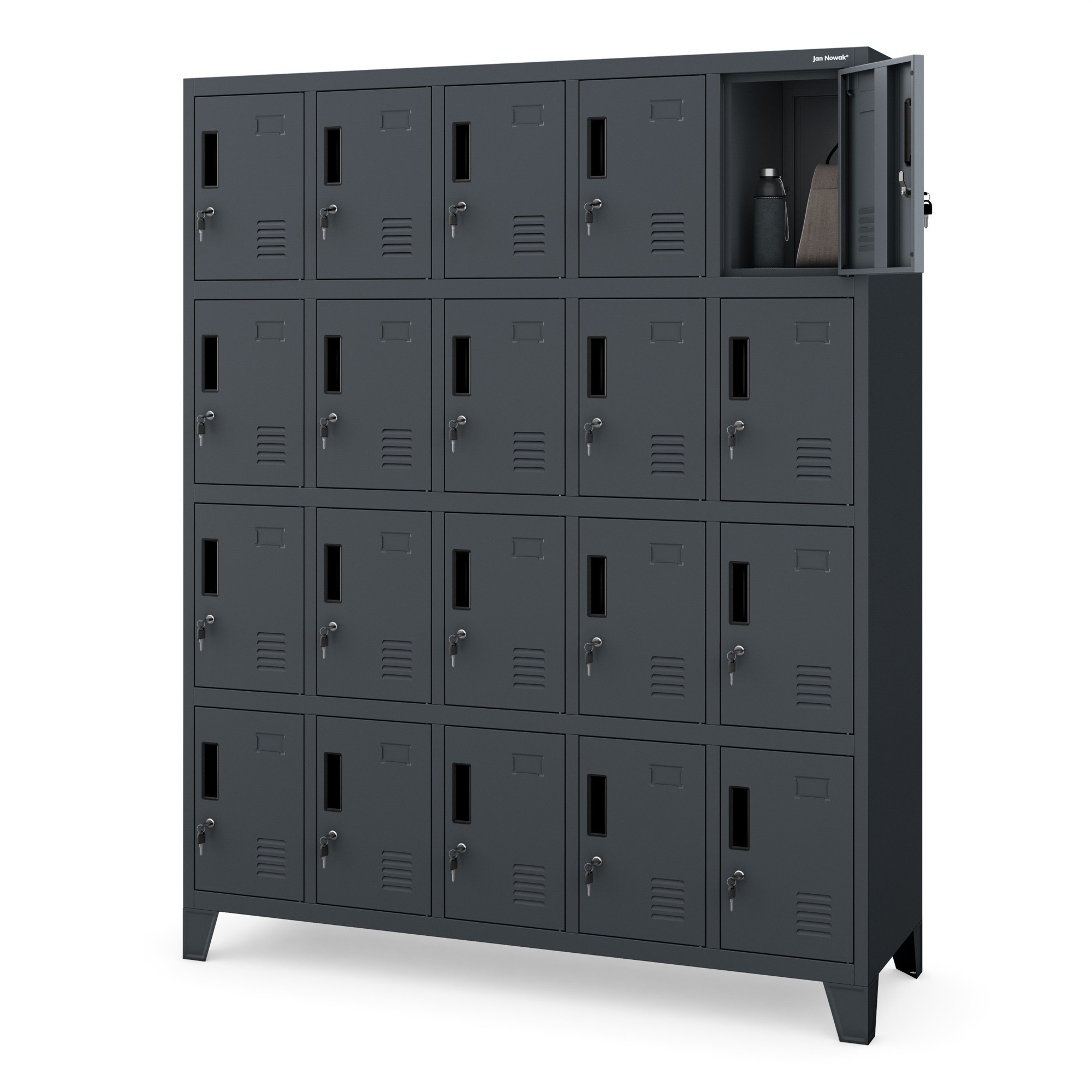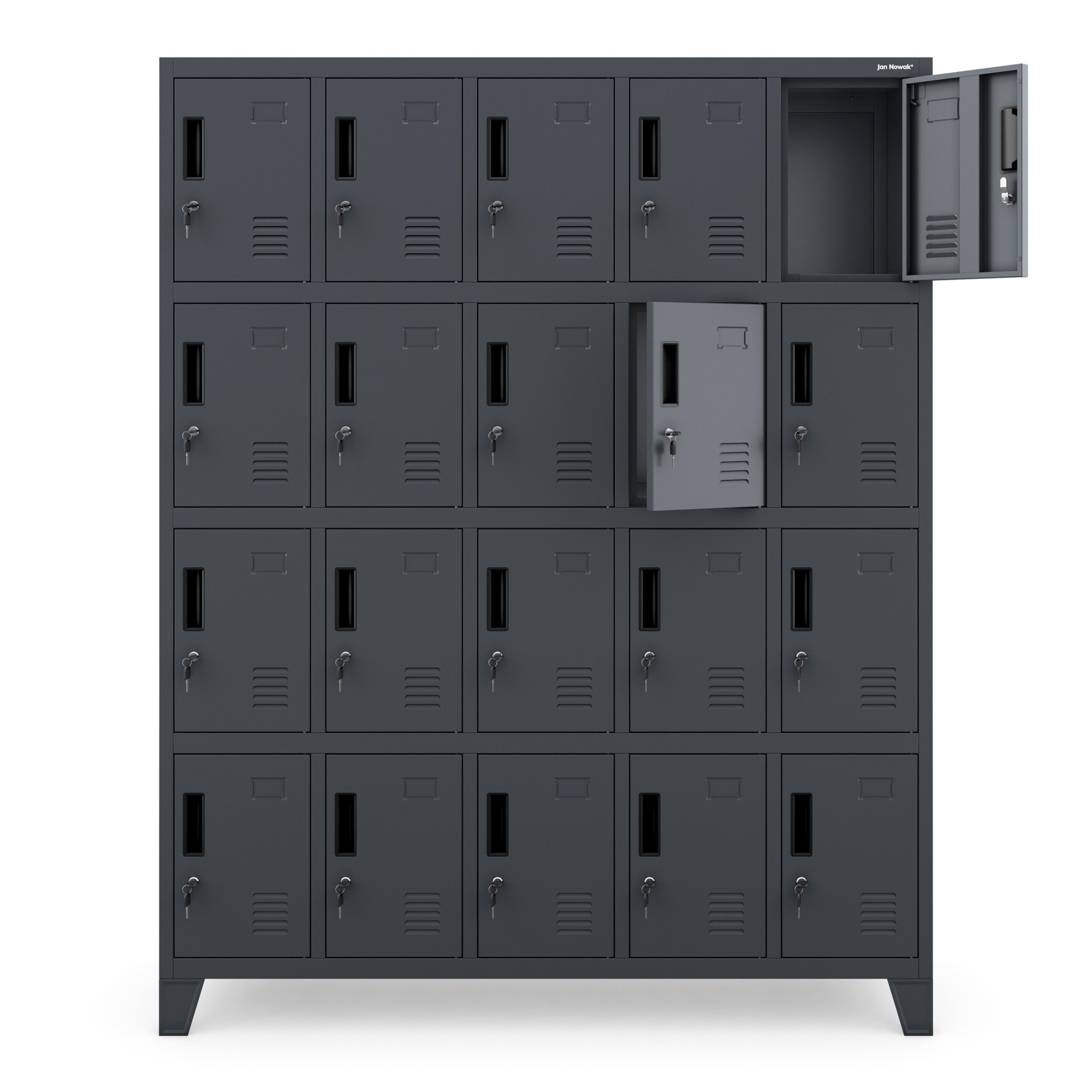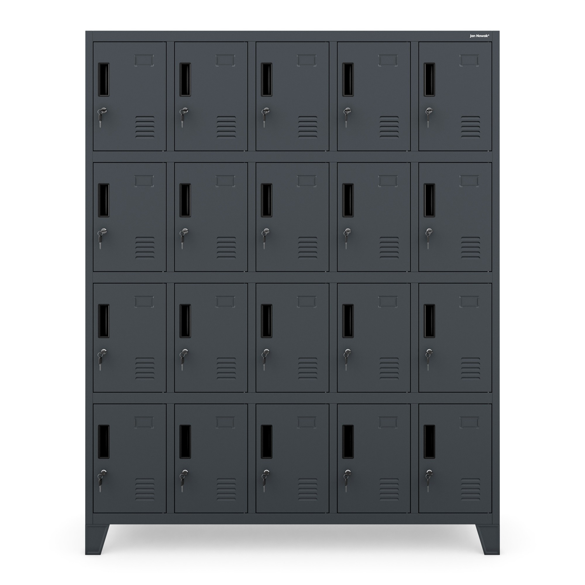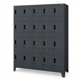 kovová skříňka s přihrádkami ROBERT, antracitová Kovová skříňka ROBERT ukrývá ve svém nitru až 20 přihrádek. Skvěle se hodí všude tam, kde mnoho lidí potřebuje na bezpečném místě odložit své soukromé věci. To ideální řešení pro firmy, školy, školky, fitness kluby, bowlingové dráhy nebo nákupní centra. Kompaktní rozměry skříně (136 cm šířka, 45 cm hloubka, 172 cm výška) vám umožní postavit jeden kus vedle druhého a tím získat ještě více schránek pro uživatele. Solidní konstrukce na léta K vytvoření skříně ROBERT používáme nejlepší možný materiál, tedy ocel chráněnou práškovým lakováním. Plech má tloušťku 0,6 mm a na celém svém povrchu je pokrytý lakem. V důsledku toho skříň získává pevnost a trvanlivost, stejně jako odolnost proti vzniku rzi nebo mechanickému poškození. Praktické vybavení: Prostorné skříňky - úložné prostory o rozměrech 36 x 24 x 45 cm umožňují uživatelům ukládat např. snídaně, helma, nákupy, batoh nebo boty. Promyšlená konstrukce - ventilační otvory na každých dvířkách se starají o správný průtok vzduchu a zabraňují hromadění vlhkosti. Díky tomu zůstávají uzavřené předměty uvnitř v dokonalém stavu. Maximální bezpečnost - ve skříni ROBERT najdete zesílené čelní plochy a také pevné zámky. Každý z nich je vybaven dvěma klíči. Výklenek na vizitku - připravené místo vám umožní přidělit schránku studentům nebo zaměstnancům a tím jim usnadnit používání skříňky. Nožky v sadě - model ROBERT můžete namontovat na nožky. Když se skříňky nacházejí ve větší výšce, zajistíš uživatelům snadnější přístup do vnitřku a udržíš podlahu v perfektním stavu. Skříň s úložnými prostory v antracitové barvě. Kovové skříně okouzlují svou odolností. To není jediný aspekt, který tě přesvědčí ke koupi řešení Jan Nowak. Model ROBERT je rovnoměrně natřen tmavou, antracitovou barvou. Interiér se skříní s 20 přihrádkami bude mimořádně funkční a výjimečně elegantní. Montáž - jednodušší než kdy dříve! Značka nabízí řešení, která jsou navržena tak, aby maximálně usnadňovala a urychlovala montáž. V případě modelu ROBERT tvoří čelní panel spolu s dvířky jeden celek. Díky tomu sestavení skříně s 20 přihrádkami trvá přibližně 30 minut. K sadě jsme přiložili srozumitelný papírový návod. Navíc jsme vytvořili video, na kterém uvidíte krok za krokem, jak probíhá celý proces montáže. Video materiál se nachází v horní části stránky. Skříň ROBERT – technické údaje: Barva: antracitová RAL 7016 Výška: 172 cm Šířka: 136 cm Hloubka: 45 cm Hmotnost: 73.5 kg Záruka kvality Rozměry jednotlivé schránky: Výška: 36 cm Šířka: 24 cm Hloubka: 45 cm