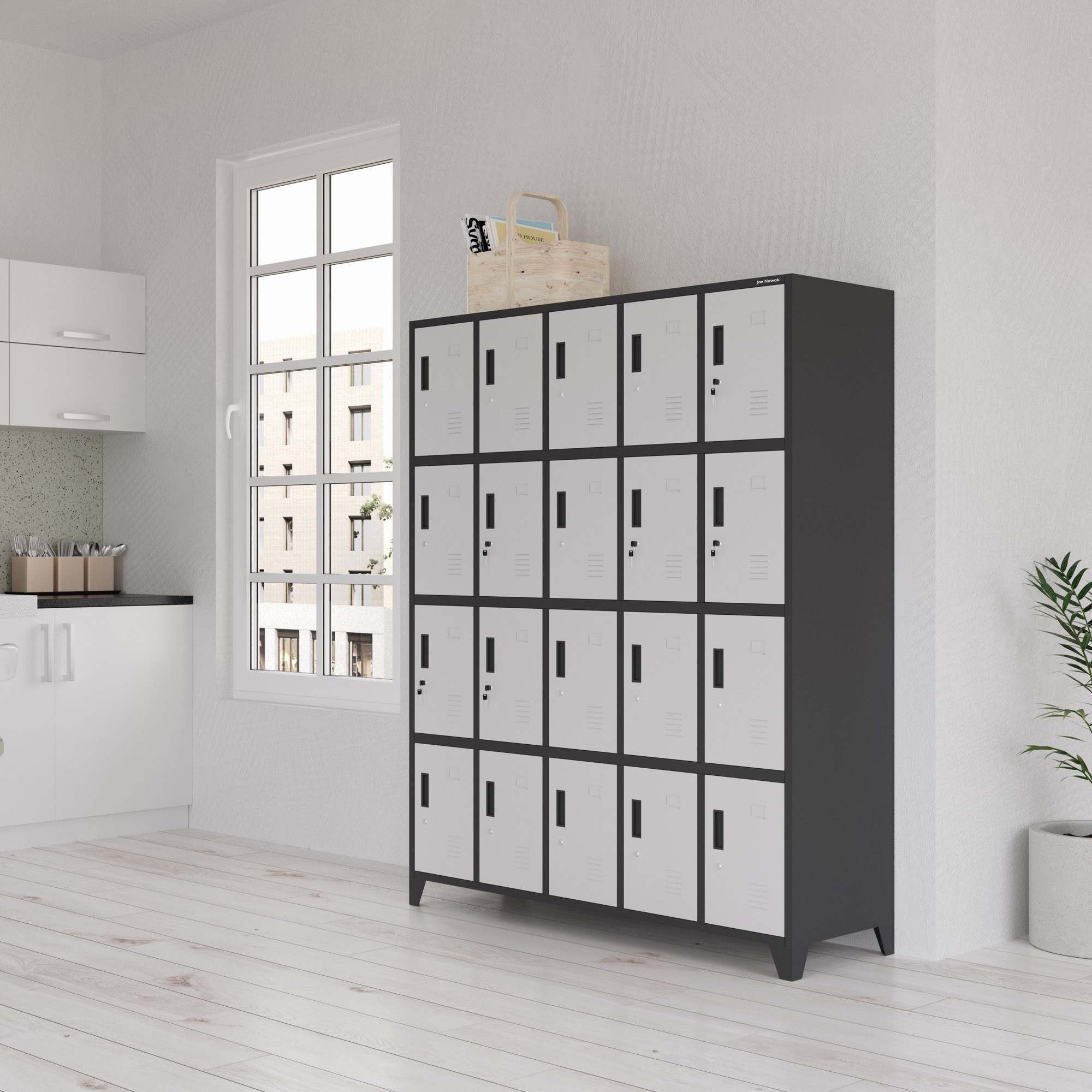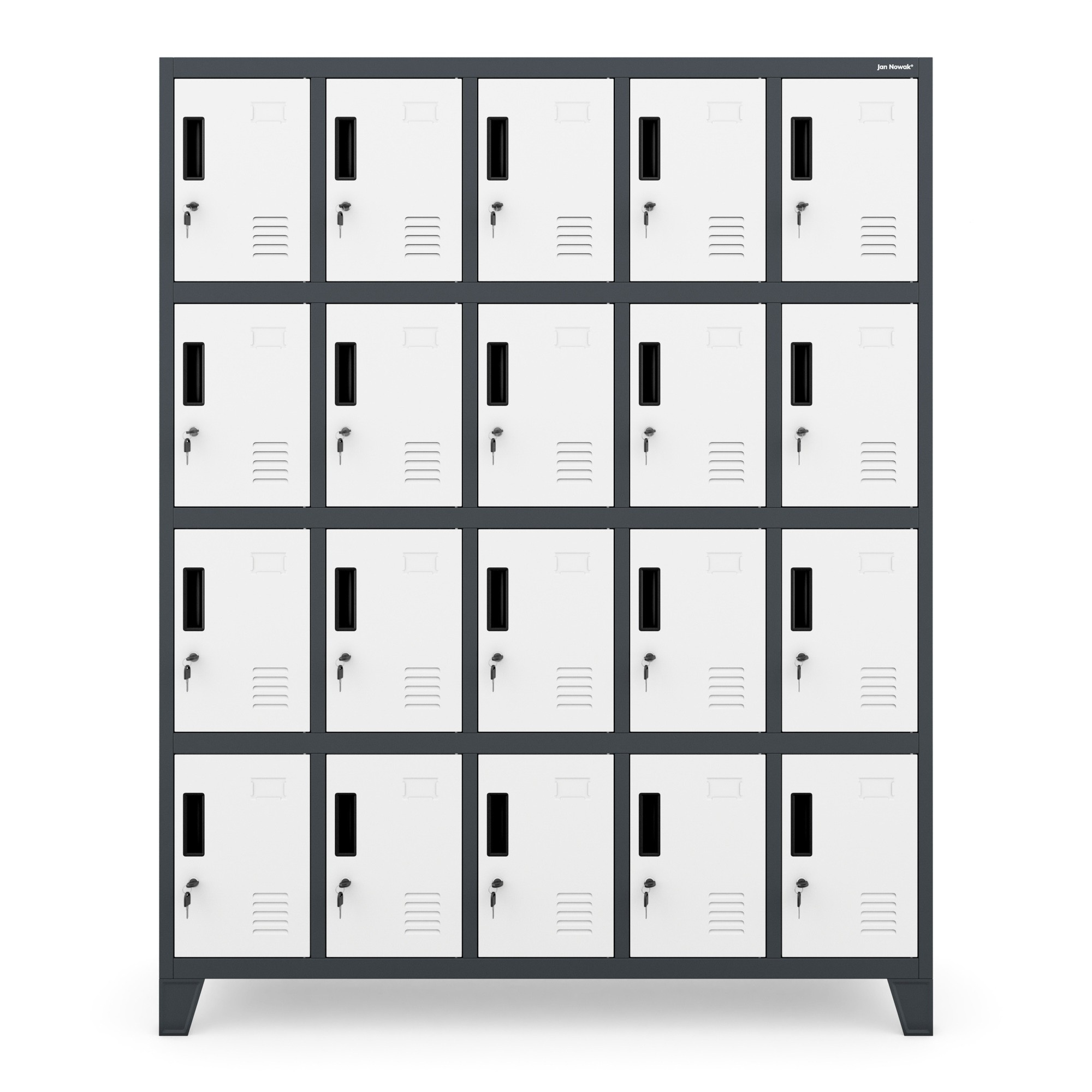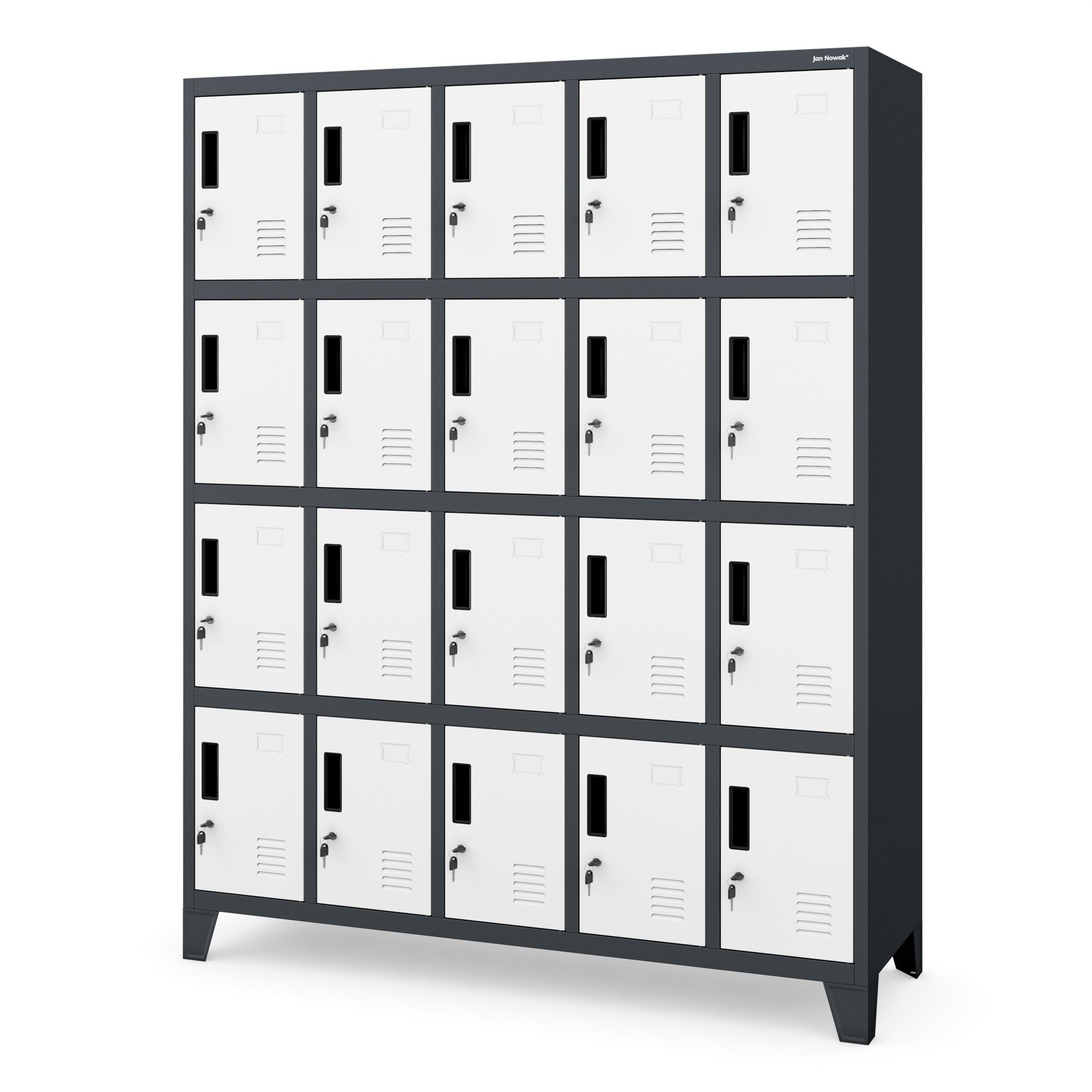kovová skříňka ROBERT, antracitově-bílá Kovová skříňka ROBERT ti nabízí velké možnosti. Ve stojanu, který má šířku 136 cm, výšku 172 cm a hloubku 45 cm, jsme umístili až 20 úložných prostorů stejné velikosti. To je velmi pohodlné řešení, které umožní bezpečně uložit soukromé věci zejména na místech, kde se nachází mnoho lidí. Skříňka ROBERT je ideální pro ukládání: svačin v práci, knih a sešitů ve škole, osobních věcí v posilovně nebo fitness klubu, bot v bowlingové herně, nákupů v obchodním centru. Skříňka z kovu Pro výrobu skříňky ROBERT používáme ocelový plech o tloušťce 0,6 mm. Konstrukci před korozí a mechanickým poškozením chrání rovnoměrně nanesená vrstva práškového laku. Malování chrání skříňku před škodlivými vlivy, ale také jí dodává atraktivní vzhled. Antracitové tělo a bílé dvířka vypadají originálně a jistě budou zajímavým zpestřením vašeho interiéru. Funkčnost uzavřená ve 20 schránkách: Všechno se vejde - schránky o velikosti 36 x 24 x 45 cm jsou prostorné a pojmou boty, batoh, nákupy, snídani nebo helmu. Promyšlené řešení - dvířka skříněk mají ventilační otvory, aby byla zajištěna správná cirkulace vzduchu a odpovídající vlhkost. Pro bezpečnost používání - čela jsou zesílena a zajištěna pevným zámkem s jedním uzamykacím bodem. Ke každému dostanete dva klíče. Vyhni se omylům, na dvířkách najdeš místo na vizitku, díky tomu snadno přiřadíš skříňky zaměstnancům nebo studentům. Snazší udržování pořádku - skříňka ROBERT má možnost montáže nožiček. Díky tomu zajistíš pohodlnější přístup ke každé skříňce, ale také udržíš podlahu v perfektním stavu. Montáž - to je snadné! Řešení vytváříme tak, aby jejich montáž byla jednoduchá a nezabírala mnoho času. Přední část skříně spolu s dvířky k vám přijde v jednom kuse, což výrazně usnadňuje a urychluje celý proces. Přestože má skříňka ROBERT 20 přihrádek, složíš ji bez problémů přibližně za 30 minut. Připravili jsme přehledný papírový návod, který najdete v balení, a video na stránce. Skříňka ROBERT – technické údaje: Barva: antracitově-bílá RAL 7016 – RAL 9003 Výška: 172 cm Šířka: 136 cm Hloubka: 45 cm Hmotnost: 73.5 kg Záruka kvality Rozměry jednotlivé schránky: Výška: 36 cm Šířka: 24 cm Hloubka: 45 cm