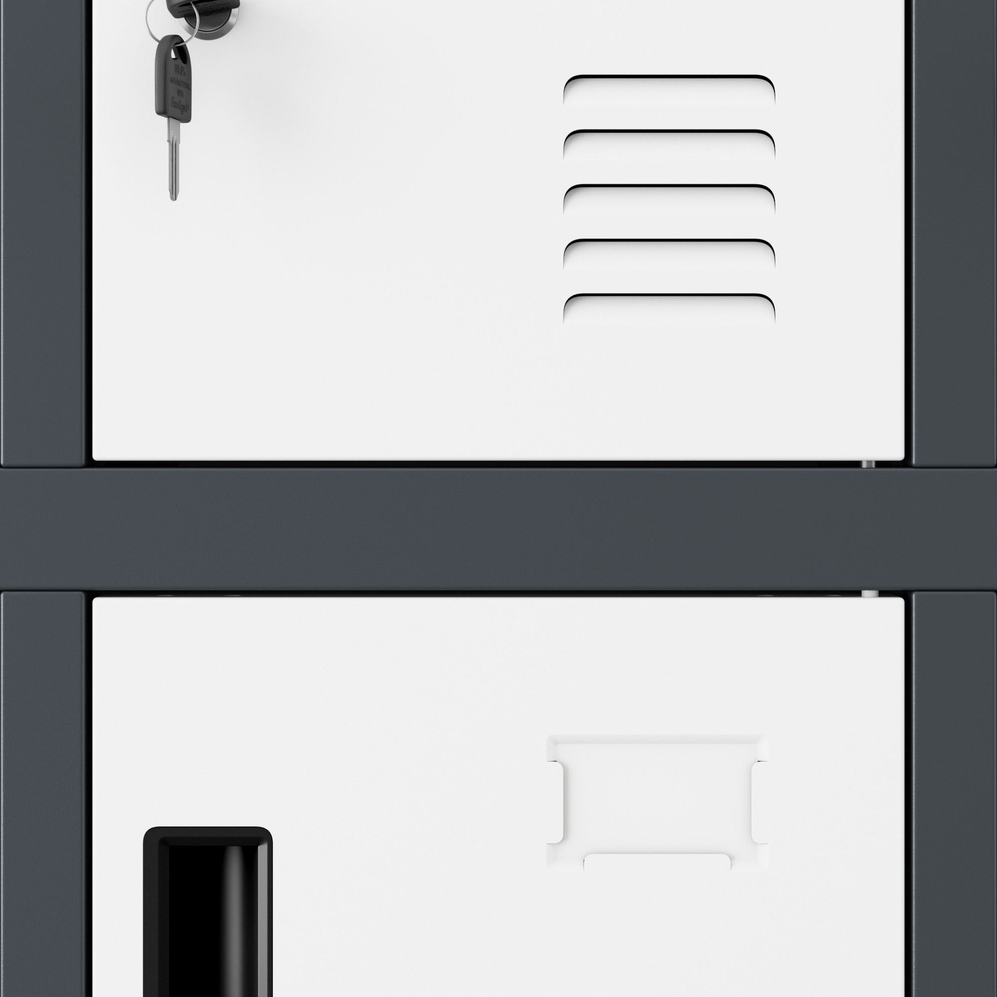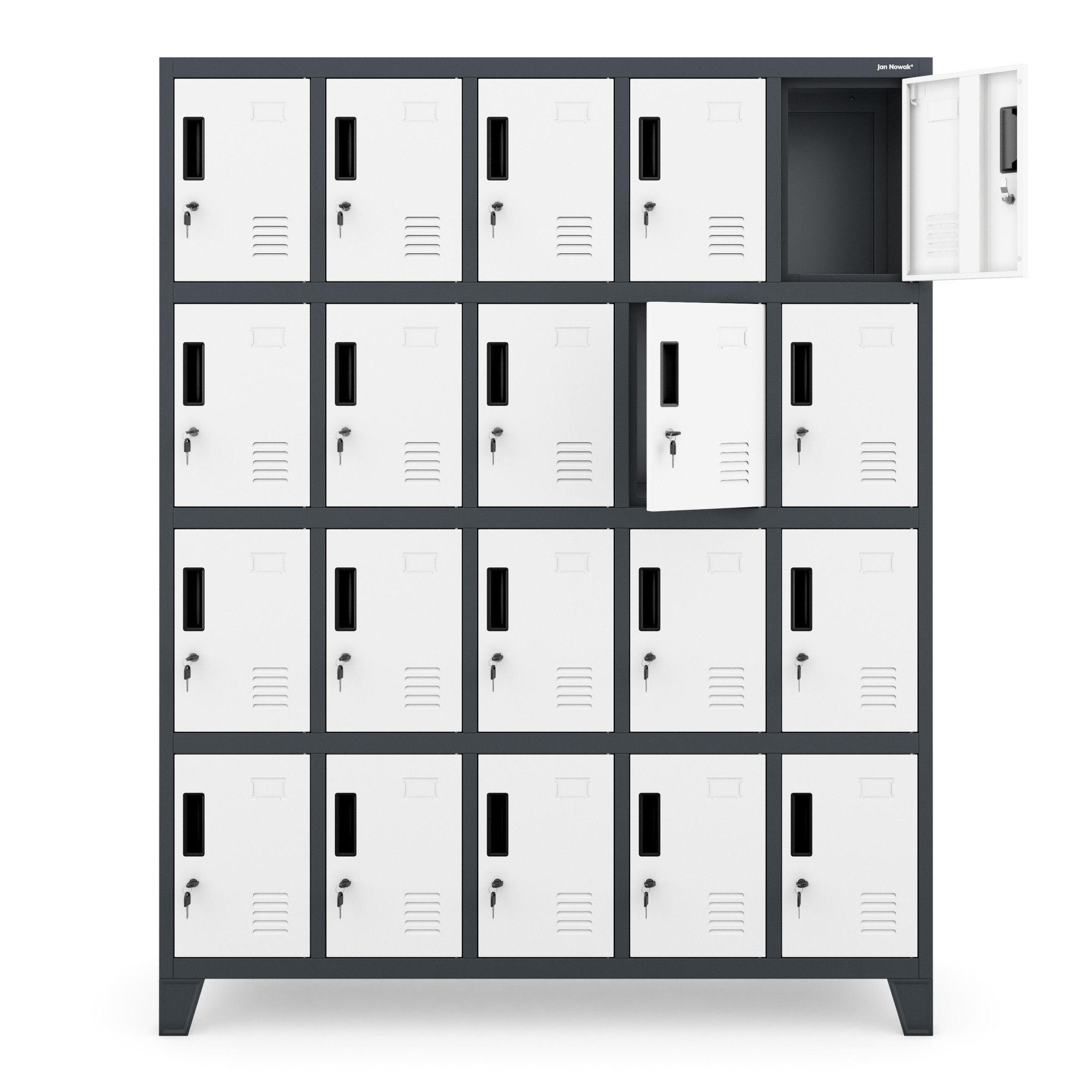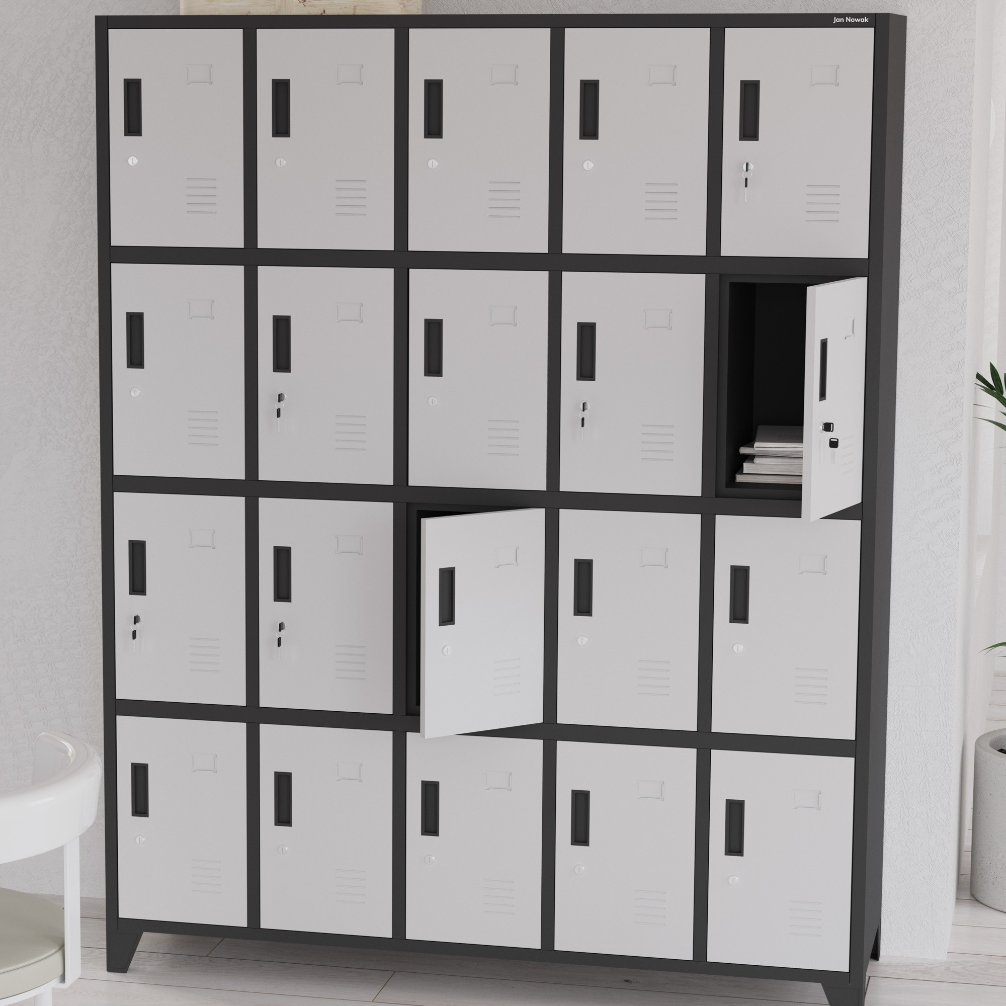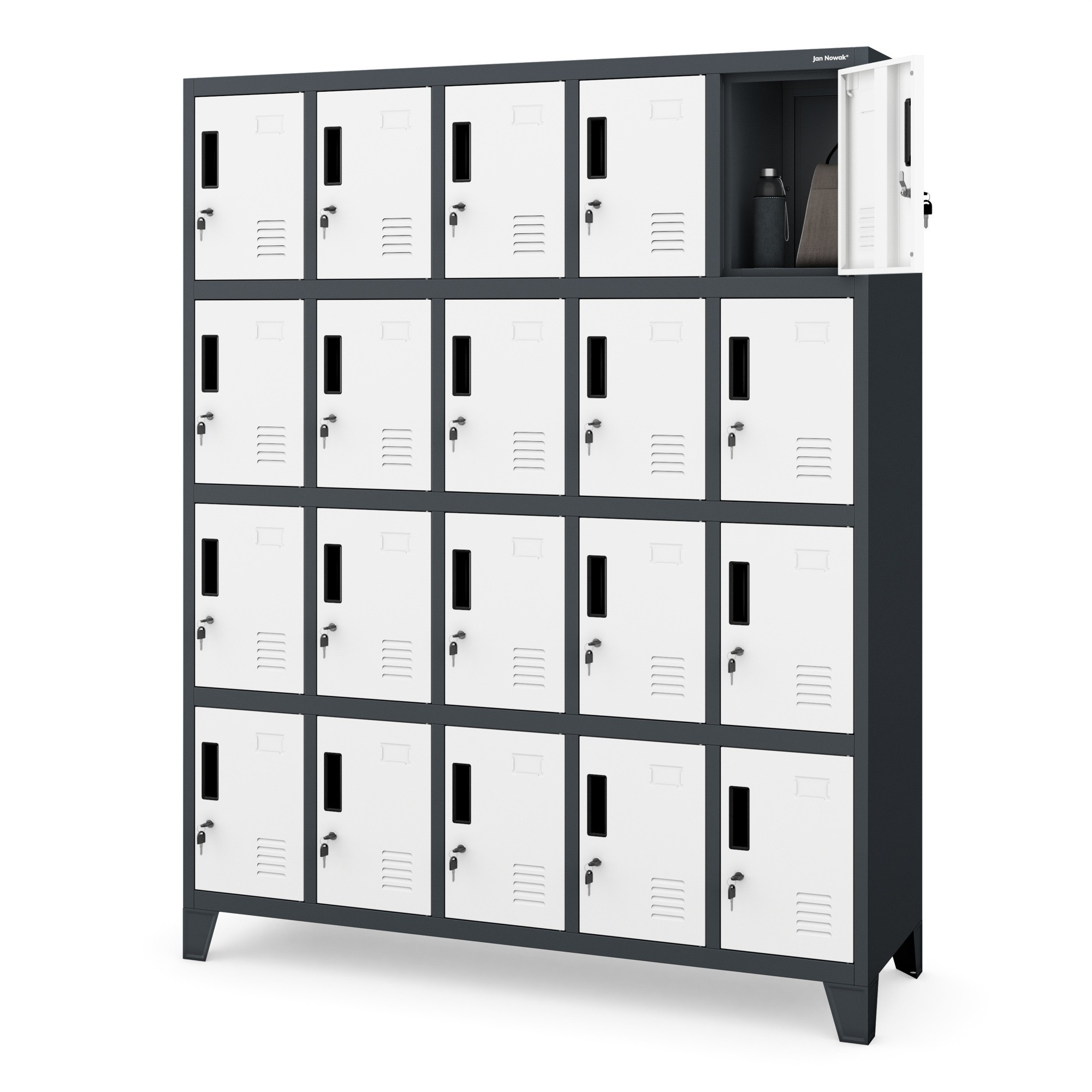 kovová skříňka ROBERT, antracitově-bílá Kovová skříňka ROBERT ti nabízí velké možnosti. Ve stojanu, který má šířku 136 cm, výšku 172 cm a hloubku 45 cm, jsme umístili až 20 úložných prostorů stejné velikosti. To je velmi pohodlné řešení, které umožní bezpečně uložit soukromé věci zejména na místech, kde se nachází mnoho lidí. Skříňka ROBERT je ideální pro ukládání: svačin v práci, knih a sešitů ve škole, osobních věcí v posilovně nebo fitness klubu, bot v bowlingové herně, nákupů v obchodním centru. Skříňka z kovu Pro výrobu skříňky ROBERT používáme ocelový plech o tloušťce 0,6 mm. Konstrukci před korozí a mechanickým poškozením chrání rovnoměrně nanesená vrstva práškového laku. Malování chrání skříňku před škodlivými vlivy, ale také jí dodává atraktivní vzhled. Antracitové tělo a bílé dvířka vypadají originálně a jistě budou zajímavým zpestřením vašeho interiéru. Funkčnost uzavřená ve 20 schránkách: Všechno se vejde - schránky o velikosti 36 x 24 x 45 cm jsou prostorné a pojmou boty, batoh, nákupy, snídani nebo helmu. Promyšlené řešení - dvířka skříněk mají ventilační otvory, aby byla zajištěna správná cirkulace vzduchu a odpovídající vlhkost. Pro bezpečnost používání - čela jsou zesílena a zajištěna pevným zámkem s jedním uzamykacím bodem. Ke každému dostanete dva klíče. Vyhni se omylům, na dvířkách najdeš místo na vizitku, díky tomu snadno přiřadíš skříňky zaměstnancům nebo studentům. Snazší udržování pořádku - skříňka ROBERT má možnost montáže nožiček. Díky tomu zajistíš pohodlnější přístup ke každé skříňce, ale také udržíš podlahu v perfektním stavu. Montáž - to je snadné! Řešení vytváříme tak, aby jejich montáž byla jednoduchá a nezabírala mnoho času. Přední část skříně spolu s dvířky k vám přijde v jednom kuse, což výrazně usnadňuje a urychluje celý proces. Přestože má skříňka ROBERT 20 přihrádek, složíš ji bez problémů přibližně za 30 minut. Připravili jsme přehledný papírový návod, který najdete v balení, a video na stránce. Skříňka ROBERT – technické údaje: Barva: antracitově-bílá RAL 7016 – RAL 9003 Výška: 172 cm Šířka: 136 cm Hloubka: 45 cm Hmotnost: 73.5 kg Záruka kvality Rozměry jednotlivé schránky: Výška: 36 cm Šířka: 24 cm Hloubka: 45 cm