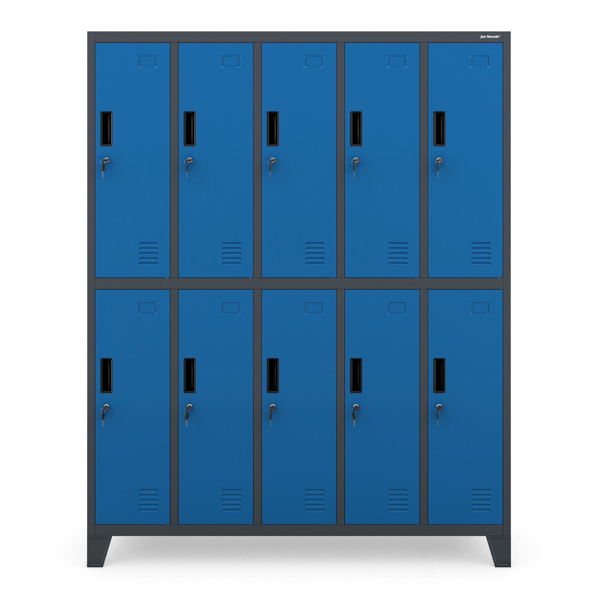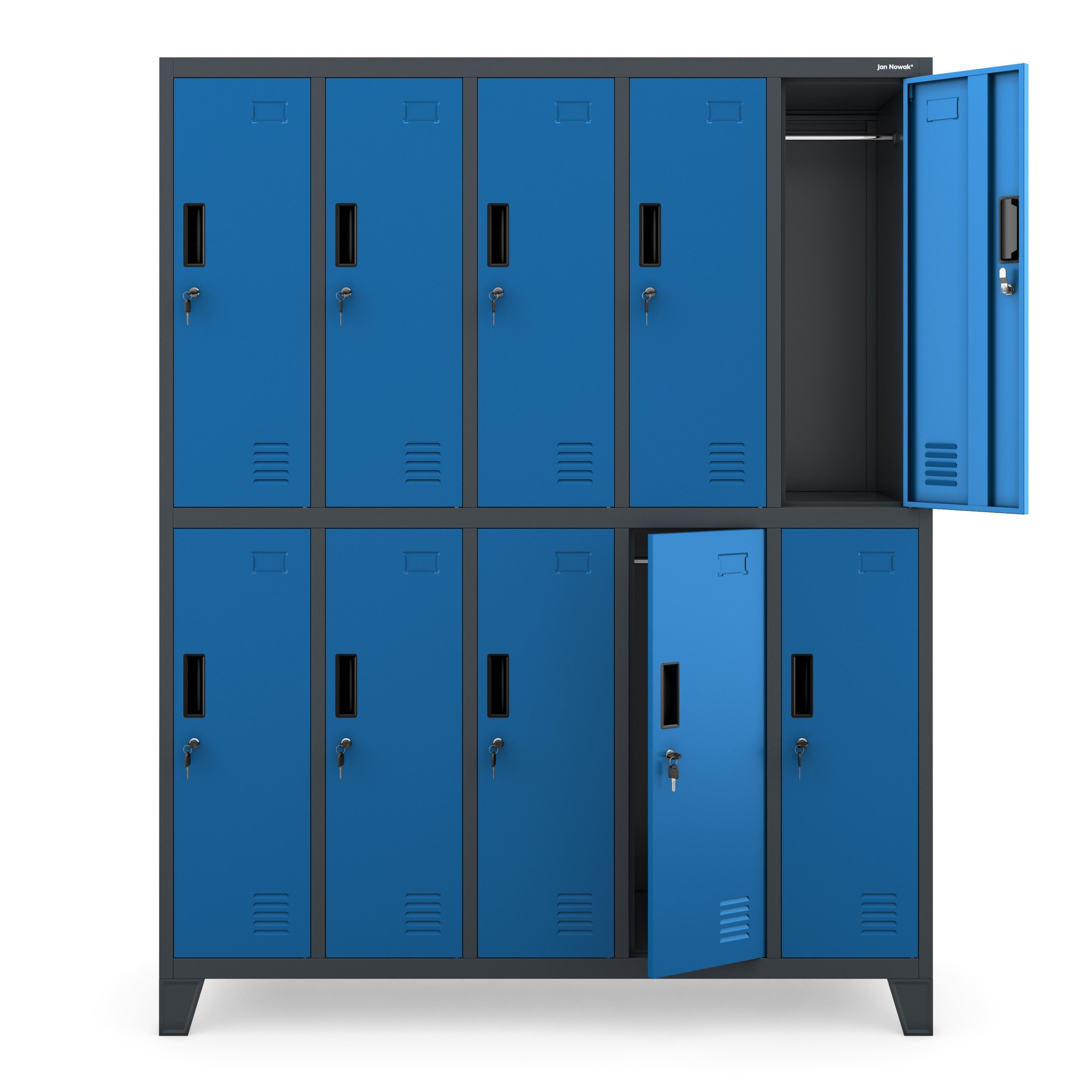 Kovová uzamykatelná šatní skříňka na oblečení s 10 boxy antracitovo-modrá: BARTEK 1360 x 1720 x 450 mm