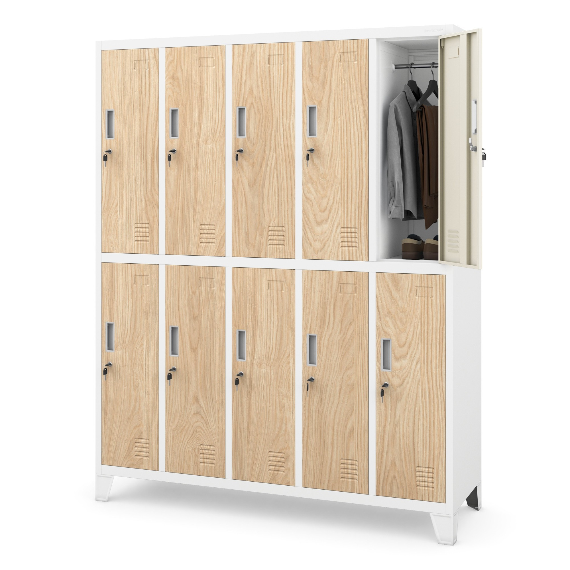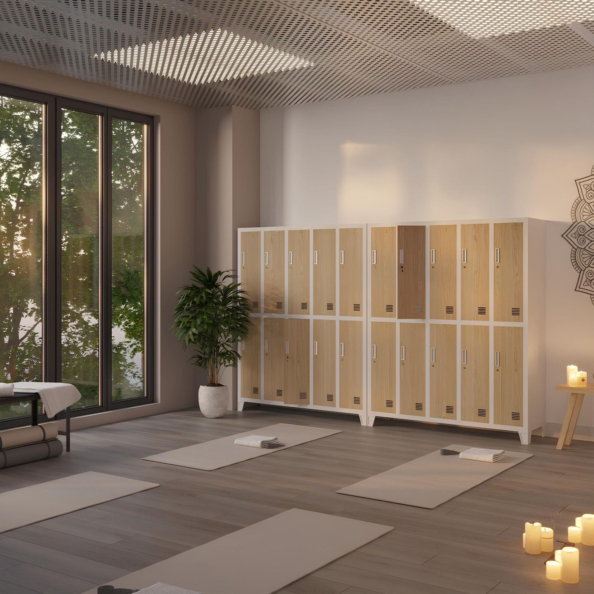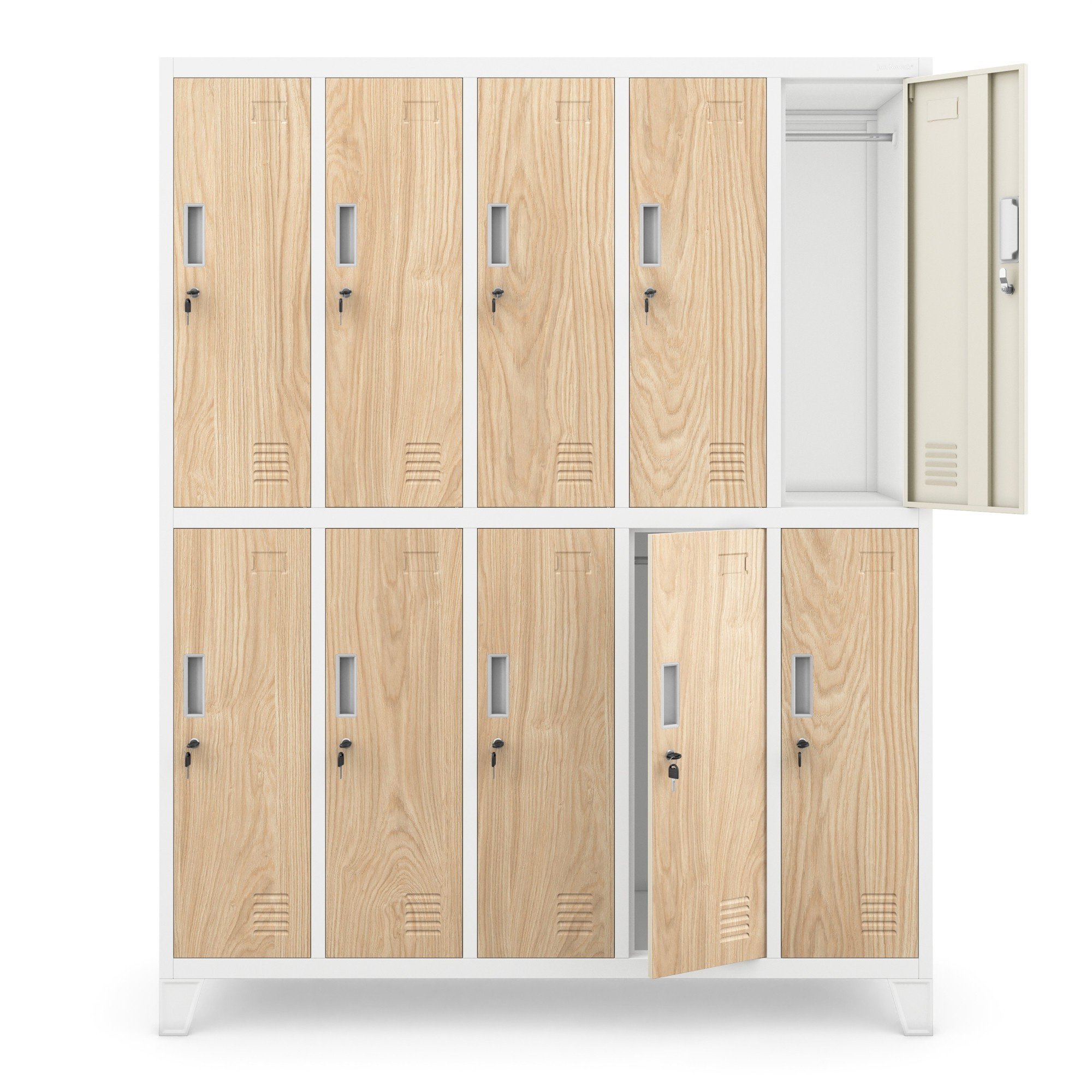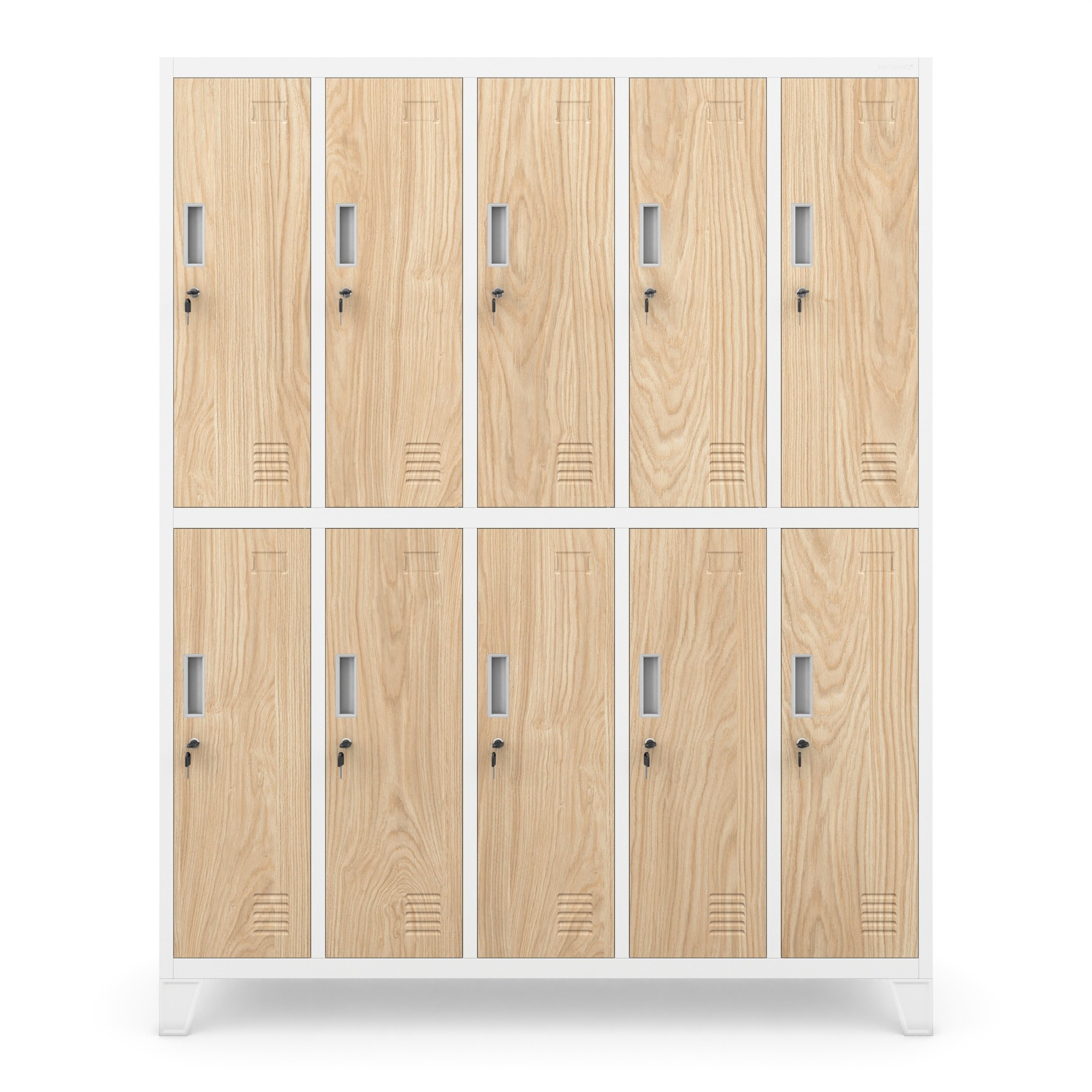 Plechová uzamykatelná šatní skříň s 10 boxy BARTEK, 1360 x 1720 x 450 mm, Eco Design: bílá/dub sonoma