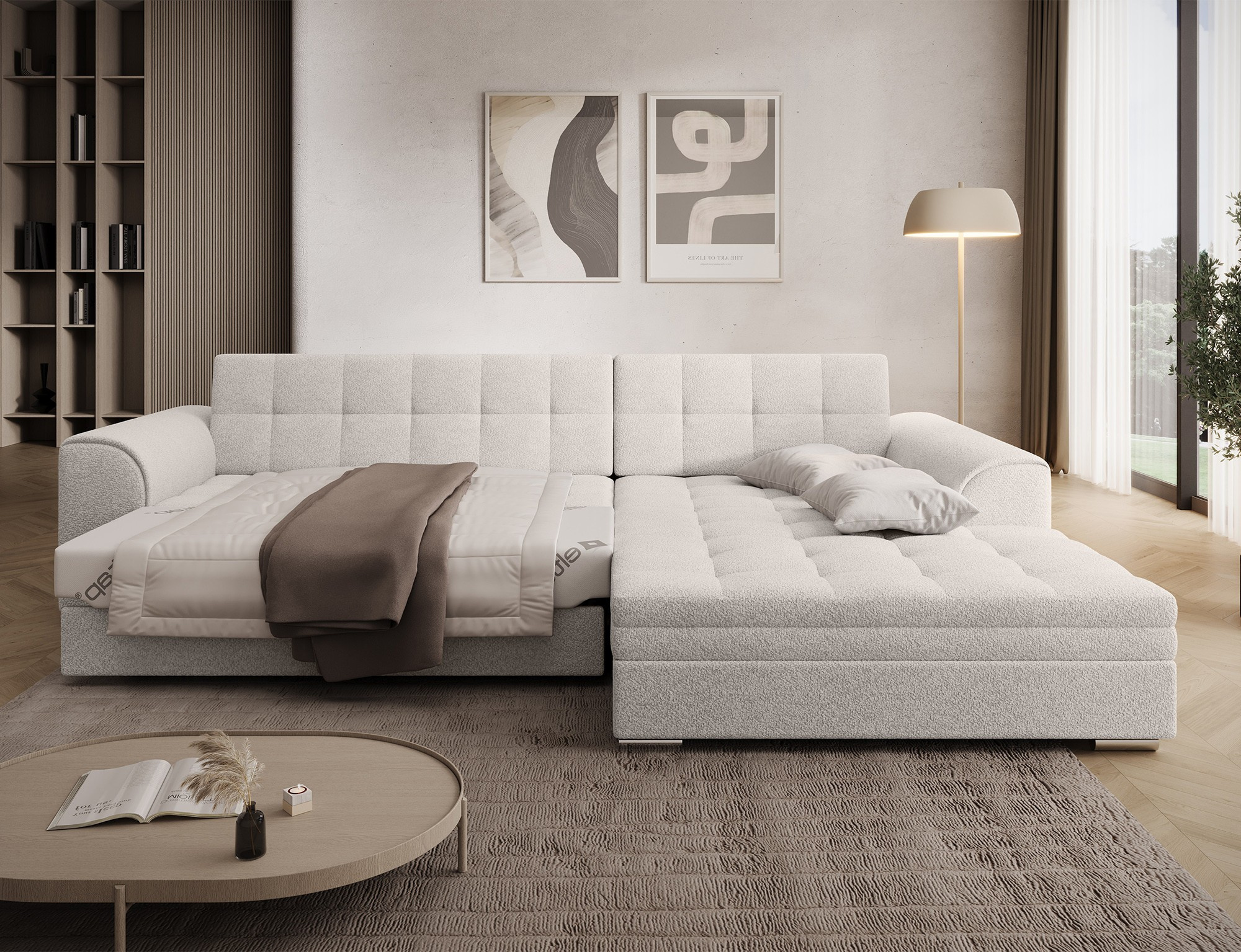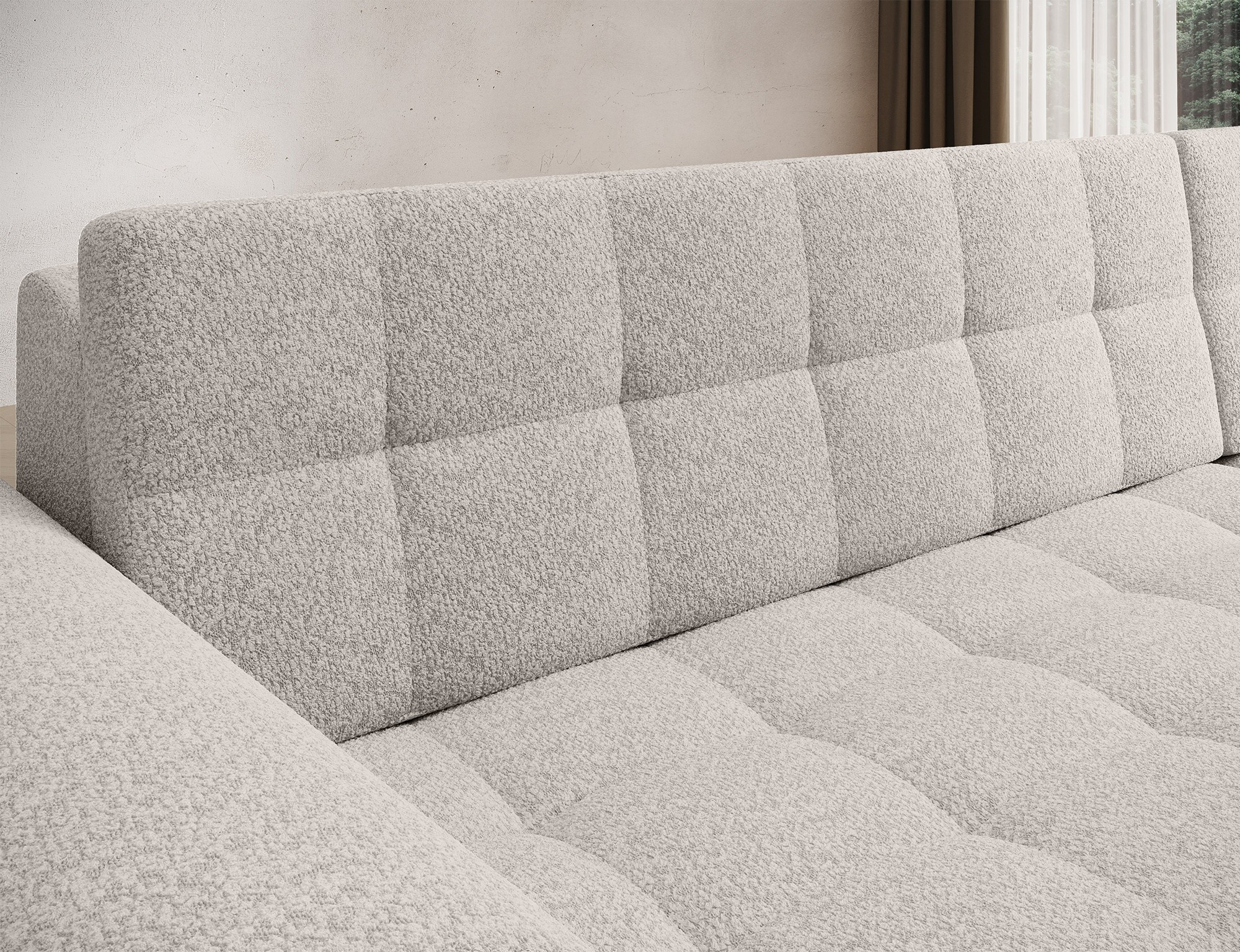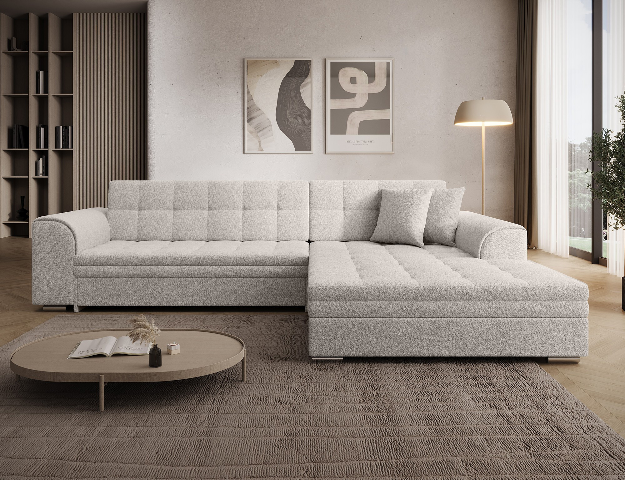 Sorento je stylová, multifunkční rohová pohovka se stabilní konstrukcí ve tvaru L, která vám bude sloužit jako kus nábytku po mnoho let. Pohovka o rozměrech 295 x 195 x 80 cm funguje dobře nejen jako místo pro denní relaxaci, ale také jako ústřední dekorace obývacího pokoje. Díky mechanismu typu delfín je rohová pohovka Sorento vhodná i pro noční odpočinek. Spací plocha o rozměrech 210 x 126 cm zajišťuje dlouhý spánek a plnou relaxaci. Maximální pohodlí zajišťuje kombinace vlnité pružiny a pěny T30, ze které je sedák vyroben. Při výběru rohové pohovky Sorento stojí za to si všimnout jejího neobvyklého stylu, stejně jako: tvarovaného opěradla, zaoblených opěrek a stylového prošívání, které dodávají charakter. Sorento je styl, pohodlí a třída sama o sobě. Určitě stojí za to mít takový kus nábytku ve svém bytě. Sorento je styl, pohodlí a třída sama o sobě. Určitě stojí za to mít takový kus nábytku ve svém bytě.