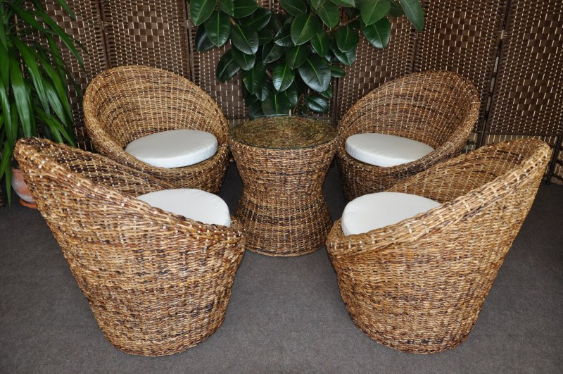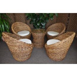 Sedací souprava sestávající se ze čtyř křesel a stolku se skleněnou deskou. Konstrukce křesel i stolku je vyrobena z přírodního ratanu. Výplet je tvořen banánovým listem v přírodní barvě. | Velikost křesla je 75x68x74 cm, nosnost 120 kg. Stolek má průměr 53 cm a je 53 cm vysoký. Polstry jsou se snímatelnými povlaky. Soupravu dopravíme zdarma po celé České republice
