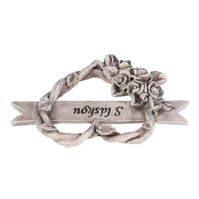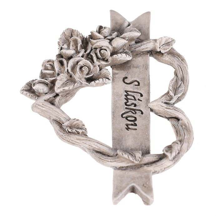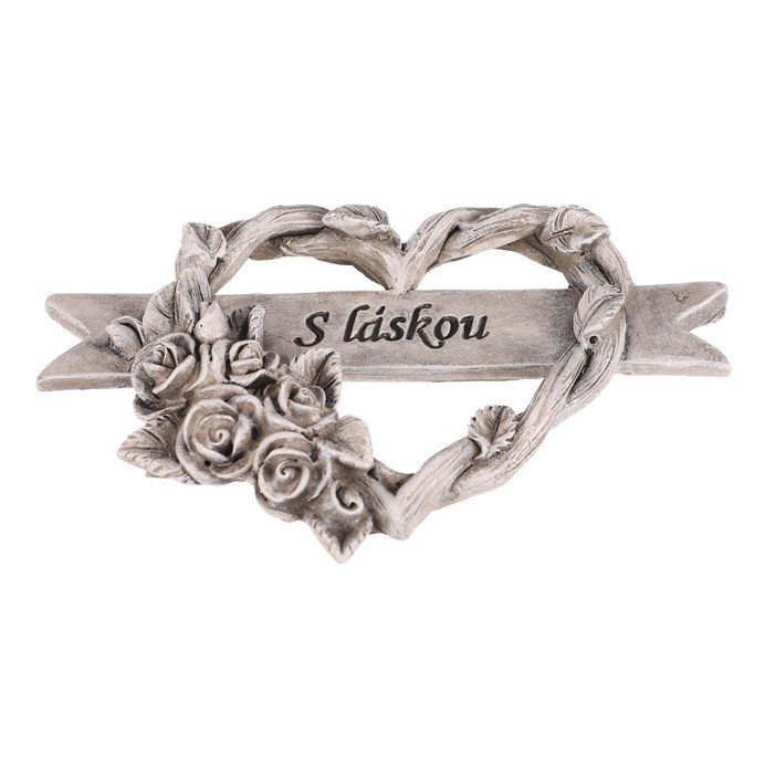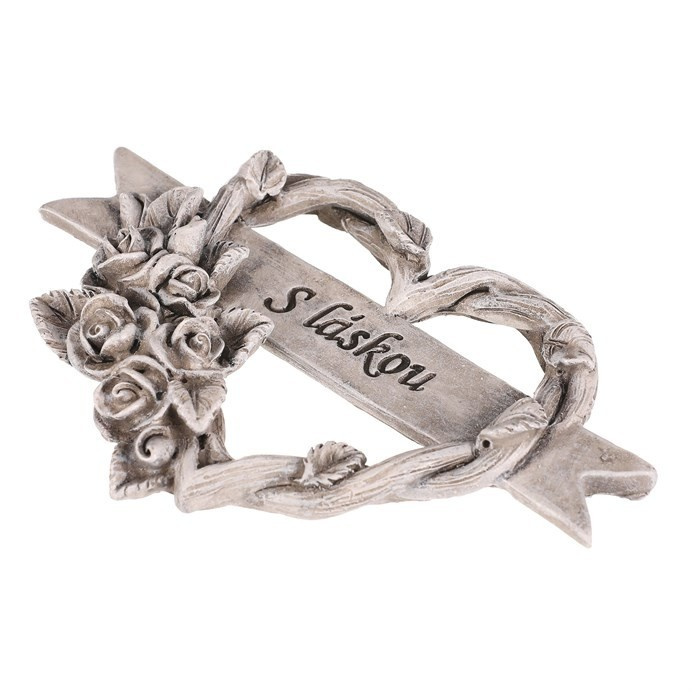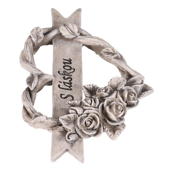 Decentní pietní dekorace v podobě proutí upleteného do tvaru srdce se stuhou a vše doplněné květy růží. Stuha je doplněna nápisem „S láskou“ pro umocnění symbolu úcty a vzpomínky. Šedé provedení a jemné detaily dodávají dekoraci vkusný a důstojný vzhled. Dekorace vyrobena z odolného polyresinu je vhodná pro venkovní pietní a vzpomínková místa.