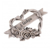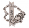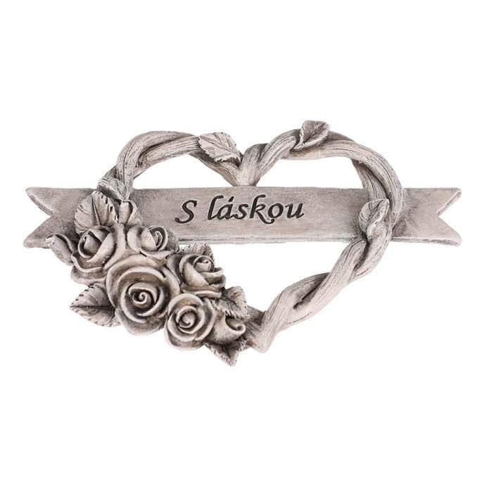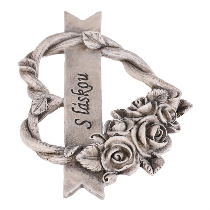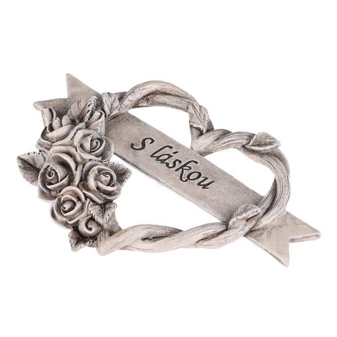 Decentní pietní dekorace v podobě proutí upleteného do tvaru srdce se stuhou a vše doplněné květy růží. Stuha je doplněna nápisem „S láskou“ pro umocnění symbolu úcty a vzpomínky. Šedé provedení a jemné detaily dodávají dekoraci vkusný a důstojný vzhled. Dekorace vyrobena z odolného polyresinu je vhodná pro venkovní pietní a vzpomínková místa.
