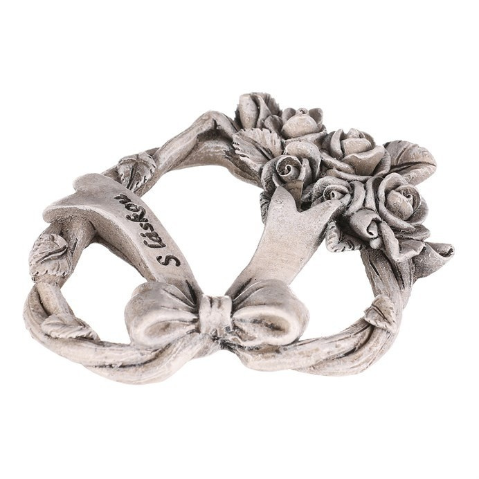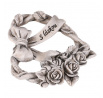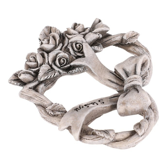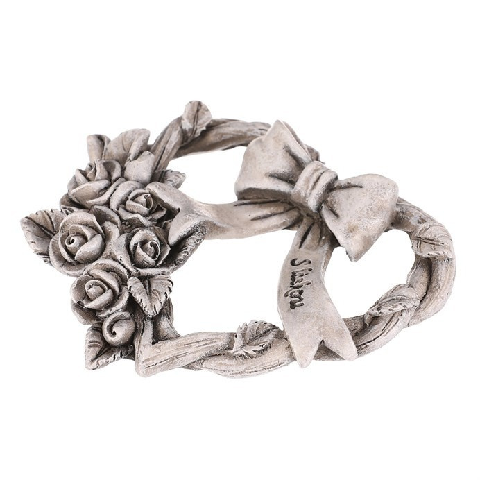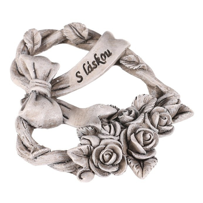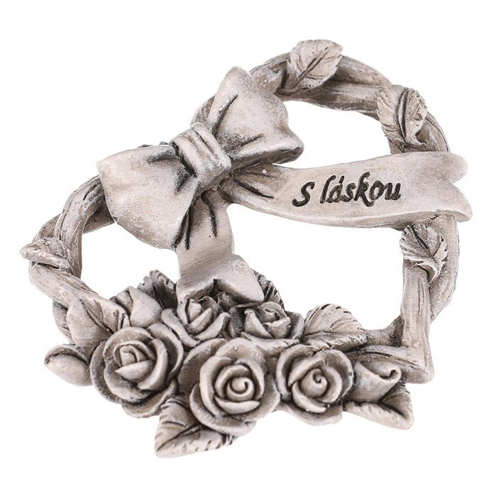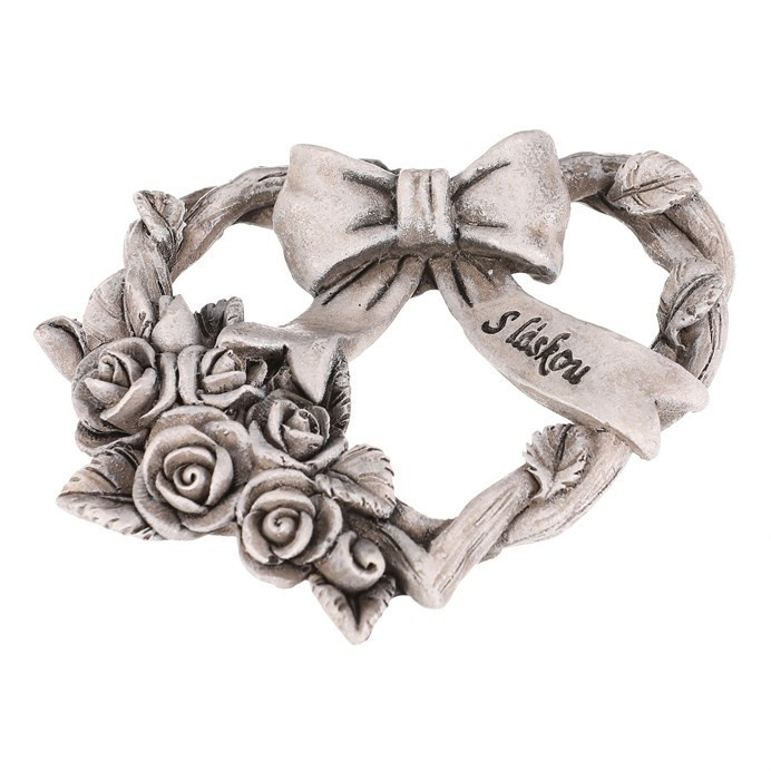 Decentní pietní dekorace v podobě proutí upleteného do tvaru srdce se stuhou a mašlí, to vše doplněné květy růží. Mašle je doplněna nápisem „S láskou“ pro umocnění symbolu úcty a vzpomínky. Šedé provedení a jemné detaily dodávají dekoraci vkusný a důstojný vzhled. Dekorace vyrobena z odolného polyresinu je vhodná pro venkovní pietní a vzpomínková místa.