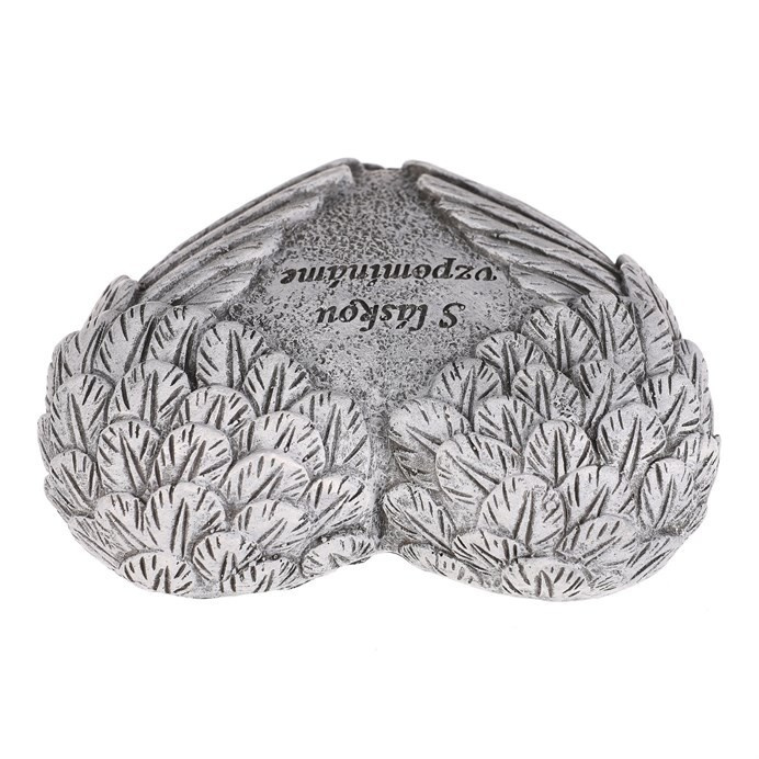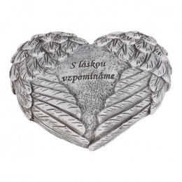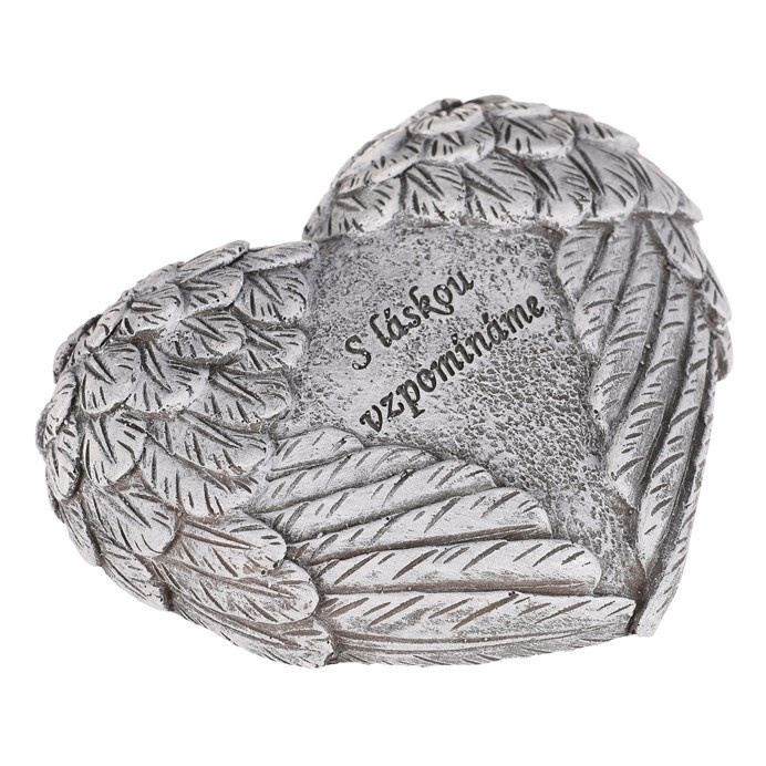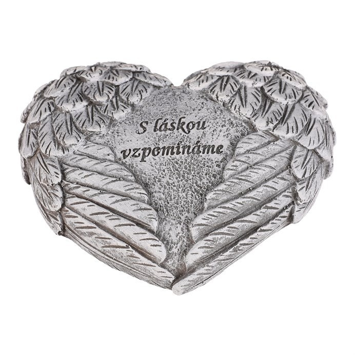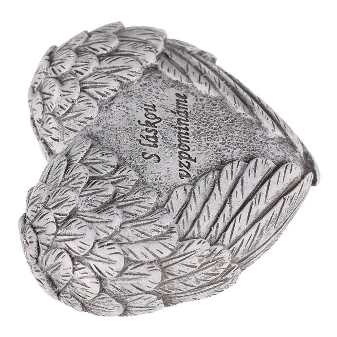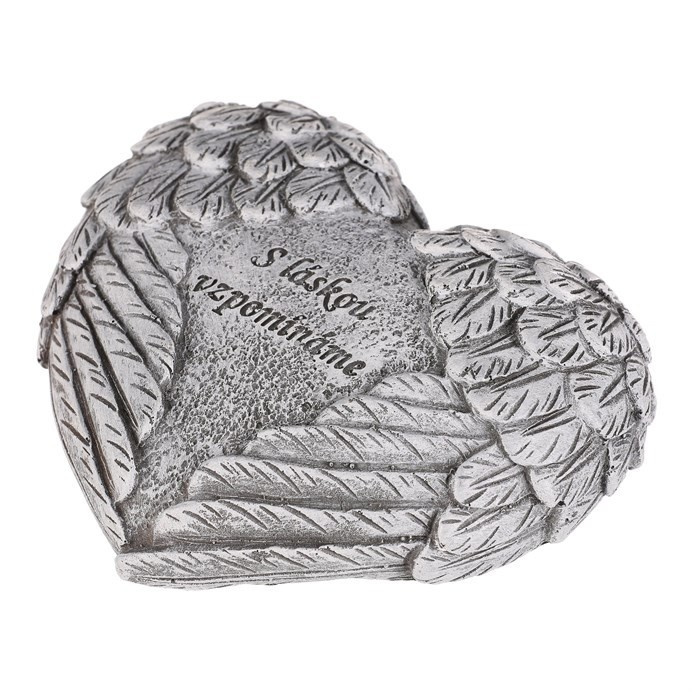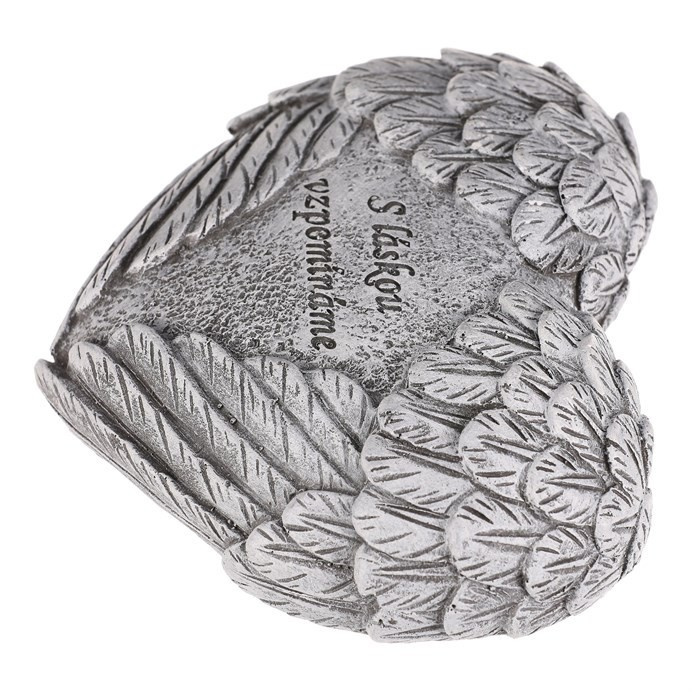 Pietní dekorace ve tvaru srdce s jemně tvarovanými křídly na obou stranách symbolizuje ochranu a věčnou vzpomínku. Uprostřed mezi křídly je nápis „S láskou vzpomínáme“, který vyjadřuje úctu k těm, na které nikdy nezapomeneme. Šedé provedení z polyresinu dodává dekoraci důstojný a neutrální vzhled, vhodný pro taková pietní místa.