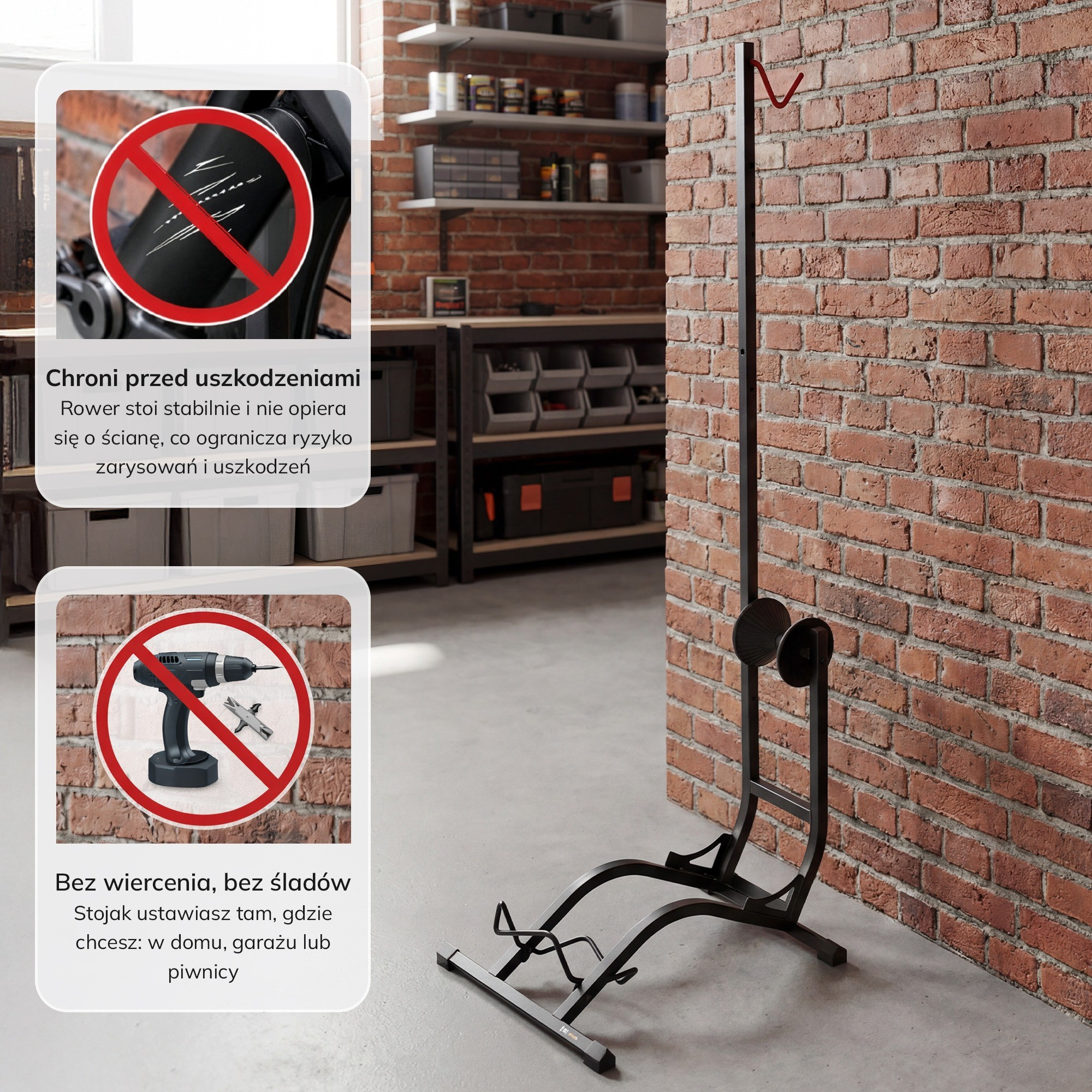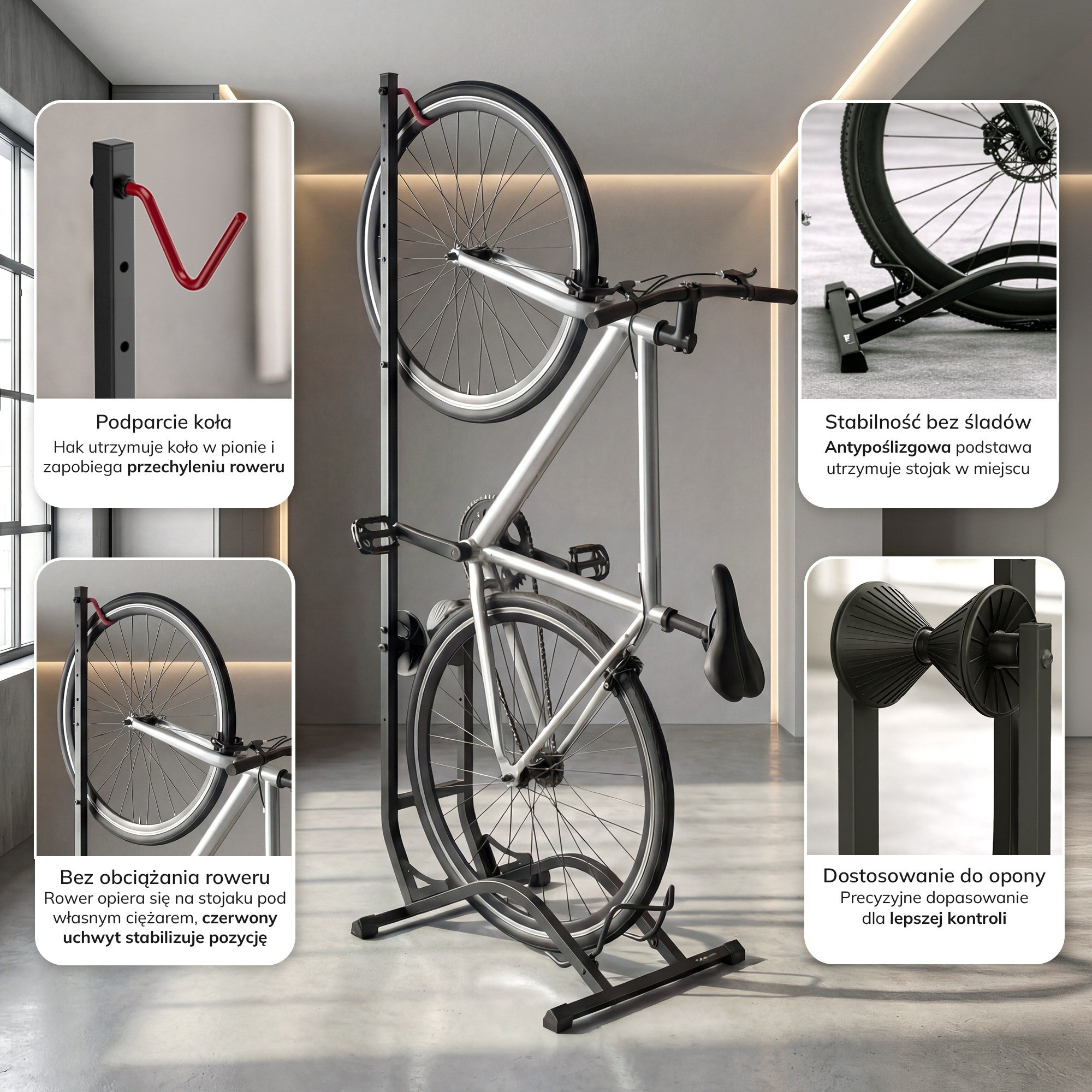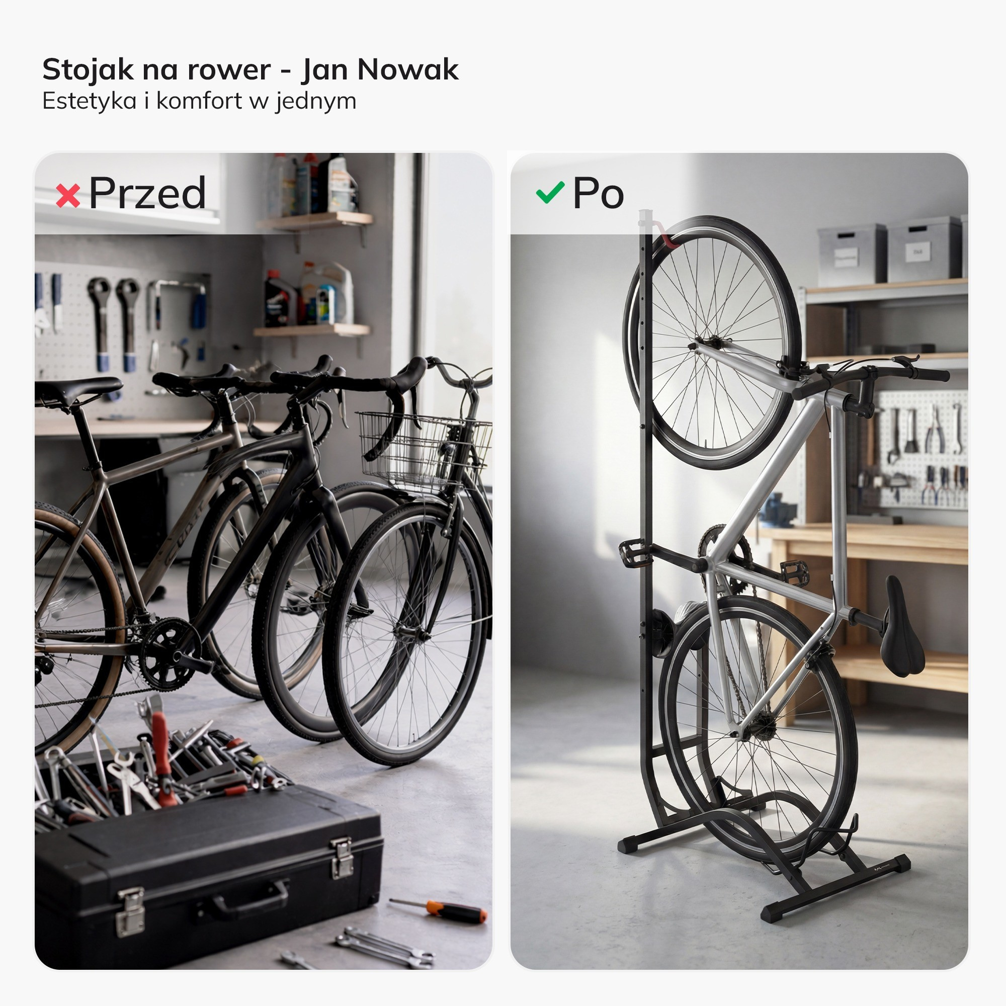 Zapomeňte na nevzhledné opírání kola o zeď, které zanechává šmouhy a hrozí pádem. S naším stojanem získáte nejen pořádek a organizaci, ale také snadný přístup ke svému kolu a jistotu, že se nepoškodí. Je to ideální řešení pro každého, kdo si cení pohodlí, funkčnosti a estetiky.