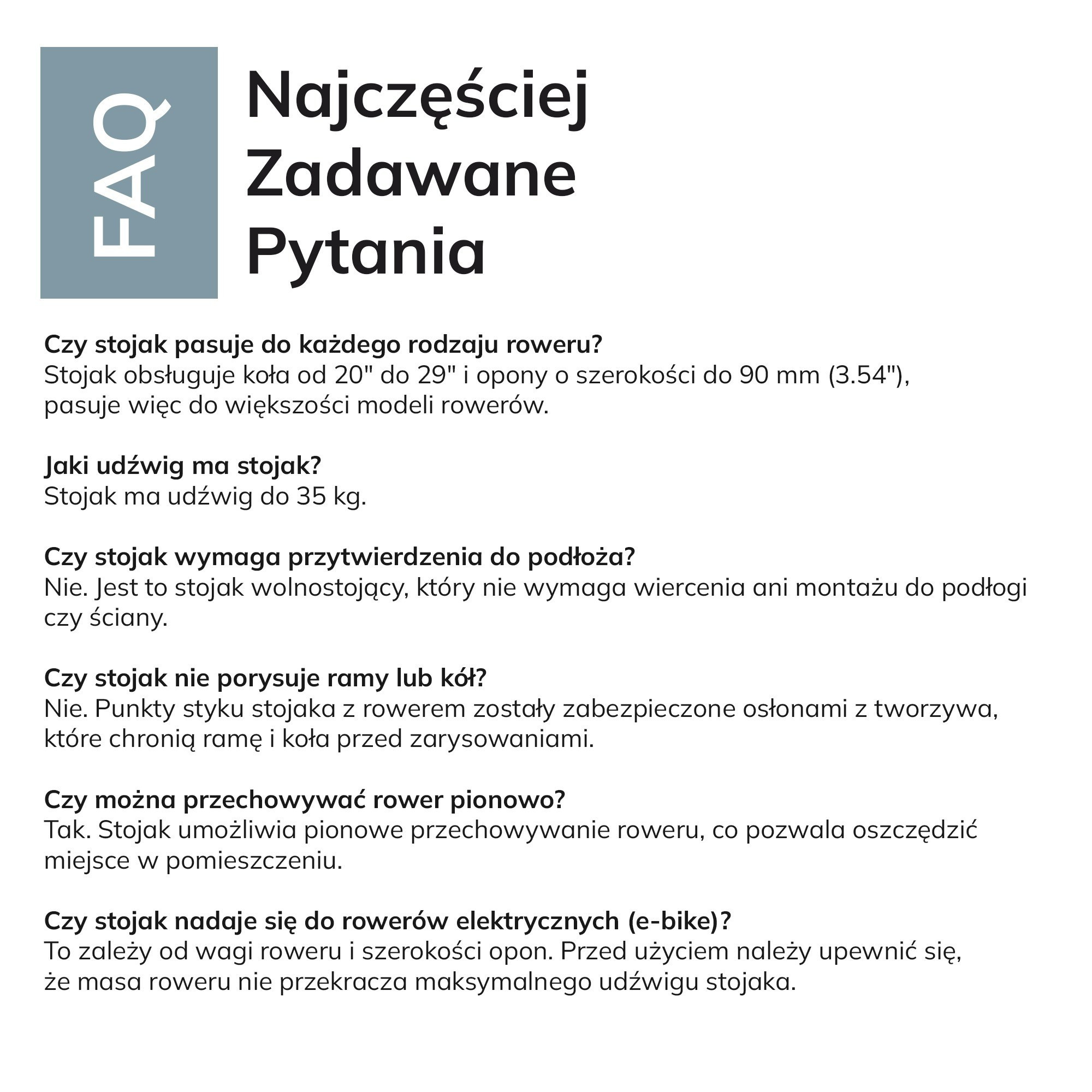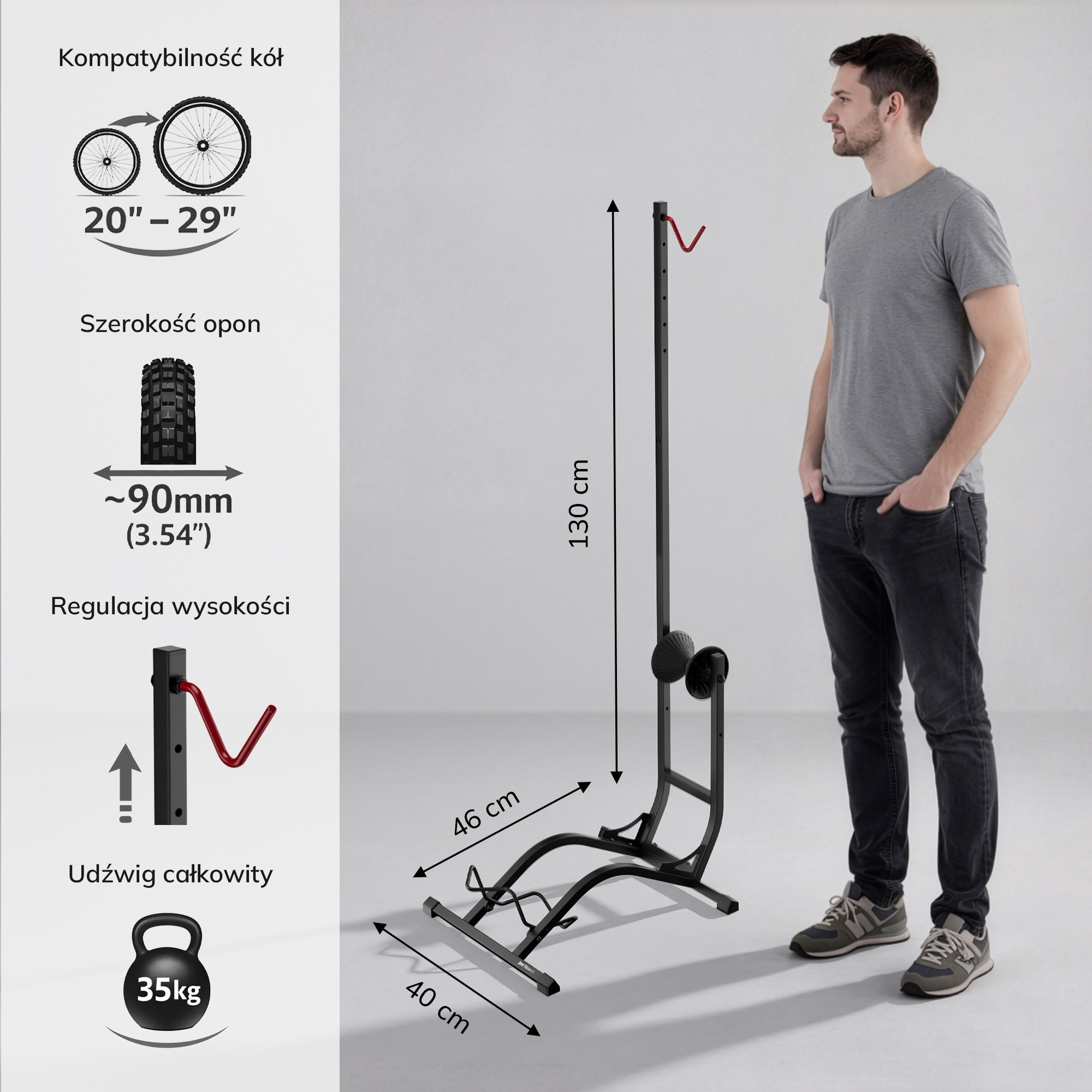 Stojan je navržen tak, aby bez problémů unesl i těžší kola, jako jsou horská kola (MTB) nebo elektrokola. S nosností až 35 kg se nemusíte obávat o bezpečnost vašeho kola.